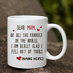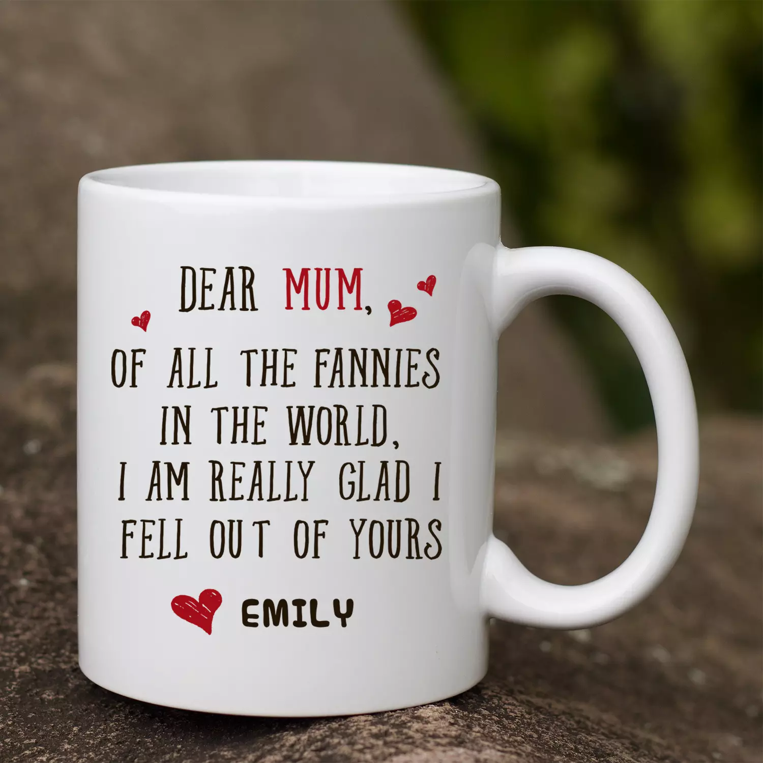 Are you spending too much time to find creative merchandise for you or suitable & special gifts for your mommy, your daddy, your son, your daughter, your children, your friends or someone you love? The struggle is over because we have various Personalized Dear Mum Of All Fannies In The World Coffee Mug – Beer Stein – Water Bottle, Mother’s Day Coffee Mug, Personalized Mum Mug, Dear Mum Of All The Fannies In The World I Am Really Glad I Fell Out Of Yours Mug which will make perfect presents for your beloveds. In order to make your present stand out, we have created lots of unique and awesome customized photo gifts & personalized designs.