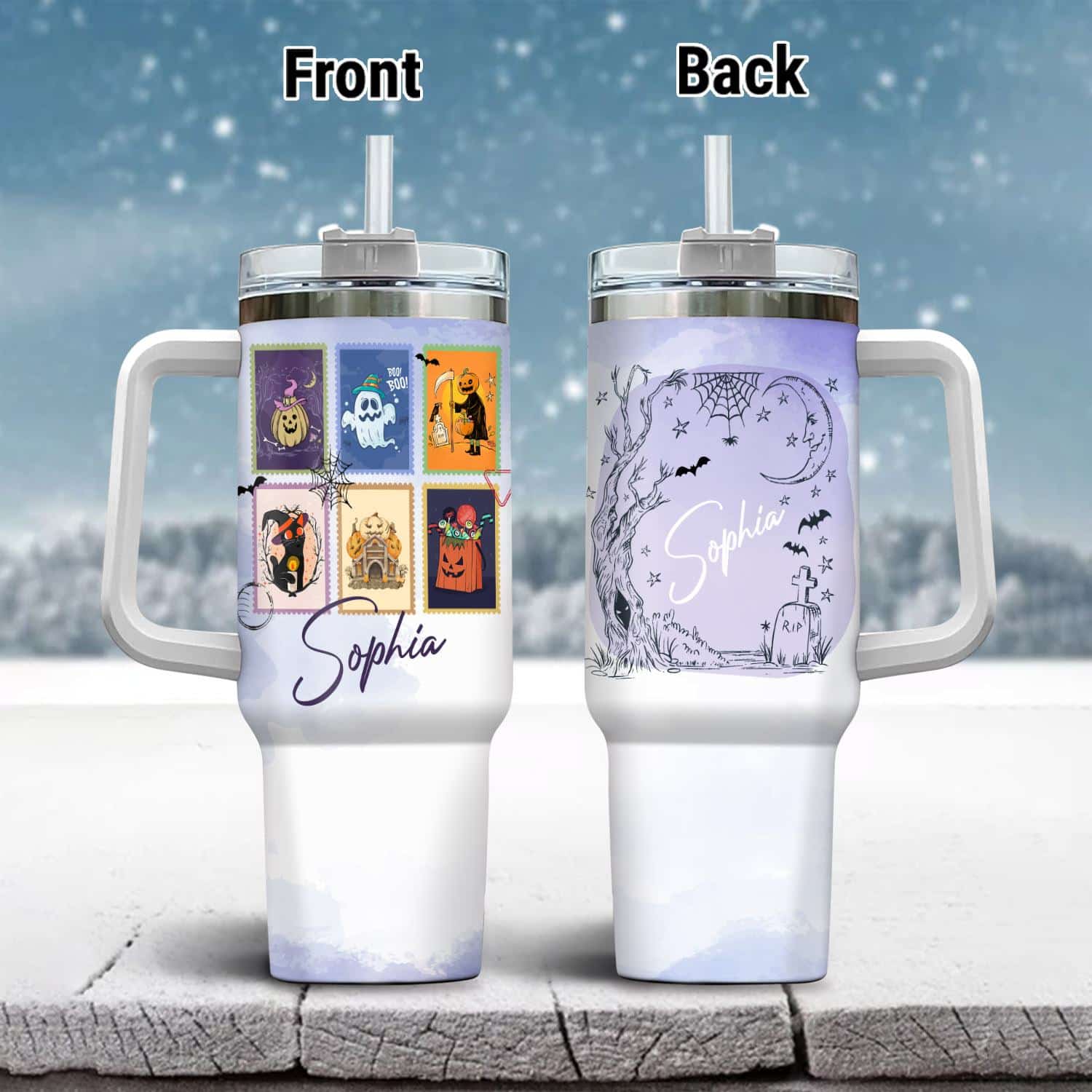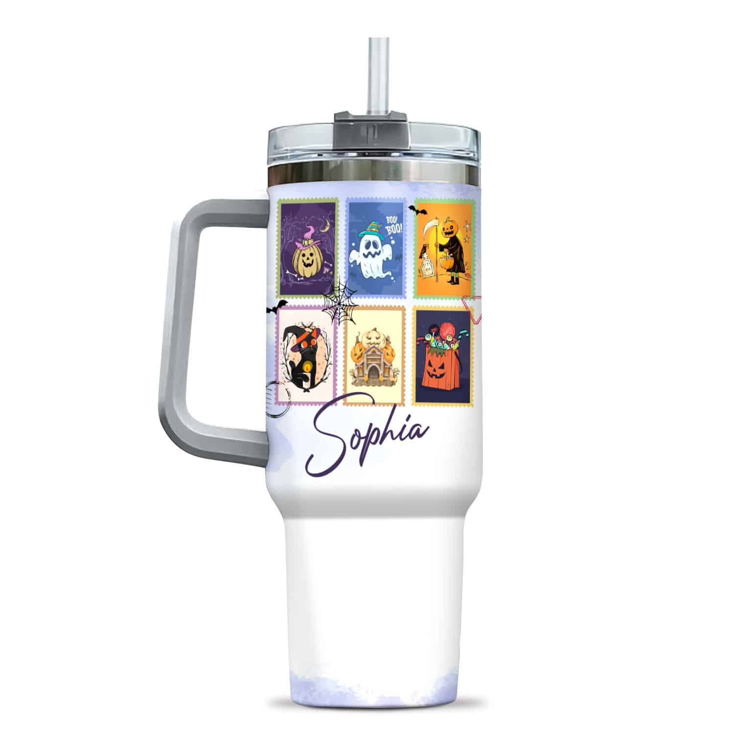 Let’s Shop Personalized Name Halloween Stamps Cute Ghost Pumpkin Cat Fall Insulated Tumbler Cup With Handle and Straw!
