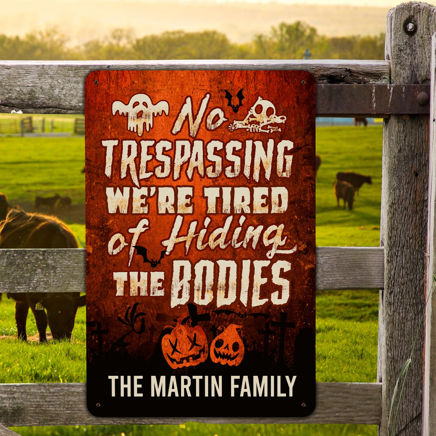 Let’s Shop Personalized Name Saying No Trespassing Halloween Metal Sign – Funny Halloween Meme We’re Tired Of Hiding The Bodies Metal Sign!