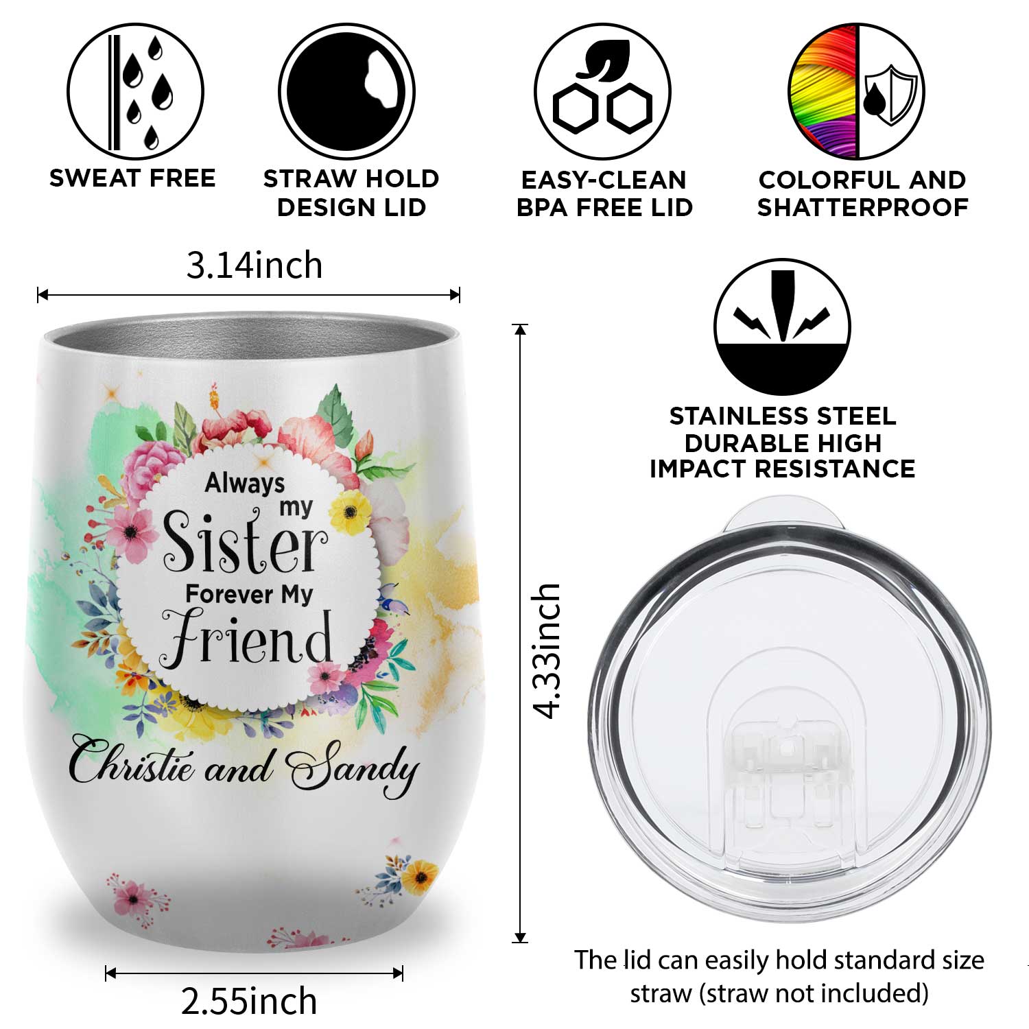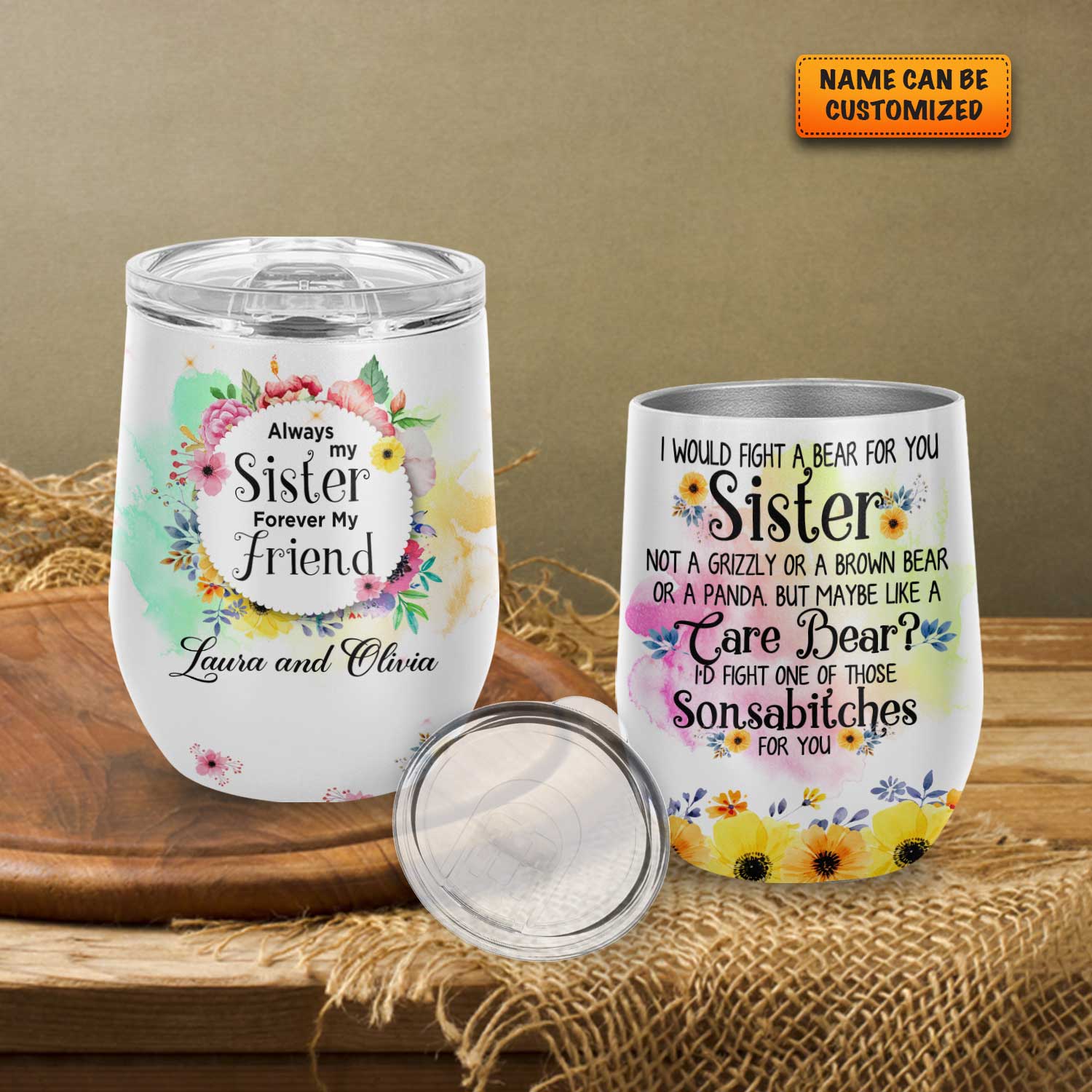 Let’s Shop Personalized Name Tumbler Gifts for Sister – Always My Sister Forever My Friend Floral Insulated Wine Tumbler Cup with Lid, Sister Coffee Mug!