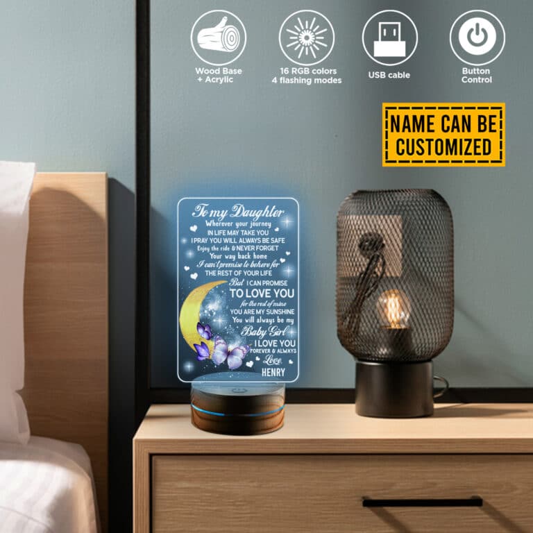 At CubeBik, besides 2D Night Light, we also offer tees, hoodies, sweaters, raglans, tanks, wall arts, canvases, posters, mugs, blankets, engraved jewelry, personalized necklaces, printed face masks, throw pillows, tote bags, hats, accessories and more on our website, so do not miss our other To My Daughter Wherever Your Journey, to My Daughter Gifts from Mom, to My Daughter Love Mom, Daughter Night Light from Mom, Daughter Butterfly Gifts, Letters to My Daughter, to My Daughter Decor Gifts, I Love You My Daughter, Butterfly Night Light related merchandise. Moreover, all the products are made-to-order and one of a kind custom designs you can’t get elsewhere in normal stores. Let’s discover CubeBik.com now and find your favorite personalized items. We can’t wait to surprise and build beautiful memories with you and your loved ones.