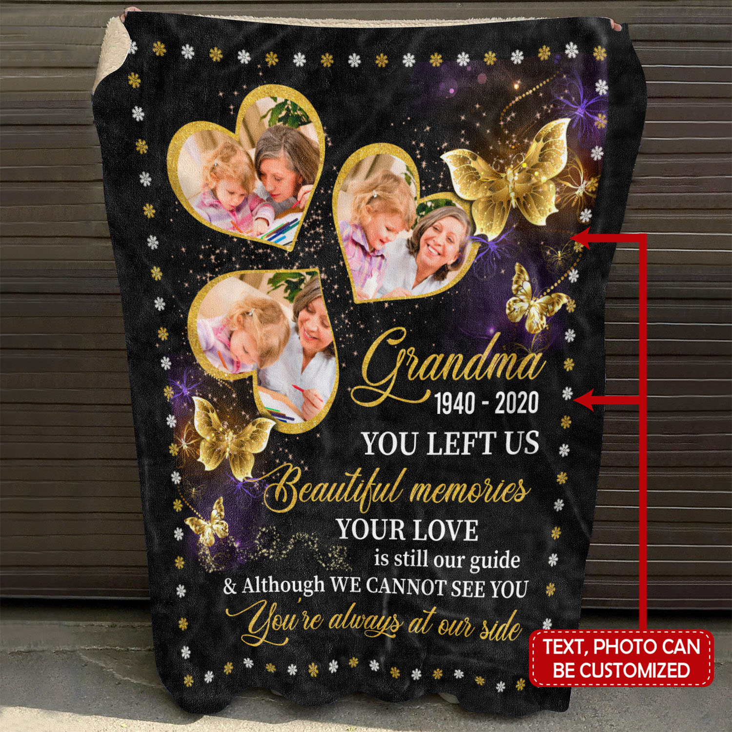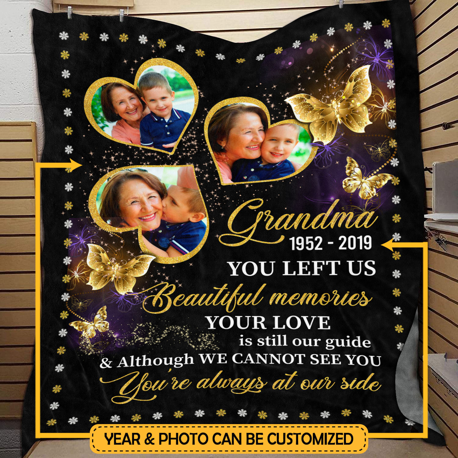 Are you spending too much time to find creative merchandise for you or suitable & special gifts for your mommy, your daddy, your son, your daughter, your children, your friends or someone you love? The struggle is over because we have various Personalized Photo Grandma You’re Always at Our Side Blanket, Missing Grandma in Heaven Blanket, as I Sit in Heaven and Watch You Everyday Blanket, Grandma Memorial Photo Canvas, Memorial Poster, Memorial Photo Poster, Memorial Personalized Blanket, Missing Grandma Butterfly Blanket which will make perfect presents for your beloveds. In order to make your present stand out, we have created lots of unique and awesome customized photo gifts & personalized designs.