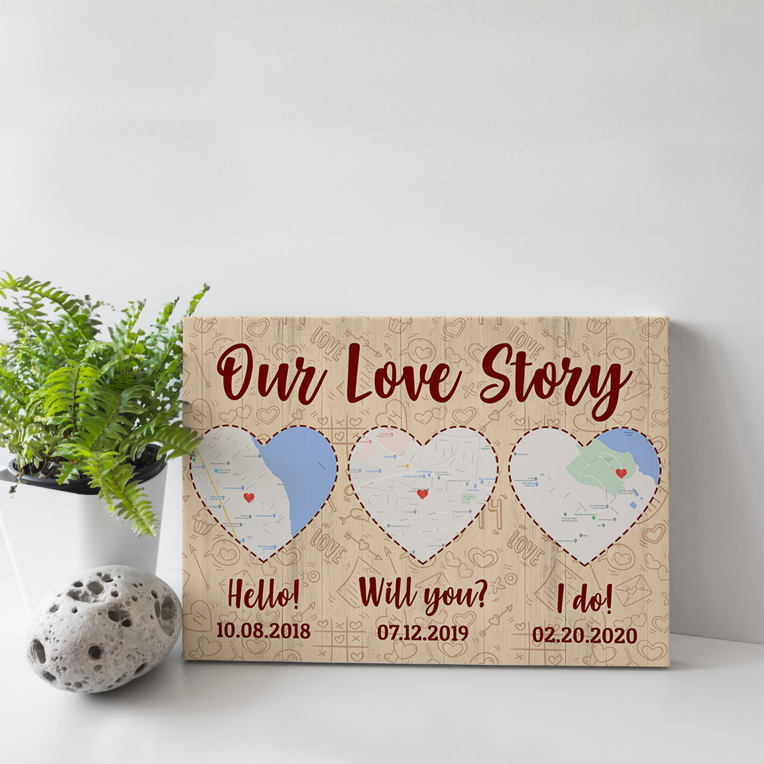 At CubeBik, besides canvases, we also offer tees, hoodies, sweaters, raglans, tanks, wall arts, custom apparelwish, posters, mugs, blankets, engraved jewelry, personalized necklaces, printed face masks, throw pillows, tote bags, hats, accessories and more on our website, so do not miss our other Our Love Story Journal Sign, Map Hearts, Anniversary 5 Year Gift, Custom Our Love Story, First We Had Each Other, Map Heart Art, Special Dates Sign, Love Story Dates Sign, Relationship Timeline, Map Hearts, Hello Will You I Do, Anniversary Gifts for Him, Anniversary Gift for Her, Anniversary Gift for Parents, Anniversary 2 Years Gift, Anniversary Husband Gifts, Anniversary Gift for Wife, Anniversary Decorations, Personalized Canvas with Photo, Personalized Photo Poster, Personalized Image, Custom Photo Wall Art, Custom Canvas with Photos, Custom Photo Gifts, Custom Photo Prints related merchandise. Moreover, all the products are made-to-order and one of a kind custom designs you can’t get elsewhere in normal stores. Let’s discover CubeBik.com now and find your favorite personalized items. We can’t wait to surprise and build beautiful memories with you and your loved ones.