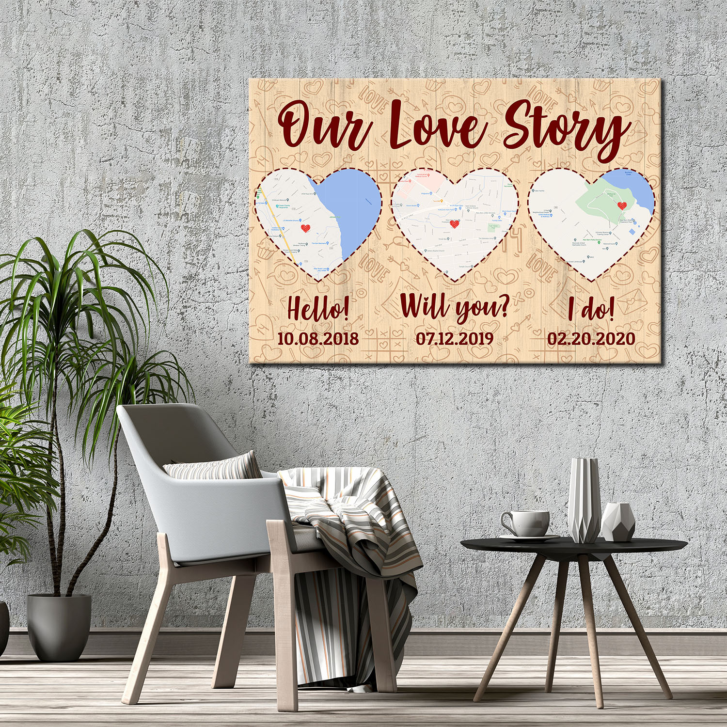 Let’s Shop Personalized Photo Our Love Story Journal Map Hearts Anniversary 5 Year Gift Framed Canvas – Unframed Poster!