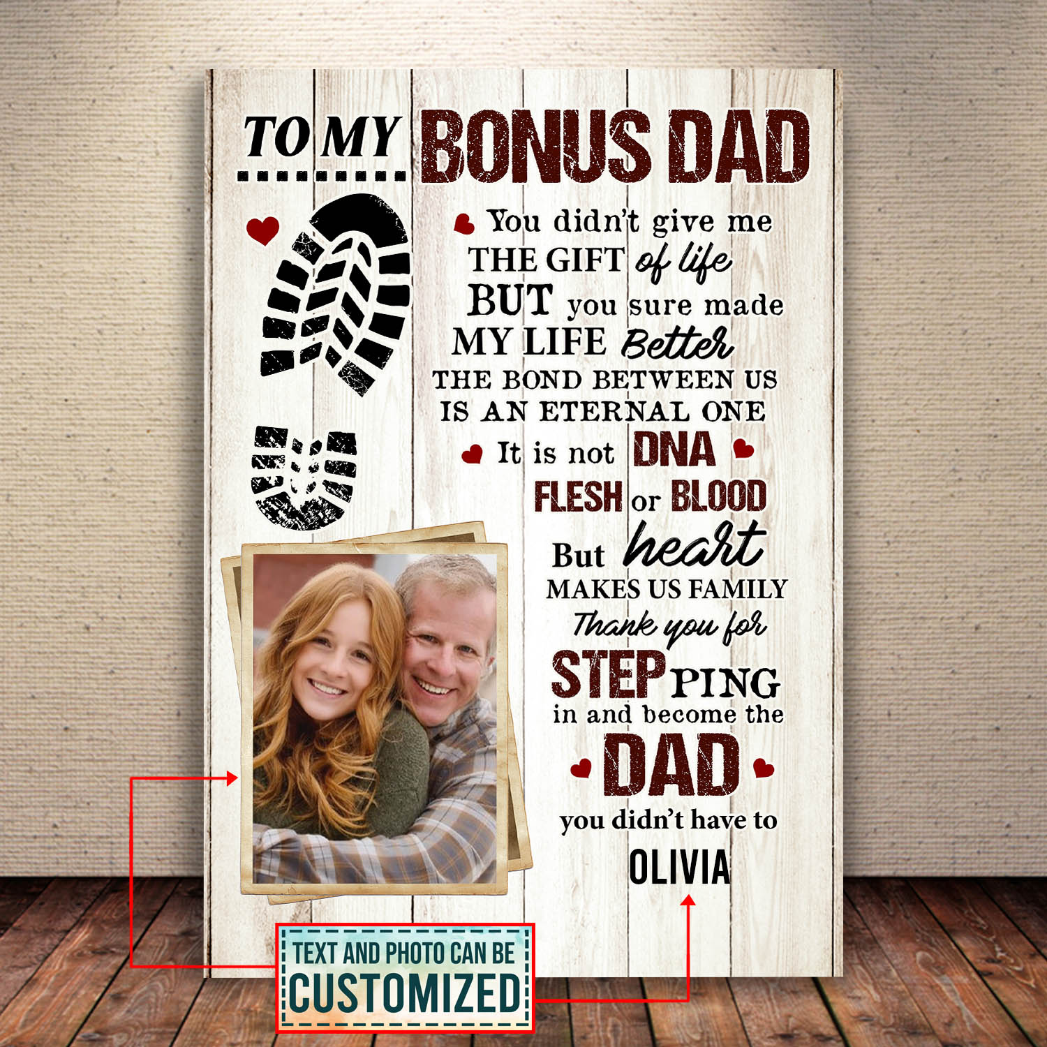 Are you spending too much time to find creative merchandise for you or suitable & special gifts for your mommy, your daddy, your son, your daughter, your children, your friends or someone you love? The struggle is over because we have various Bonus Dad Photo Frame, Step Dad Photo Frame, Bonus Dad Canvas, Step Dad Wall Canvas, Step Dad Canvas, Step Dad Poster, to My Step Dad Poster, Step Dad Wall Art, Step Dad Wall Decor, Bonus Dad Poster, Bonus Dad Gifts Personalized, Personalized Bonus Dad Day Gifts for Dad which will make perfect presents for your beloveds. In order to make your present stand out, we have created lots of unique and awesome customized photo gifts & personalized designs.