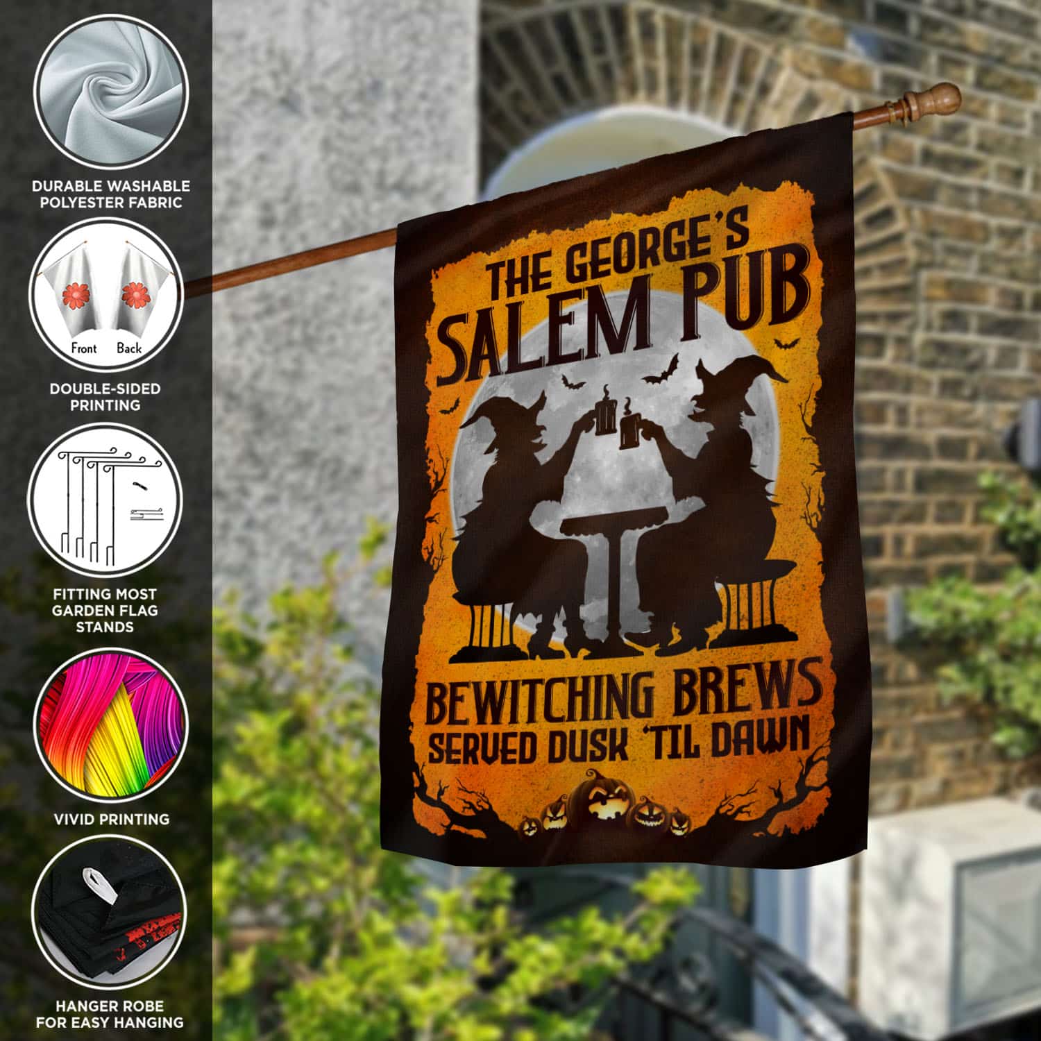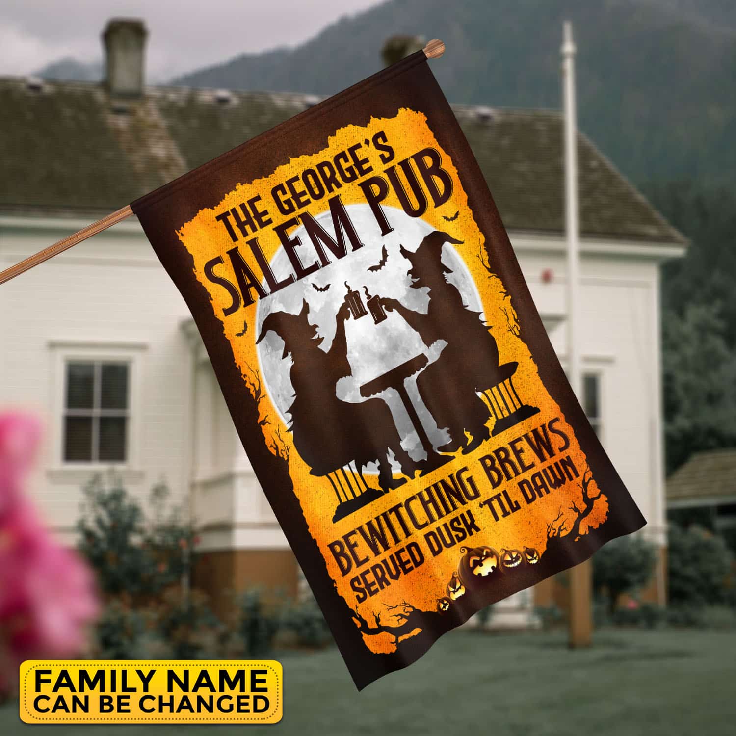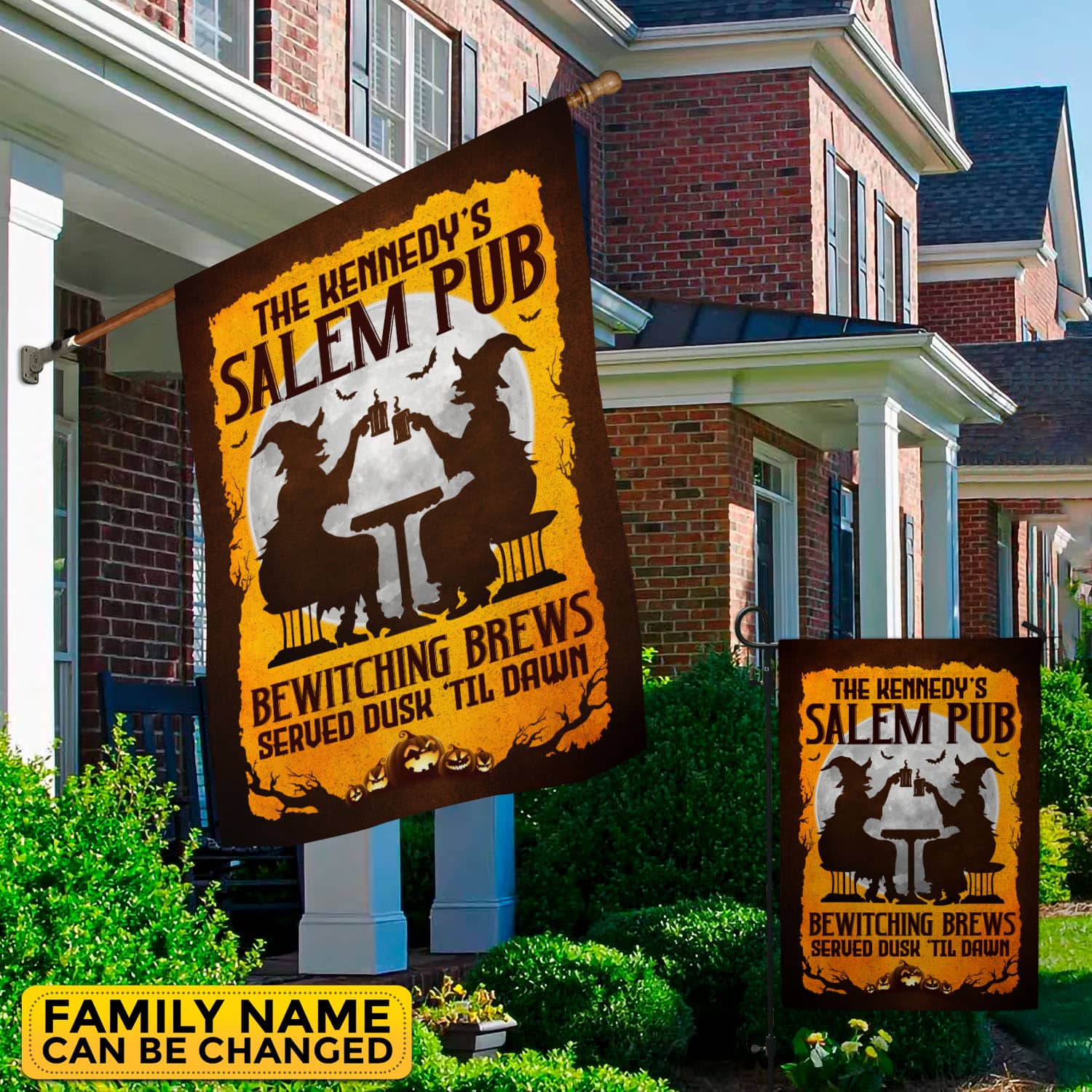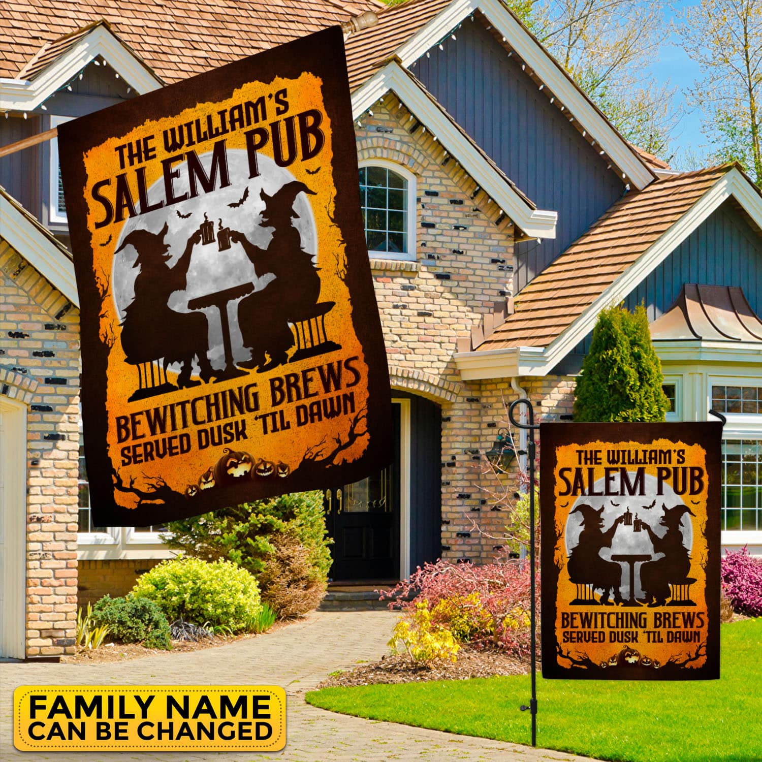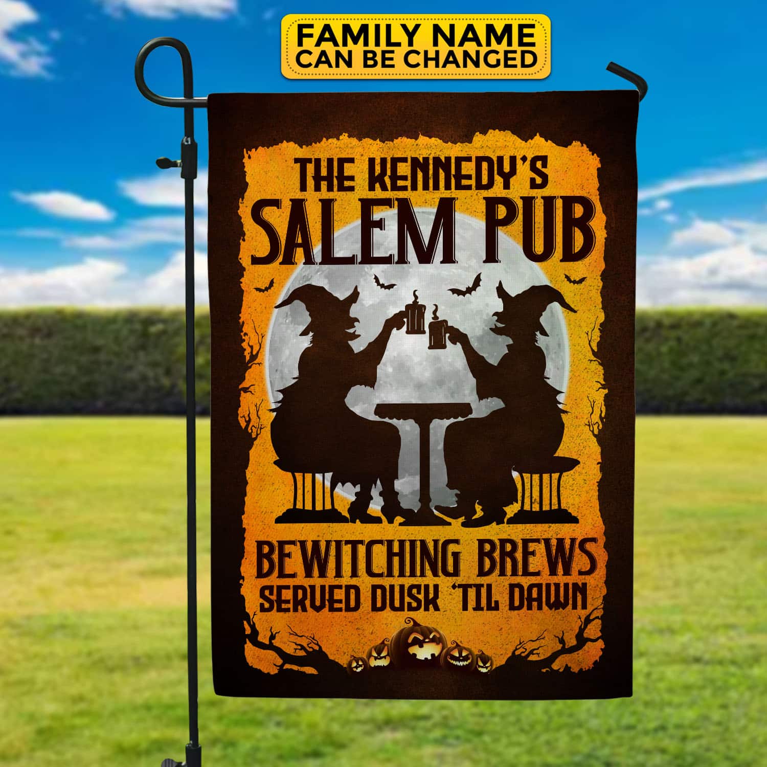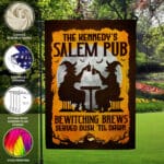 Let’s Shop Personalized Salem Pub Bewitching Brews Served Dusk Til Dawn Witch Halloween Outdoor House Flag – Garden Flag!