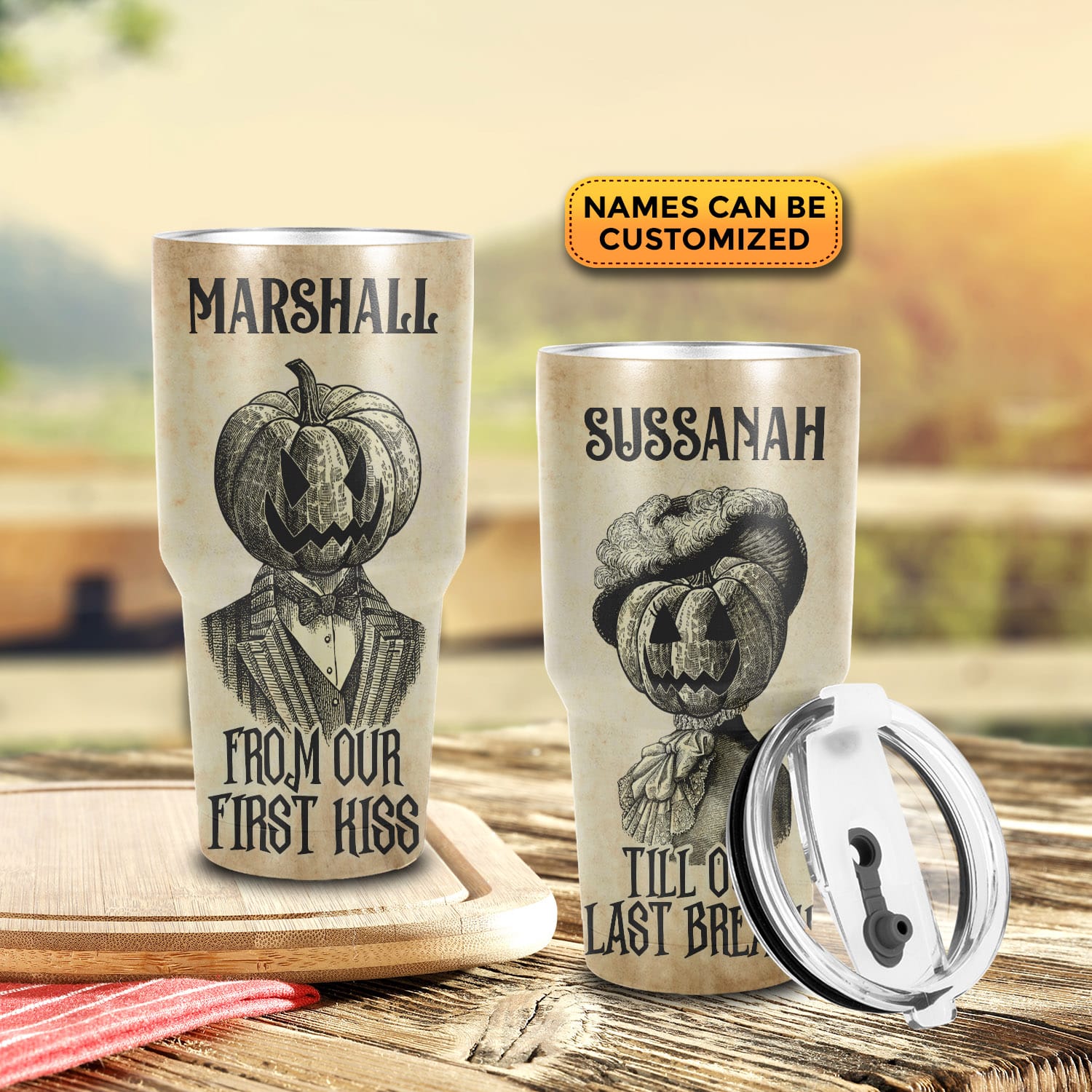 Let’s Shop Personalized Skull Pumpkin Couple From Out First Kiss Insulated Tumbler Cup With Lid!