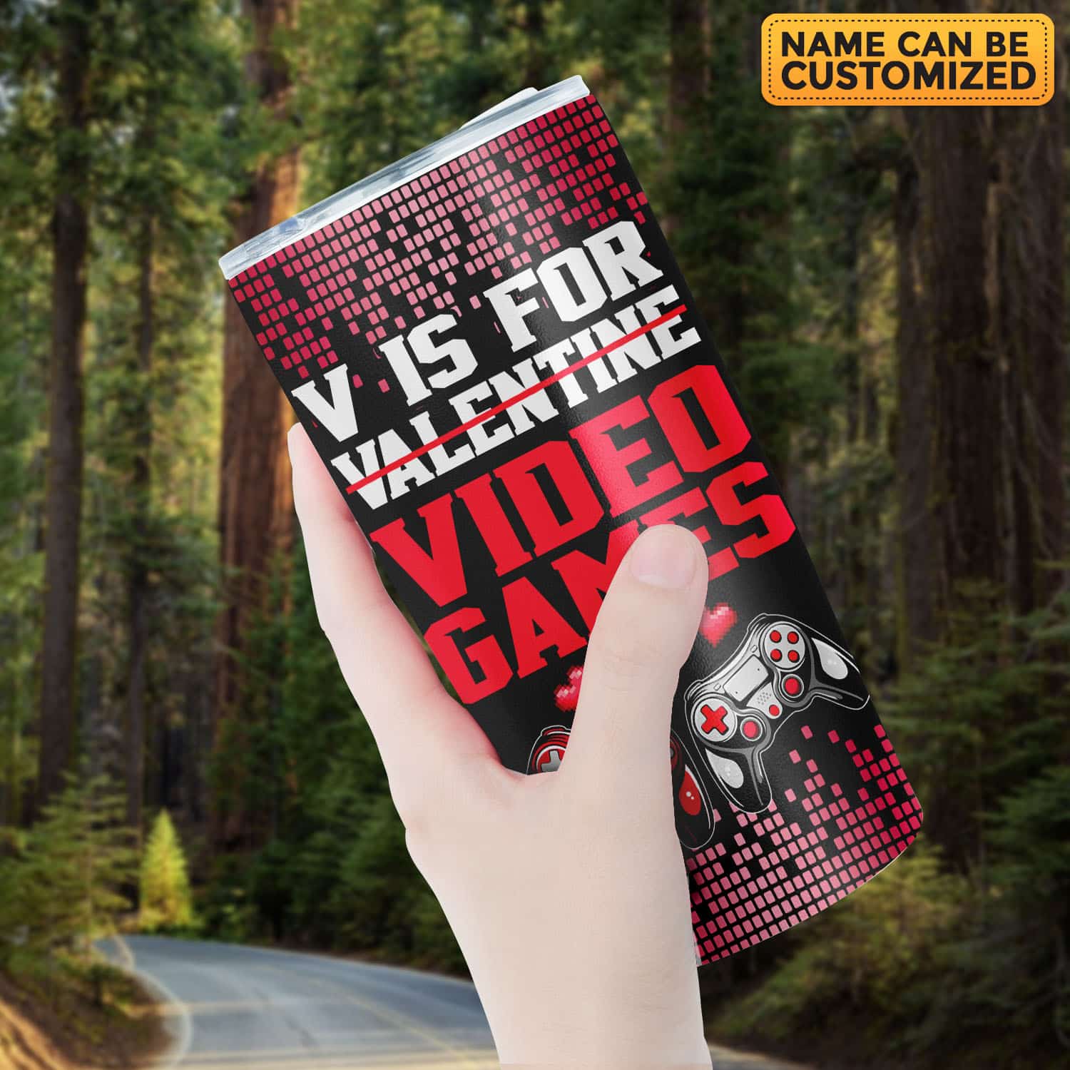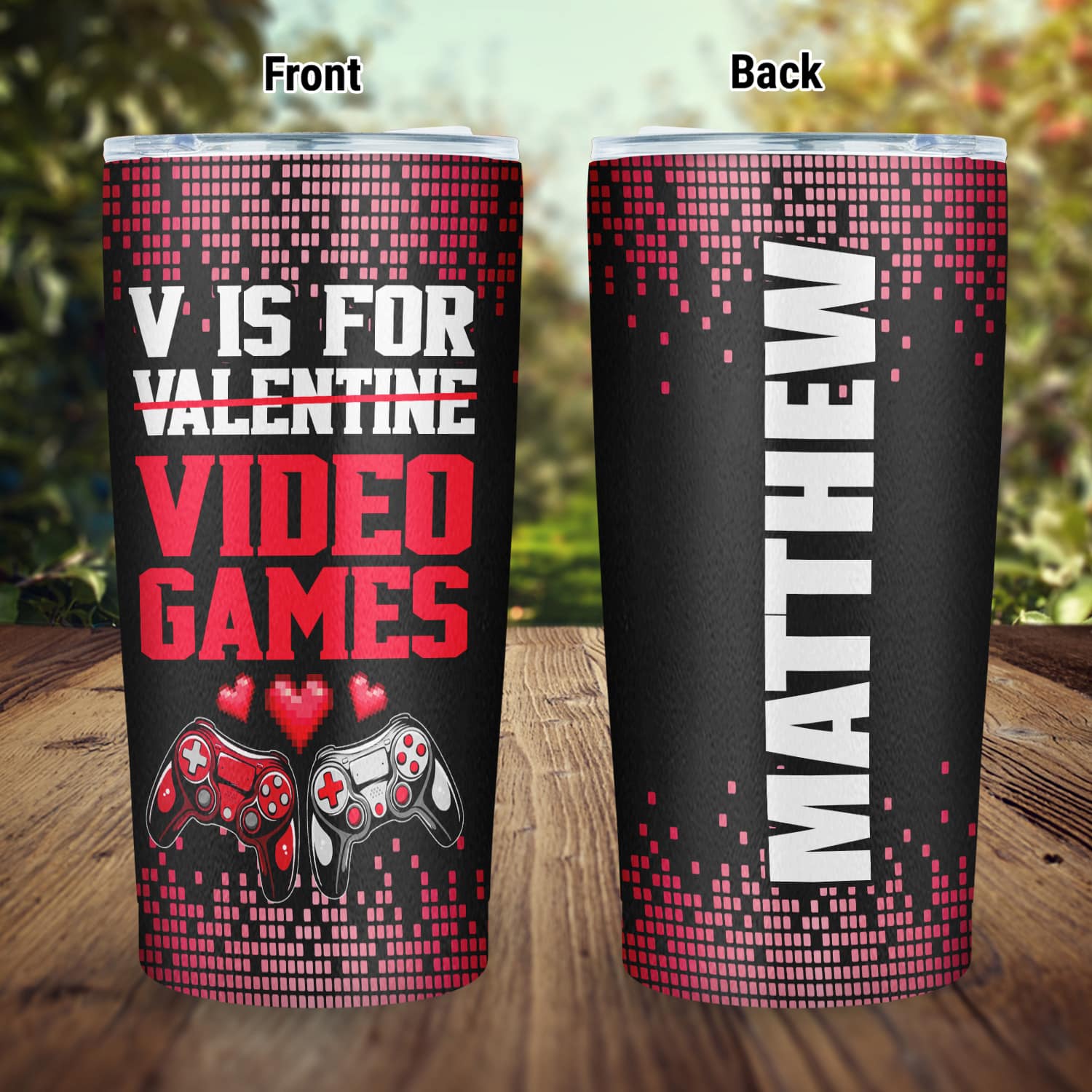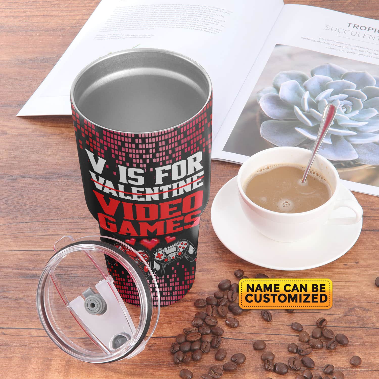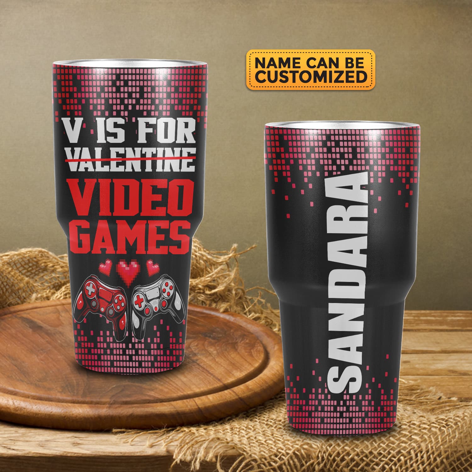 Let’s Shop Personalized V Is For Video Games Insulated Tumbler Cup With Lid and Straw – Funny Valentine Gifts For Gamers!