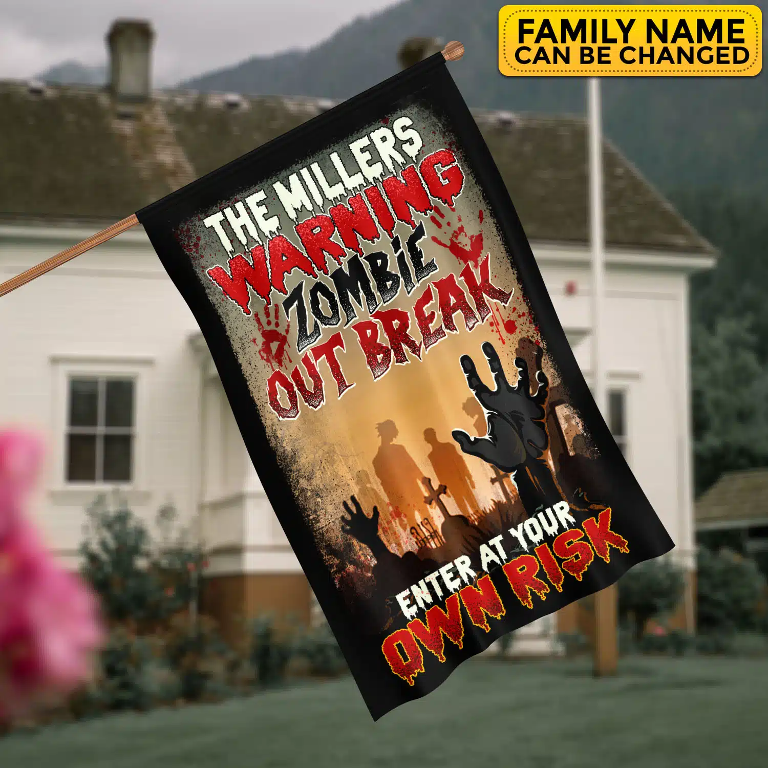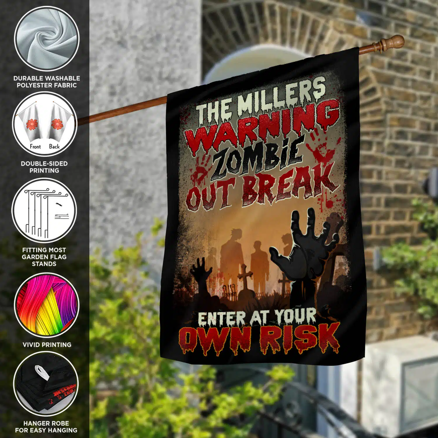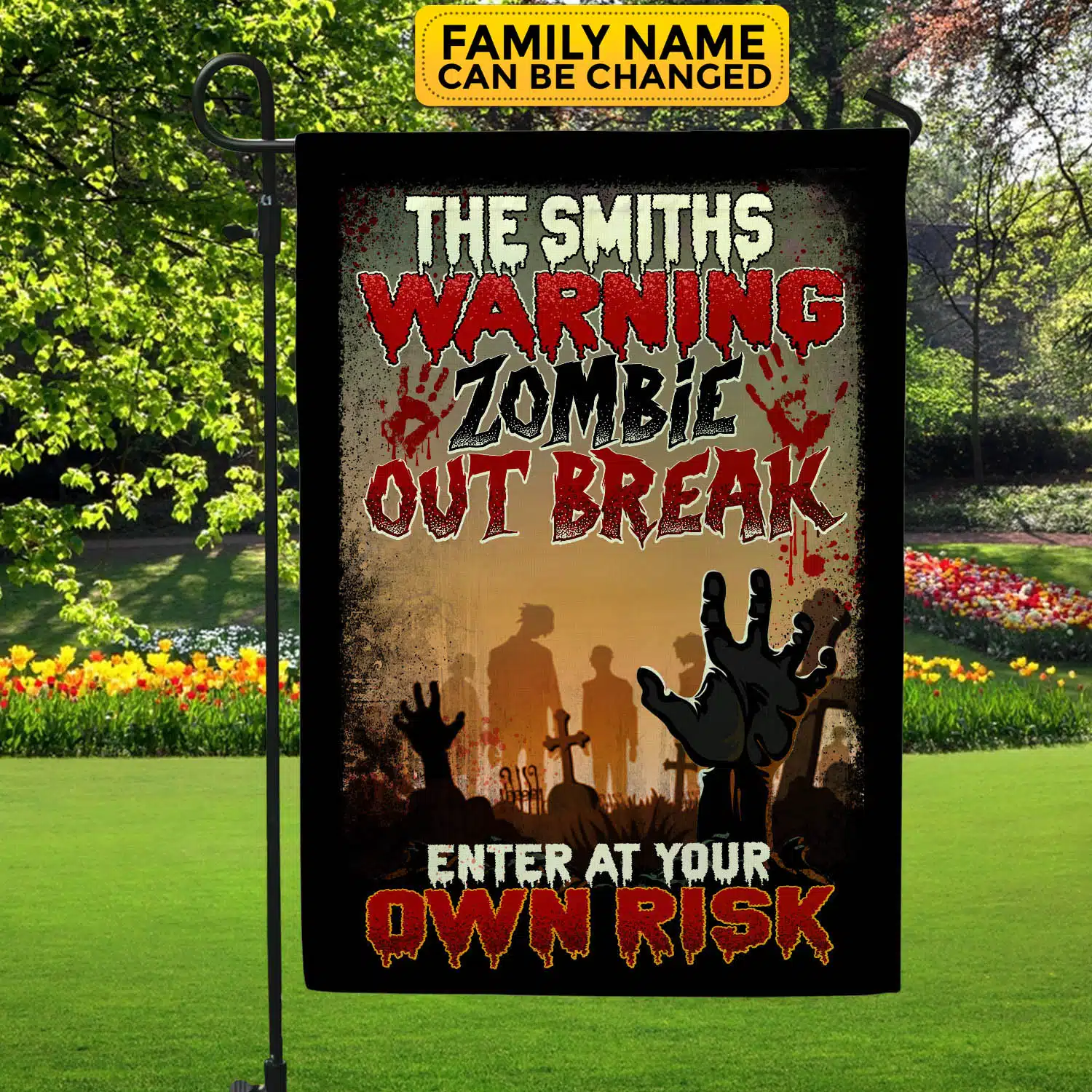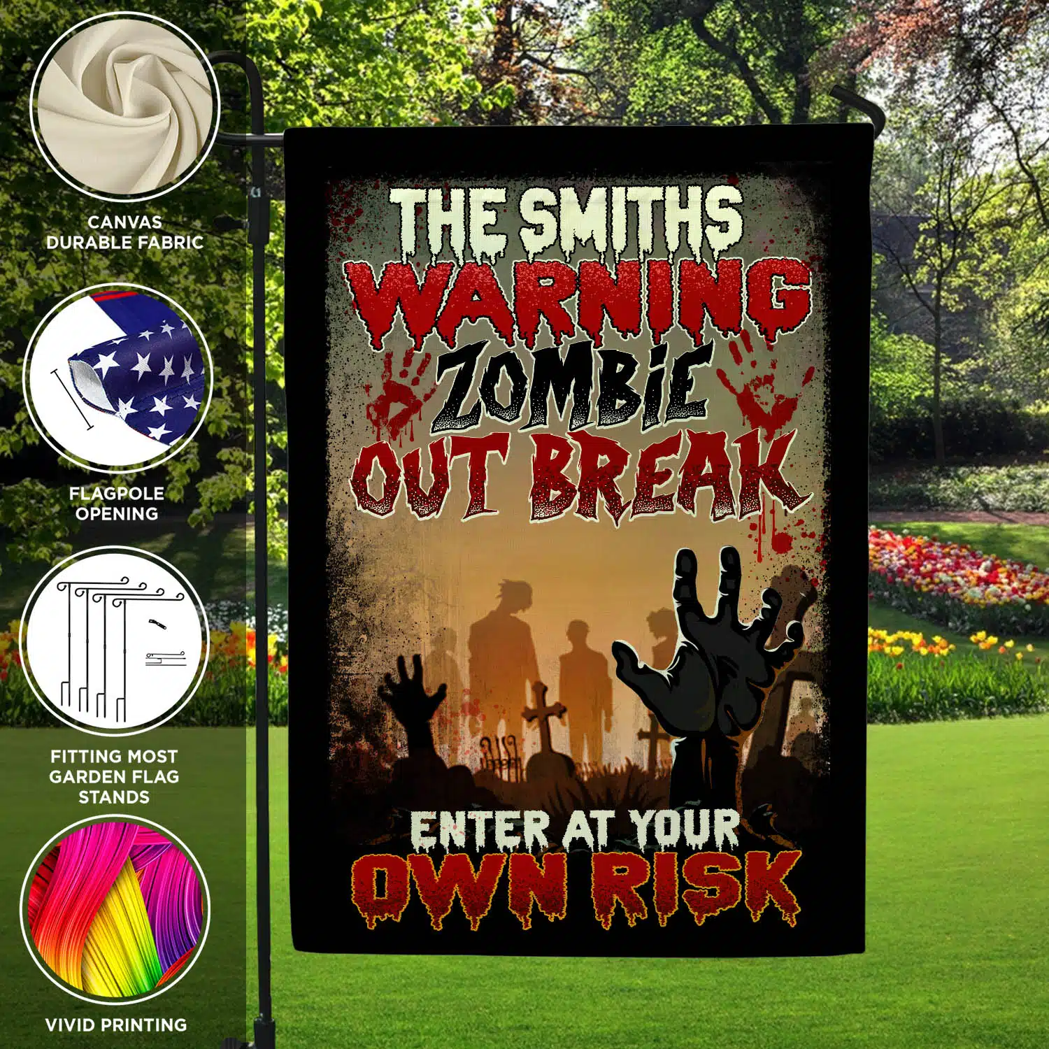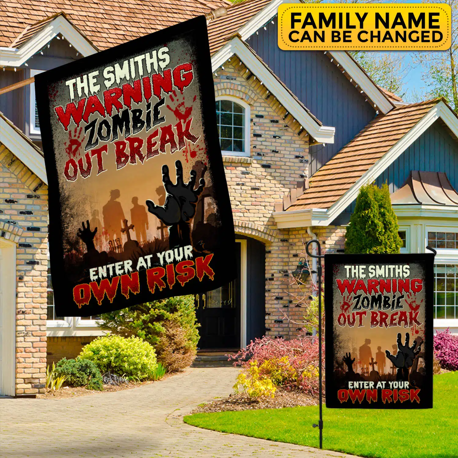 Let’s Shop Personalized Warning Zombie Out Break Enter At Your Own Risk Funny Halloween Outdoor House Flag – Home Garden Flag!