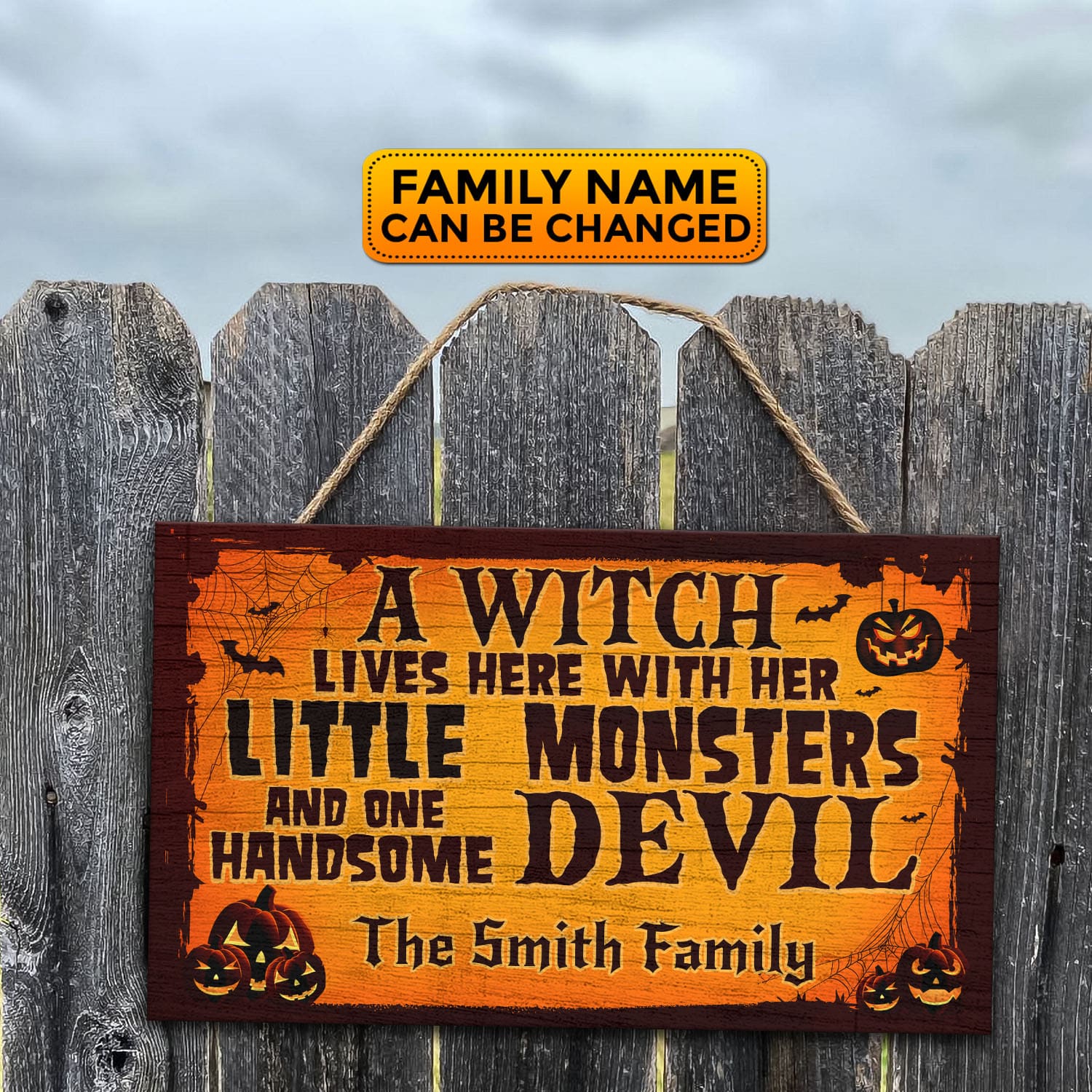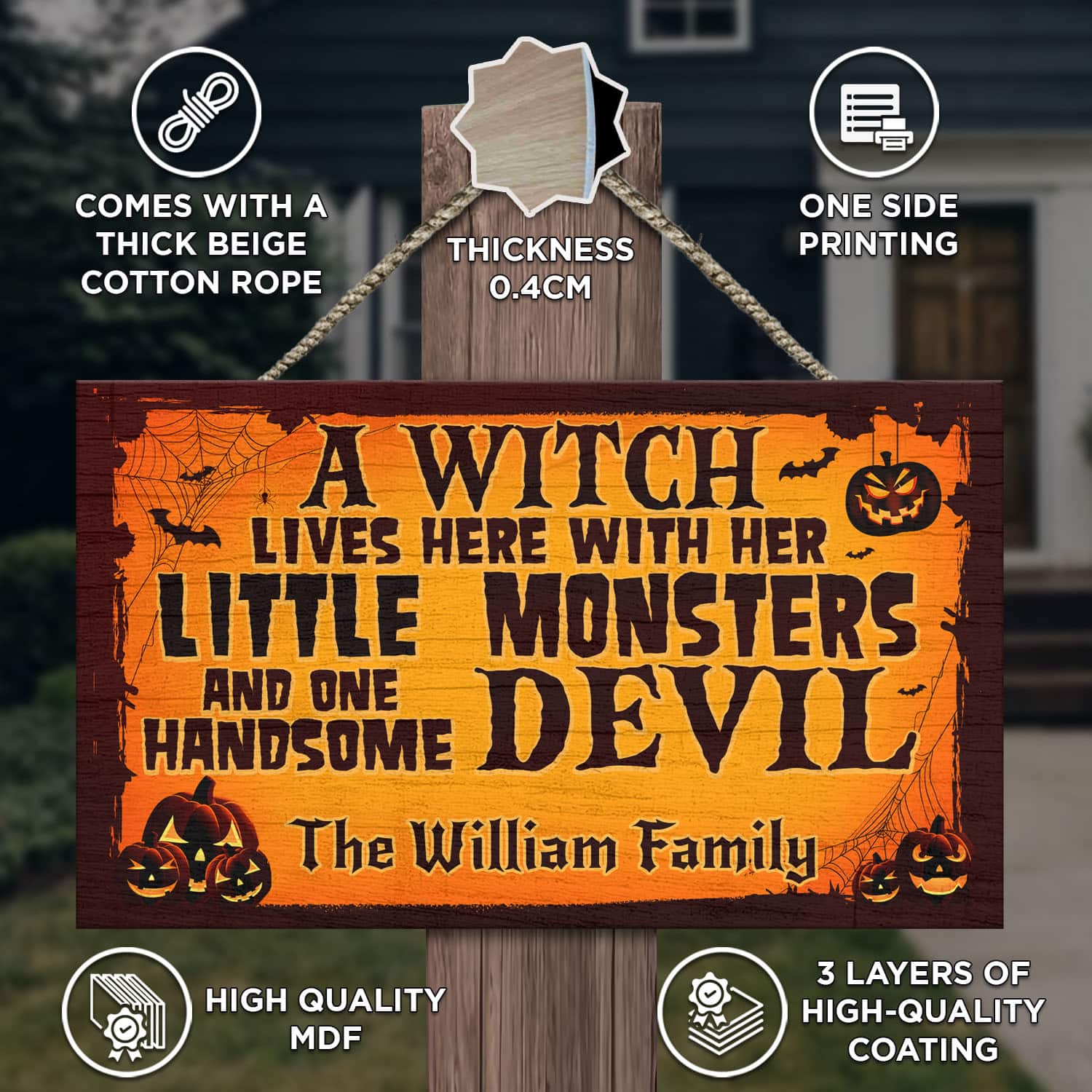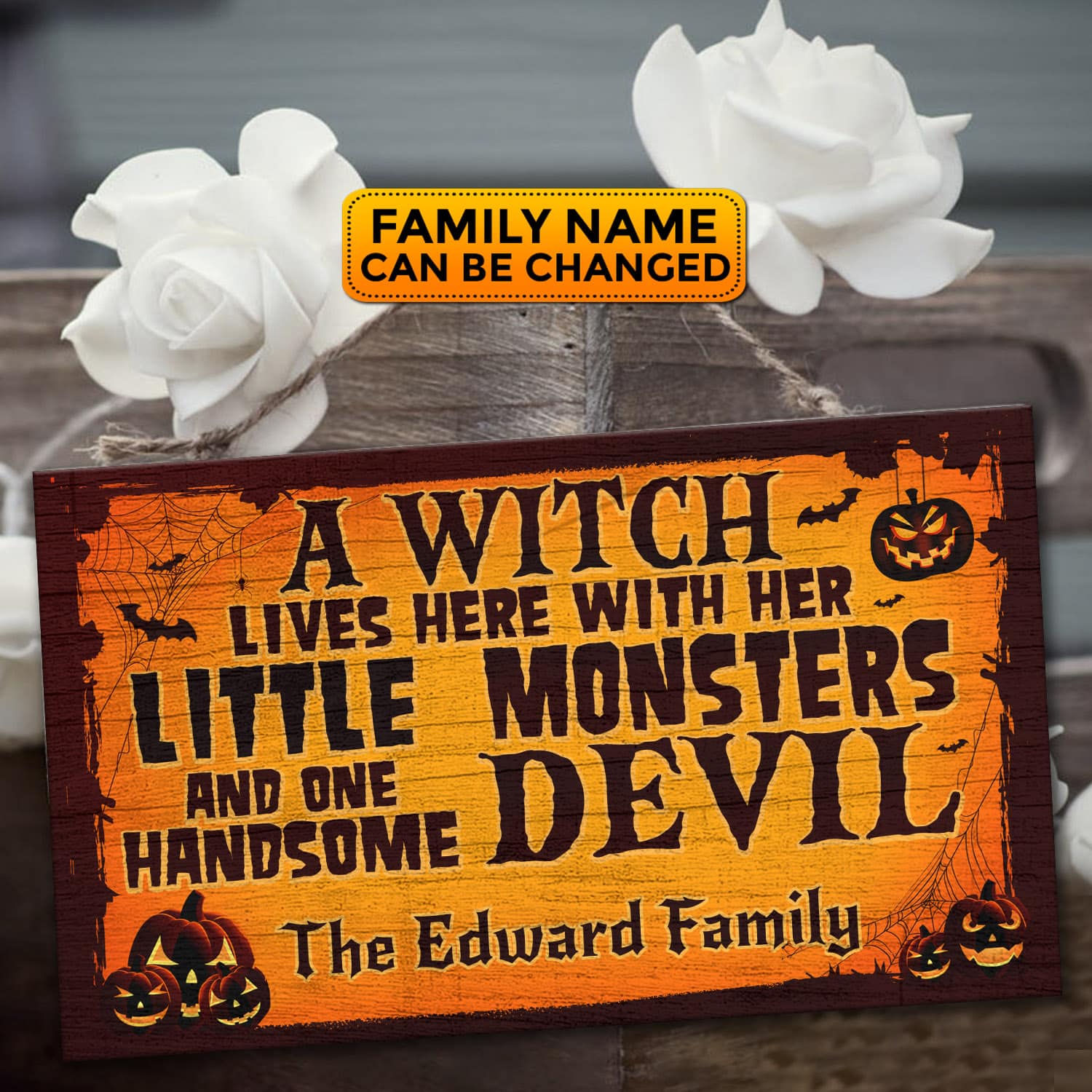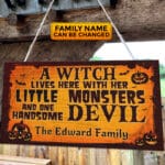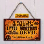 Let’s Shop Personalized A Witch Lives Here With Her Little Monsters and One Handsome Devil Rectangle Door Sign – Front Door Halloween Wooden Door Hangers!