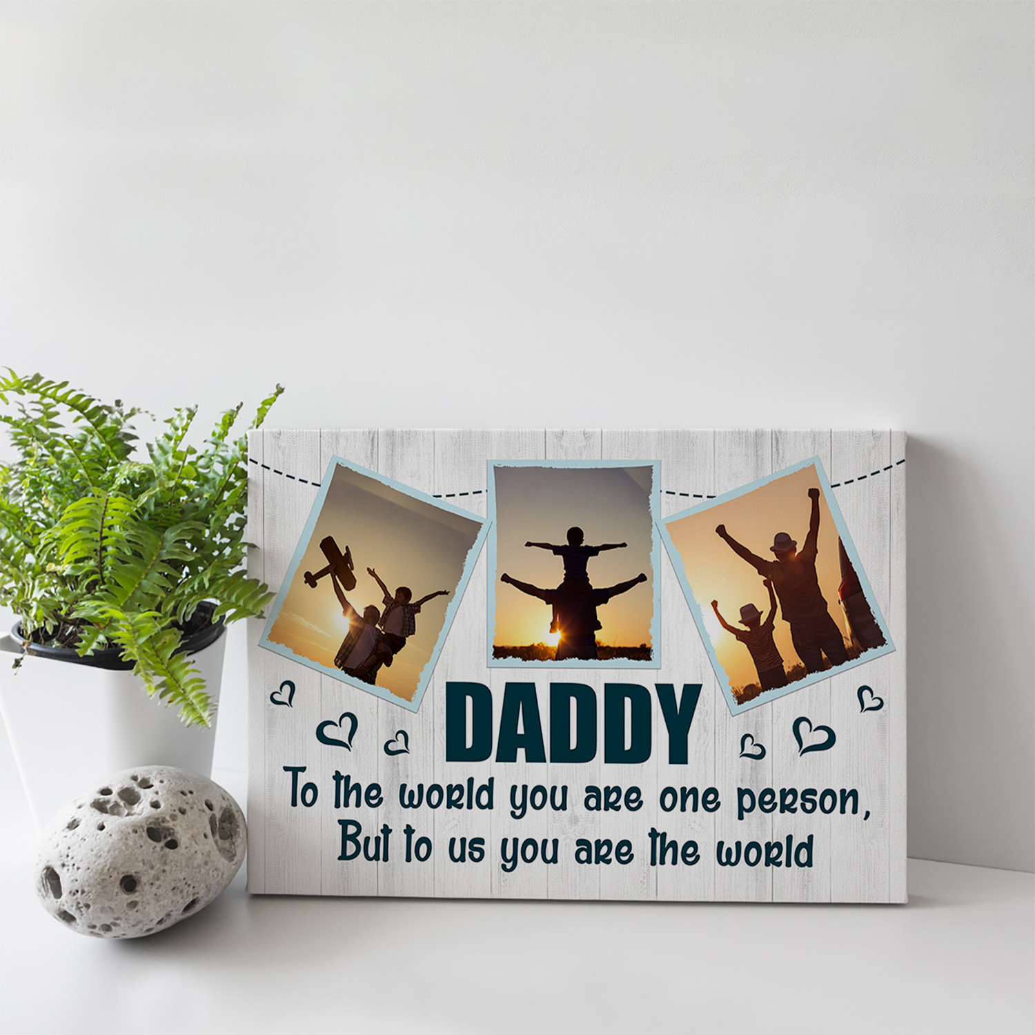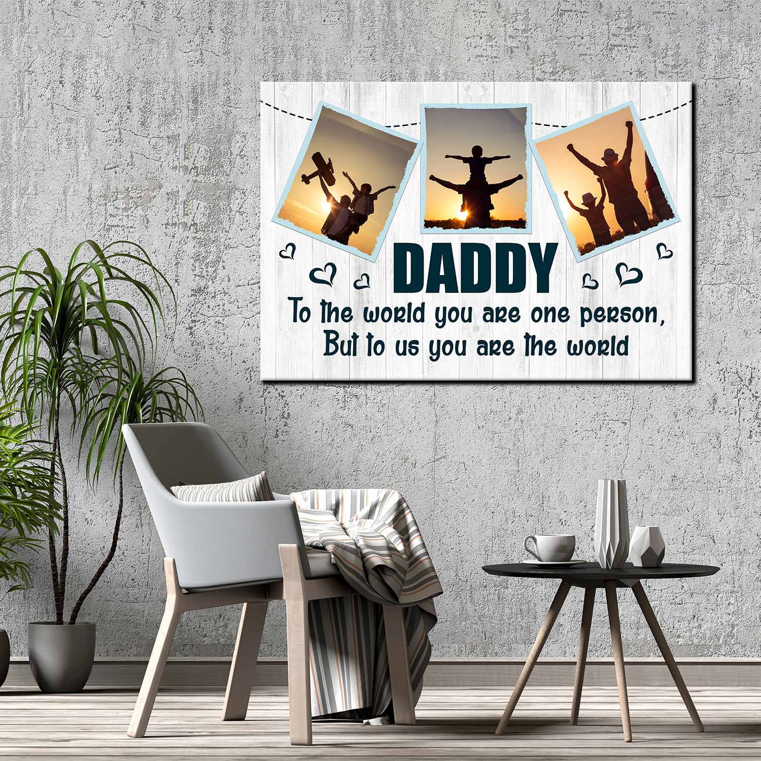 Let’s Shop Personalized Photo Daddy to The World You’re One Person to Us You’re the World Framed Canvas Unframed Poster!