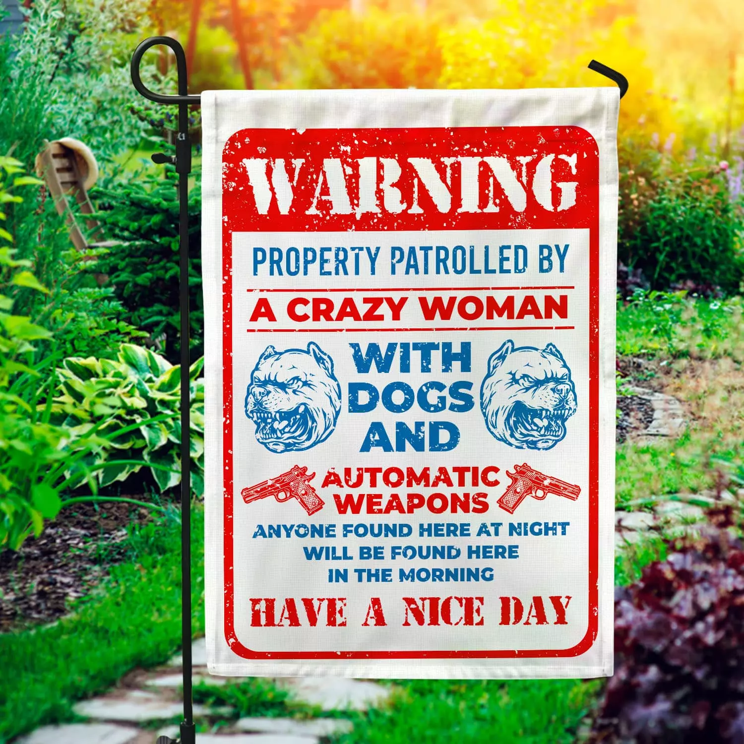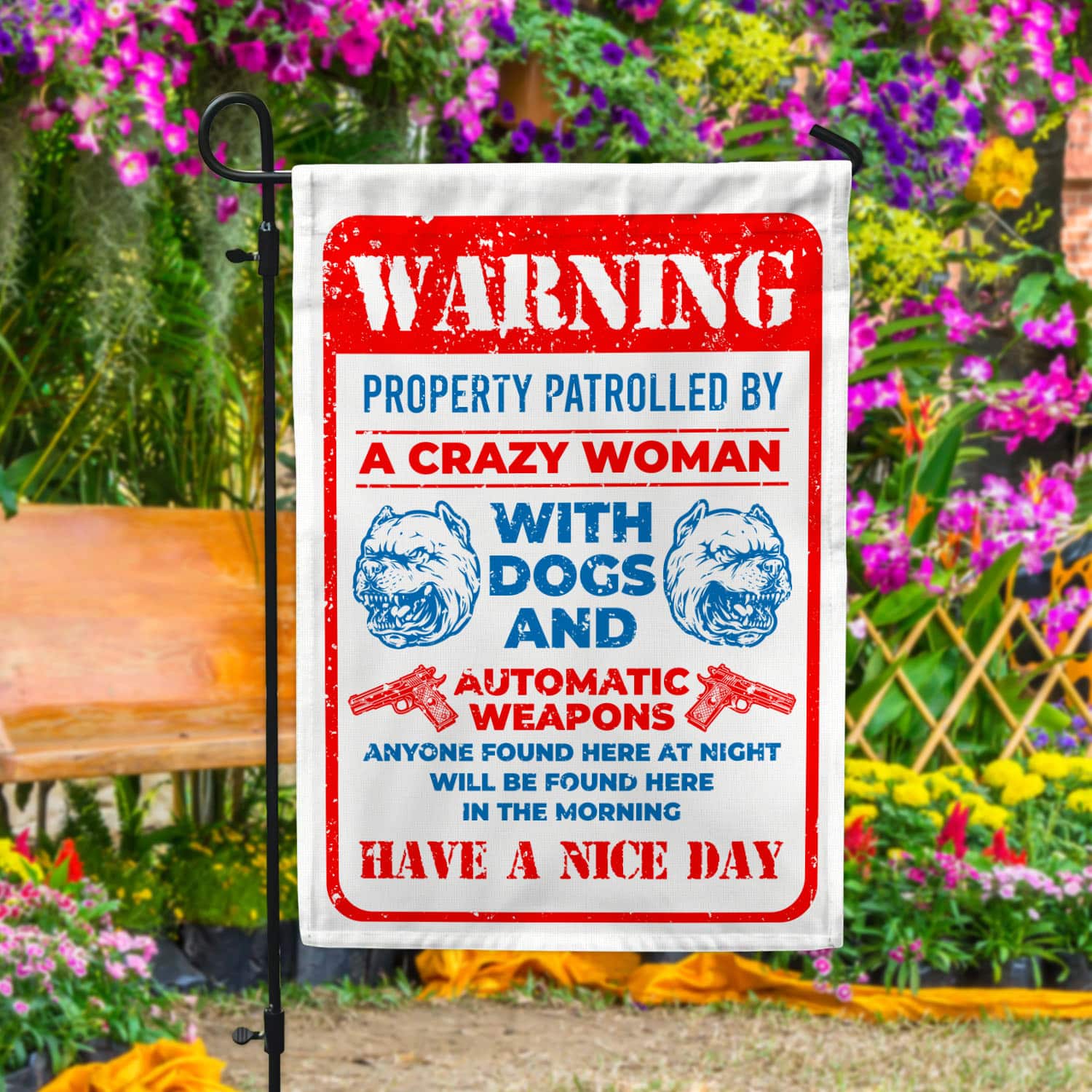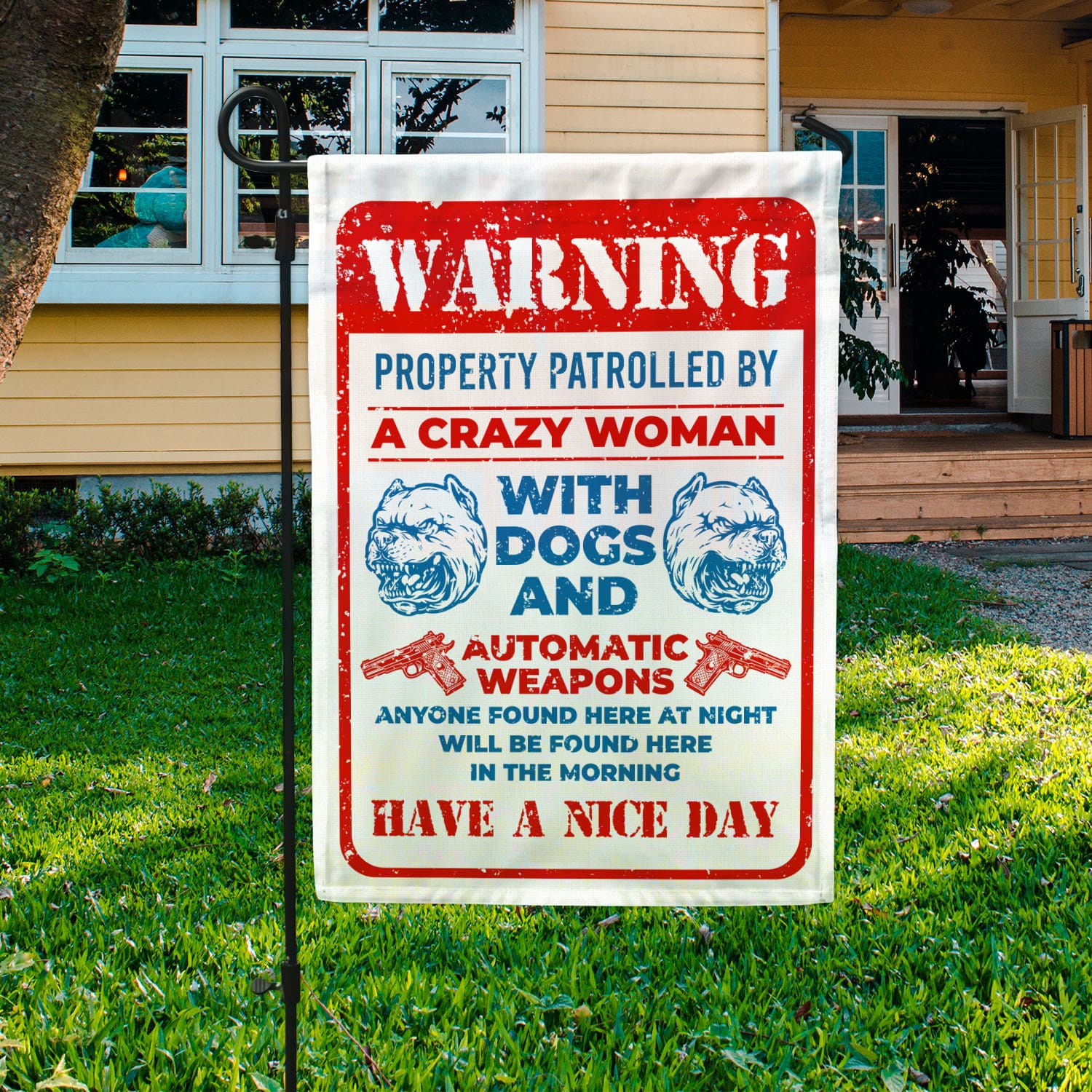 Let’s Shop Guns Warning Property Patrolled By A Crazy Woman With Dogs And Automatic Weapons Garden Flag – House Flag!