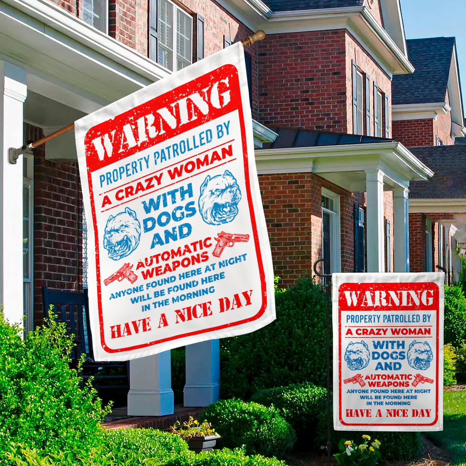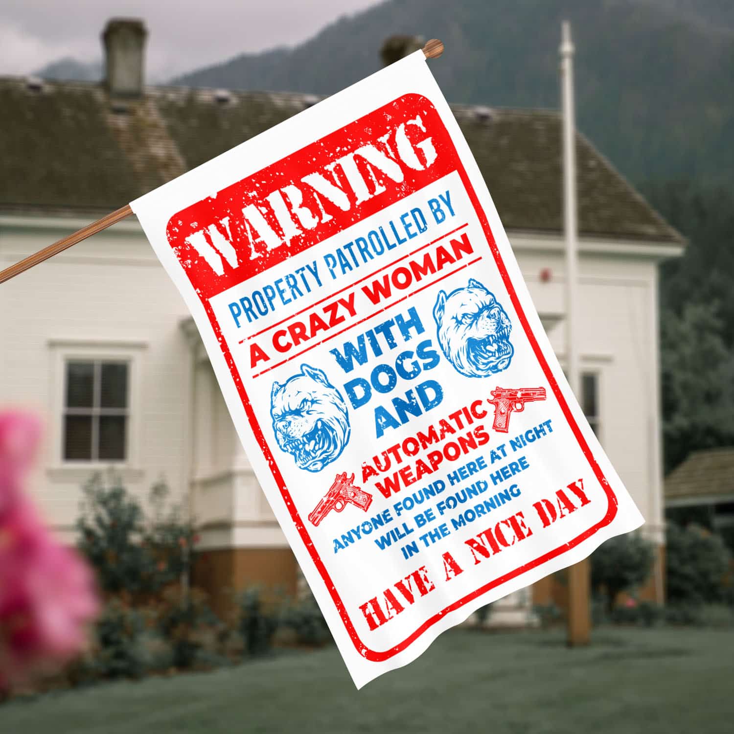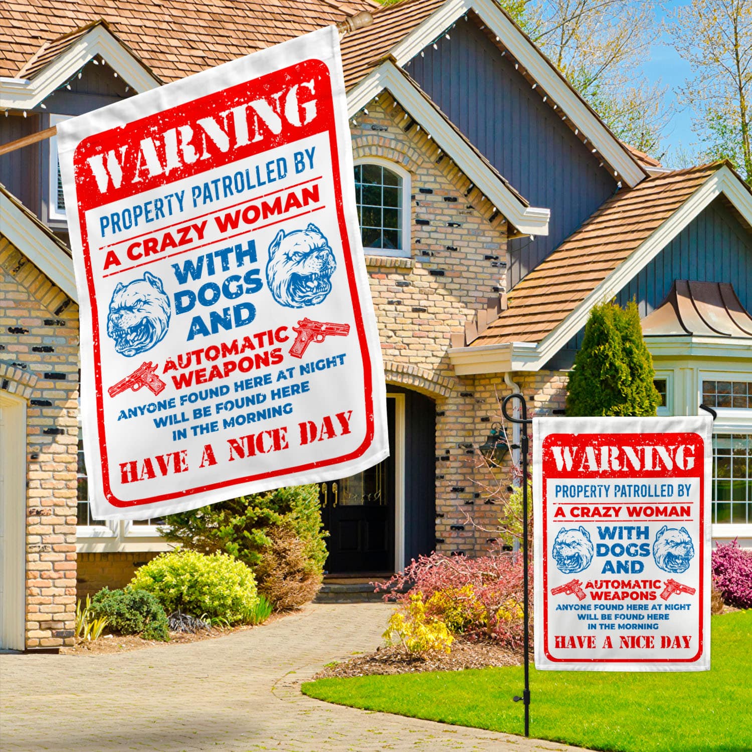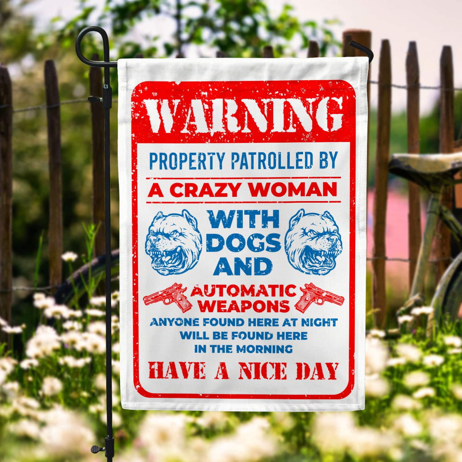 Let’s Shop Guns Warning Property Patrolled By A Crazy Woman With Dogs And Automatic Weapons Garden Flag – House Flag!