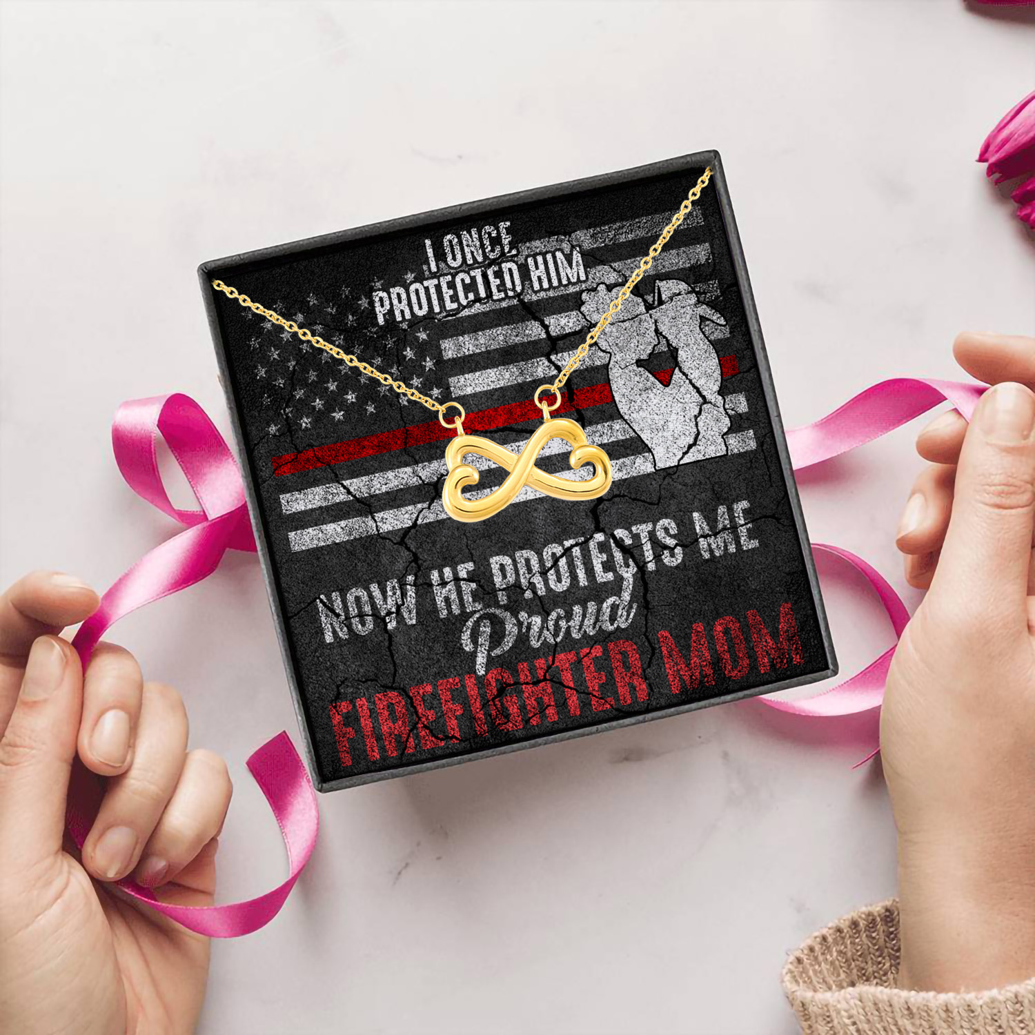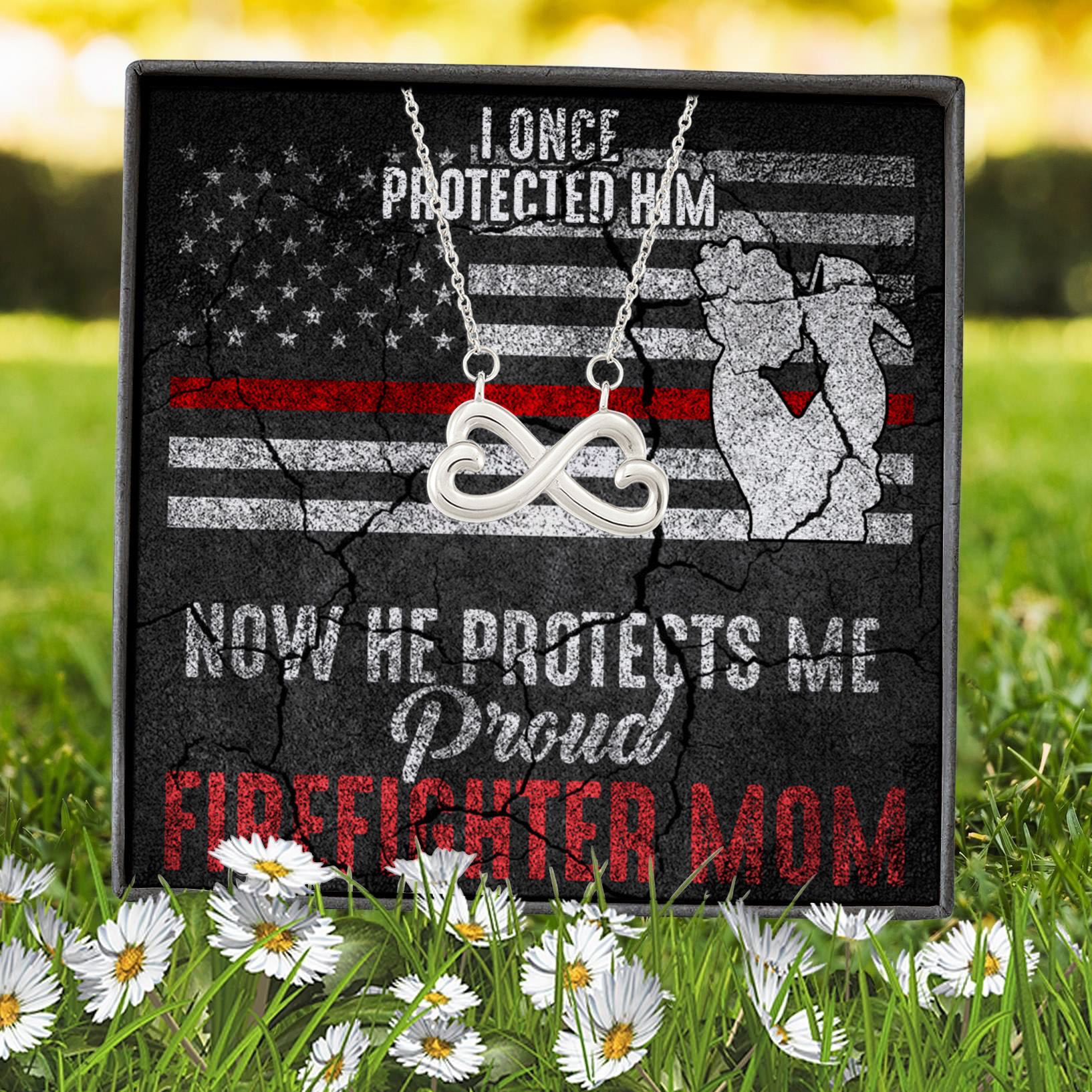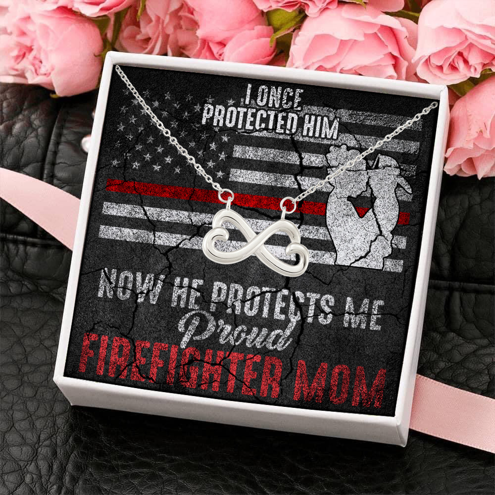 Let’s Shop I Once Protected Him Now He Protects Me Proud Firefighter Mom American Flag Infinity Heart Pendant Necklace!