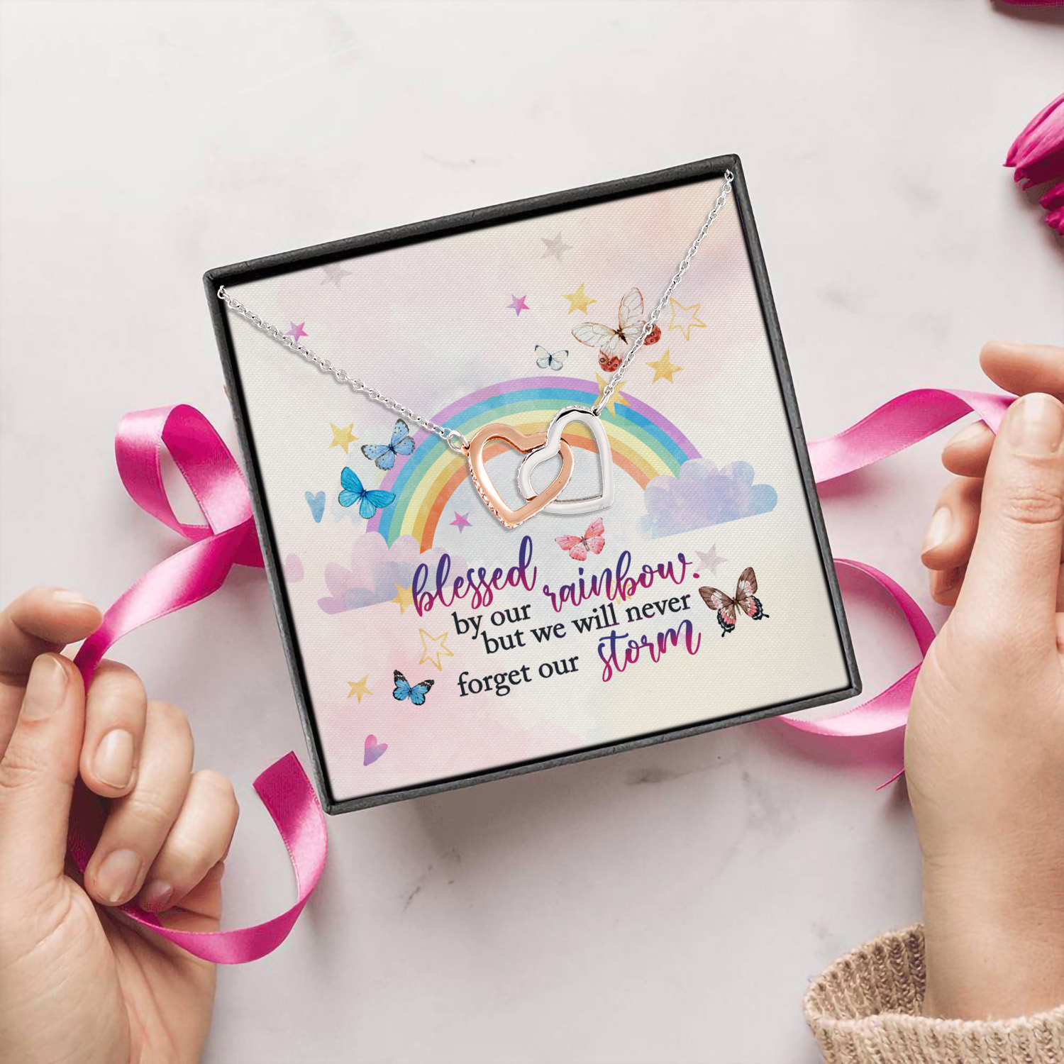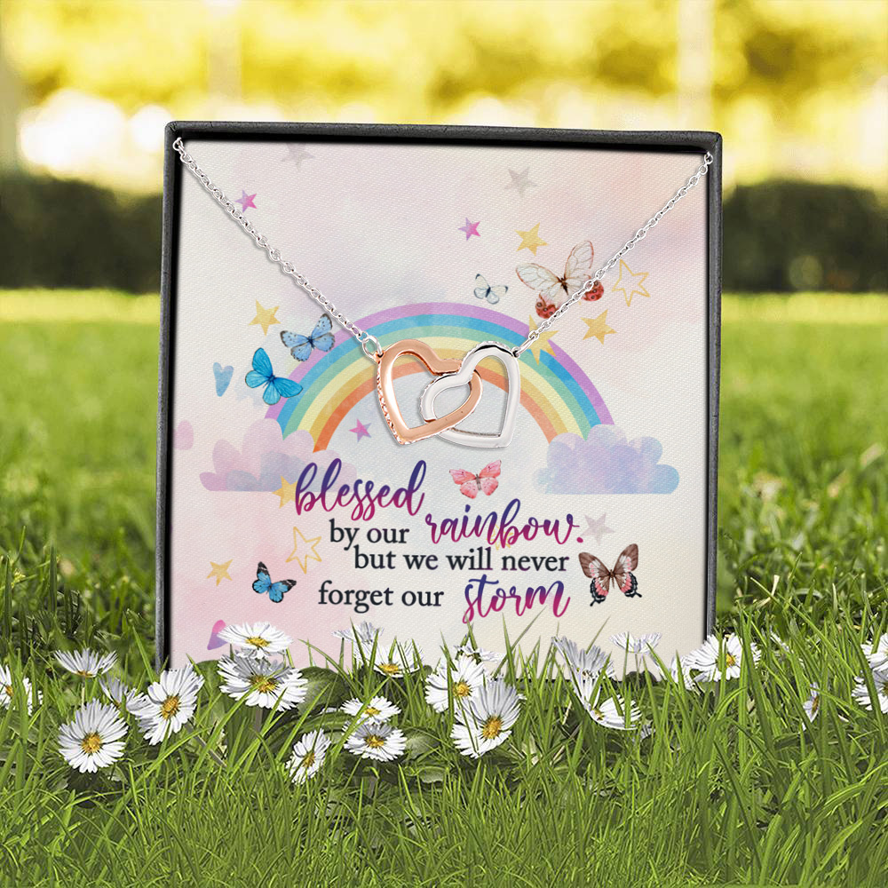Let’s Shop Blessed By Our Rainbow But We Will Never Forget Our Storm Interlocking Hearts Pendant Necklace!