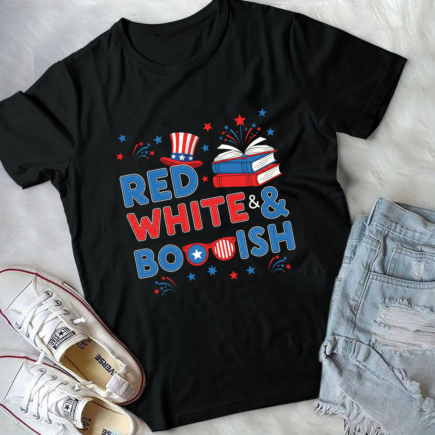 Red White & Bookish USA Flag Patriotic 4th Of July T-Shirt - V-Neck Shirt, Black, V-Neck T-Shirt
