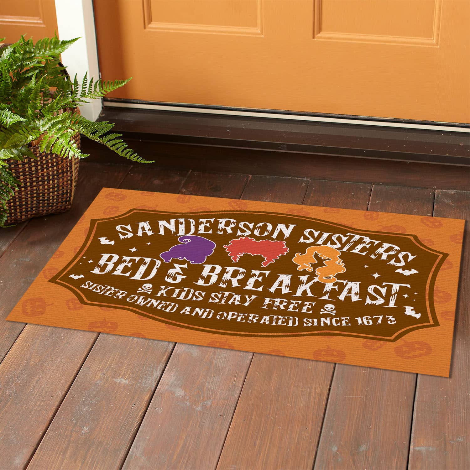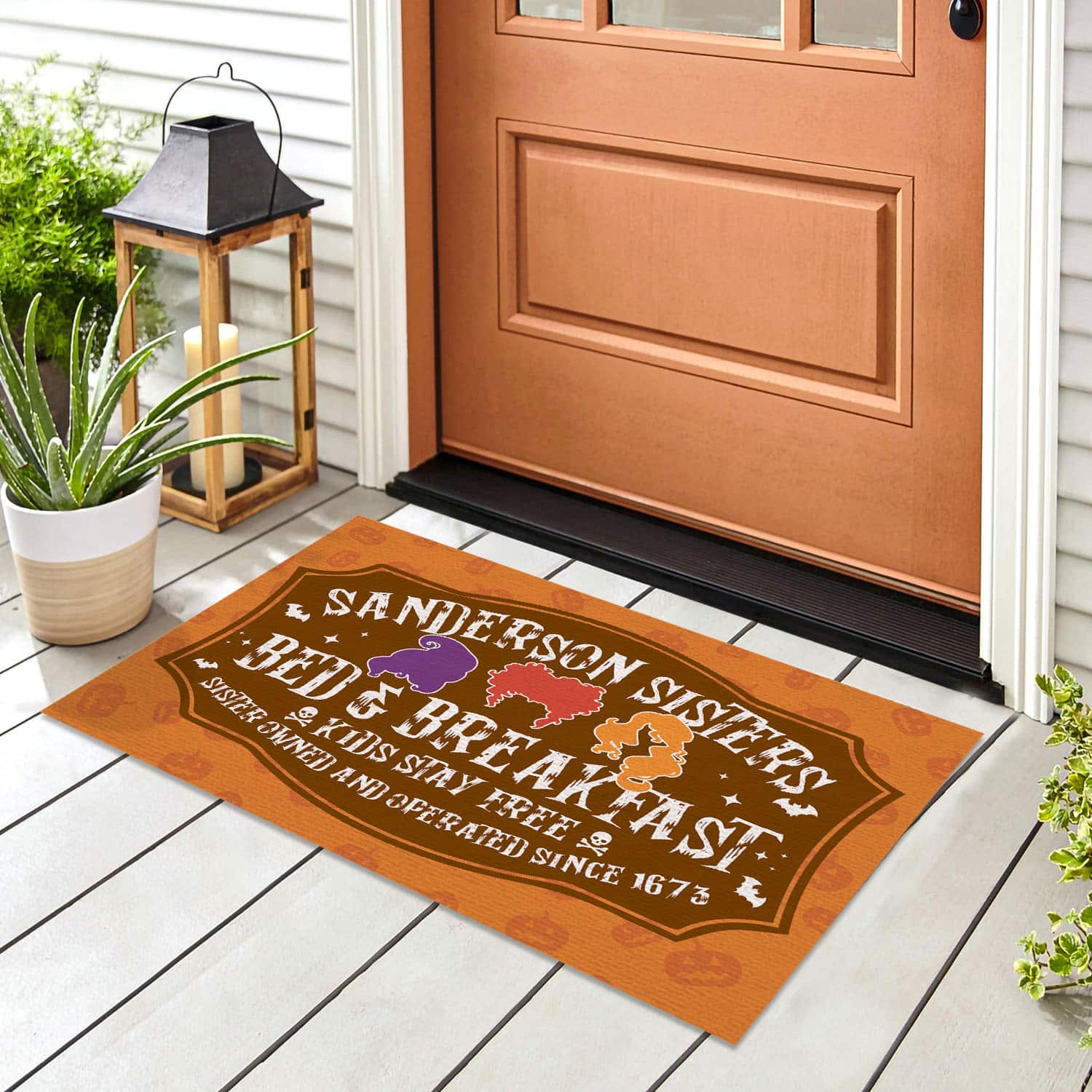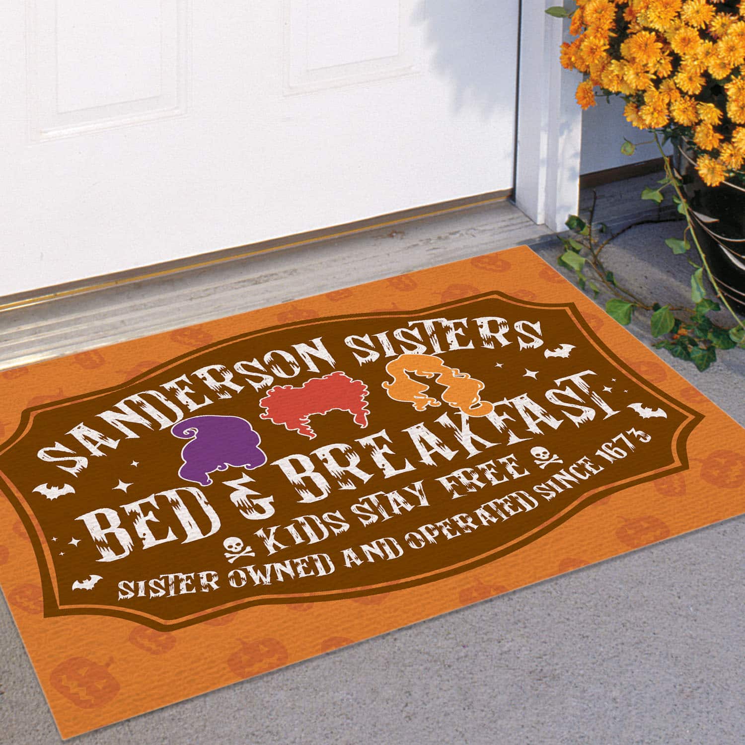 Let’s Shop Hocus Pocus Sanderson Sisters Bed And Breakfast Kids Stay Free Since 1673 Indoor Outdoor Decorative Doormat!