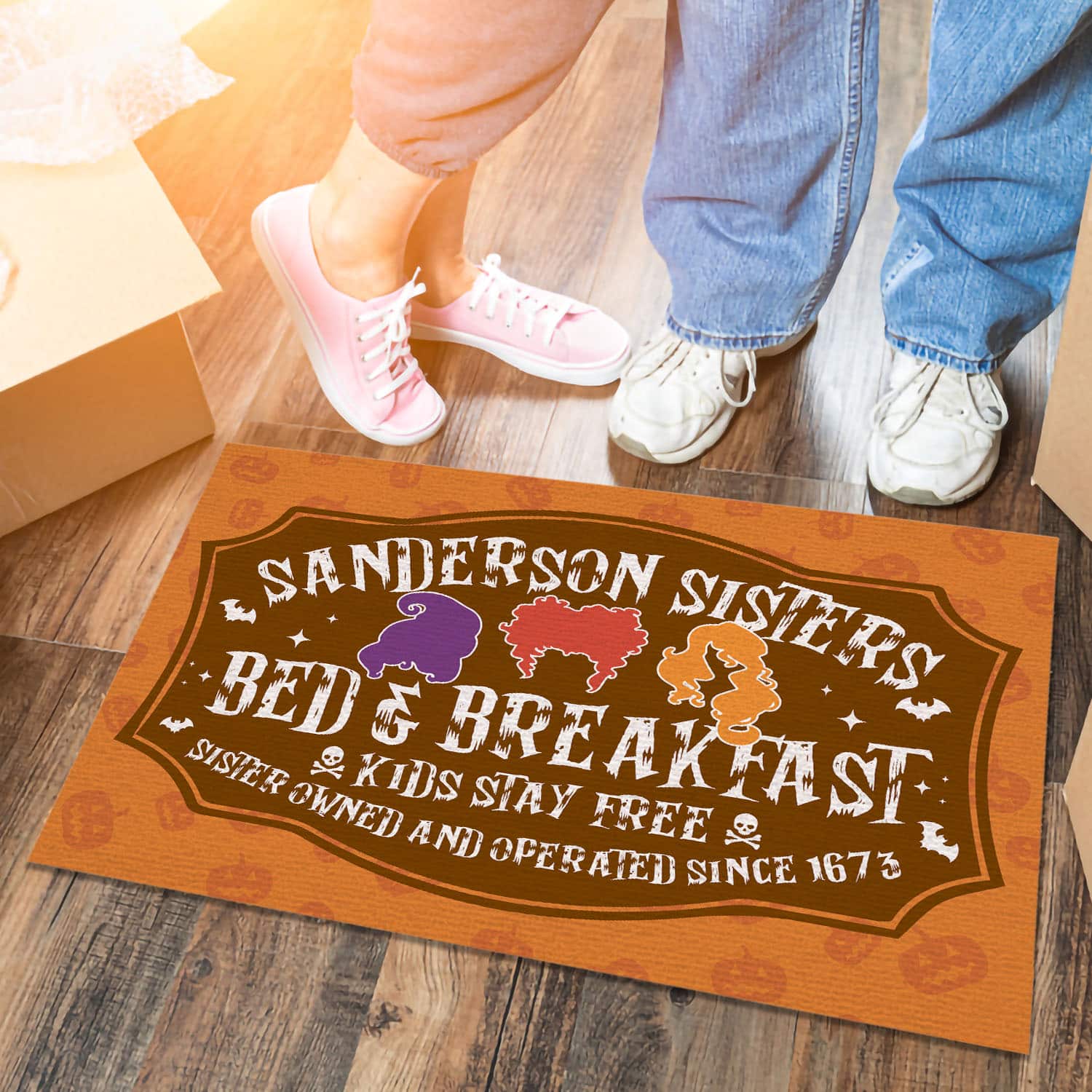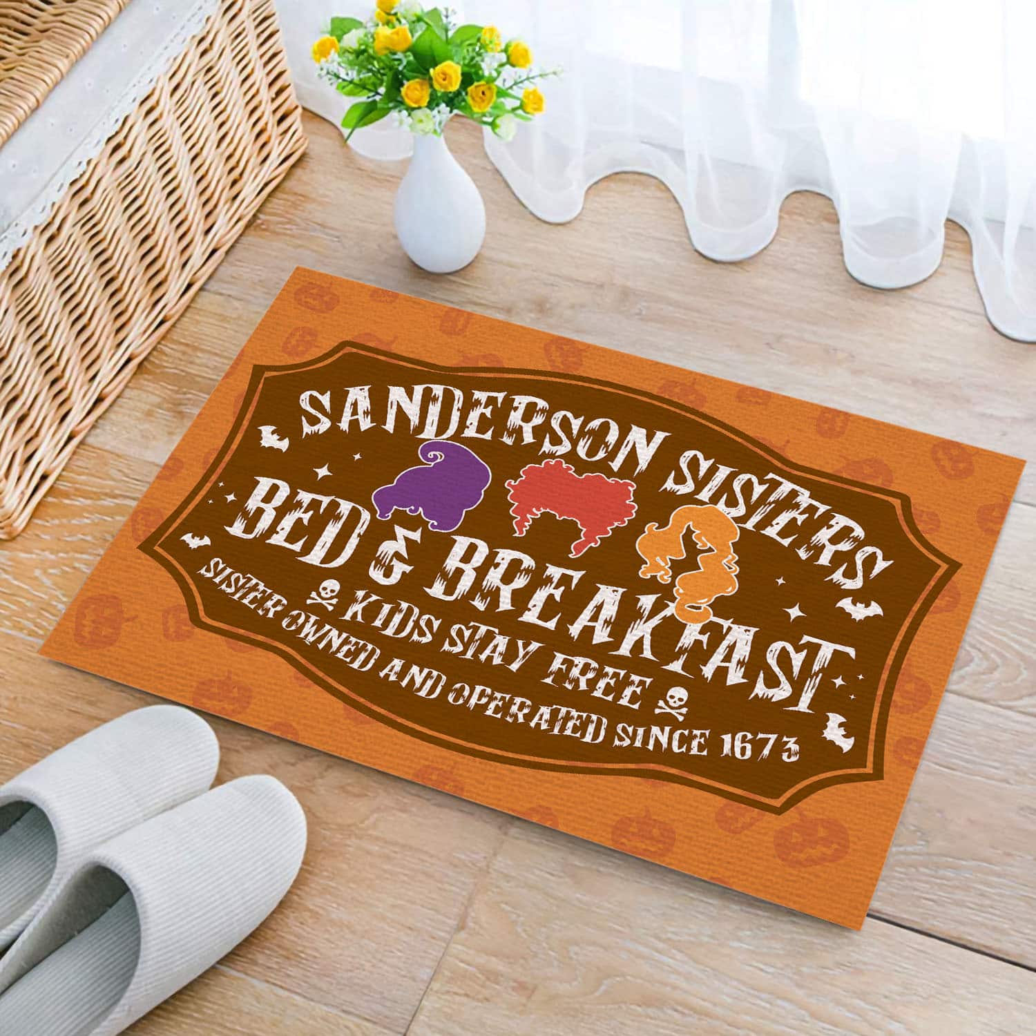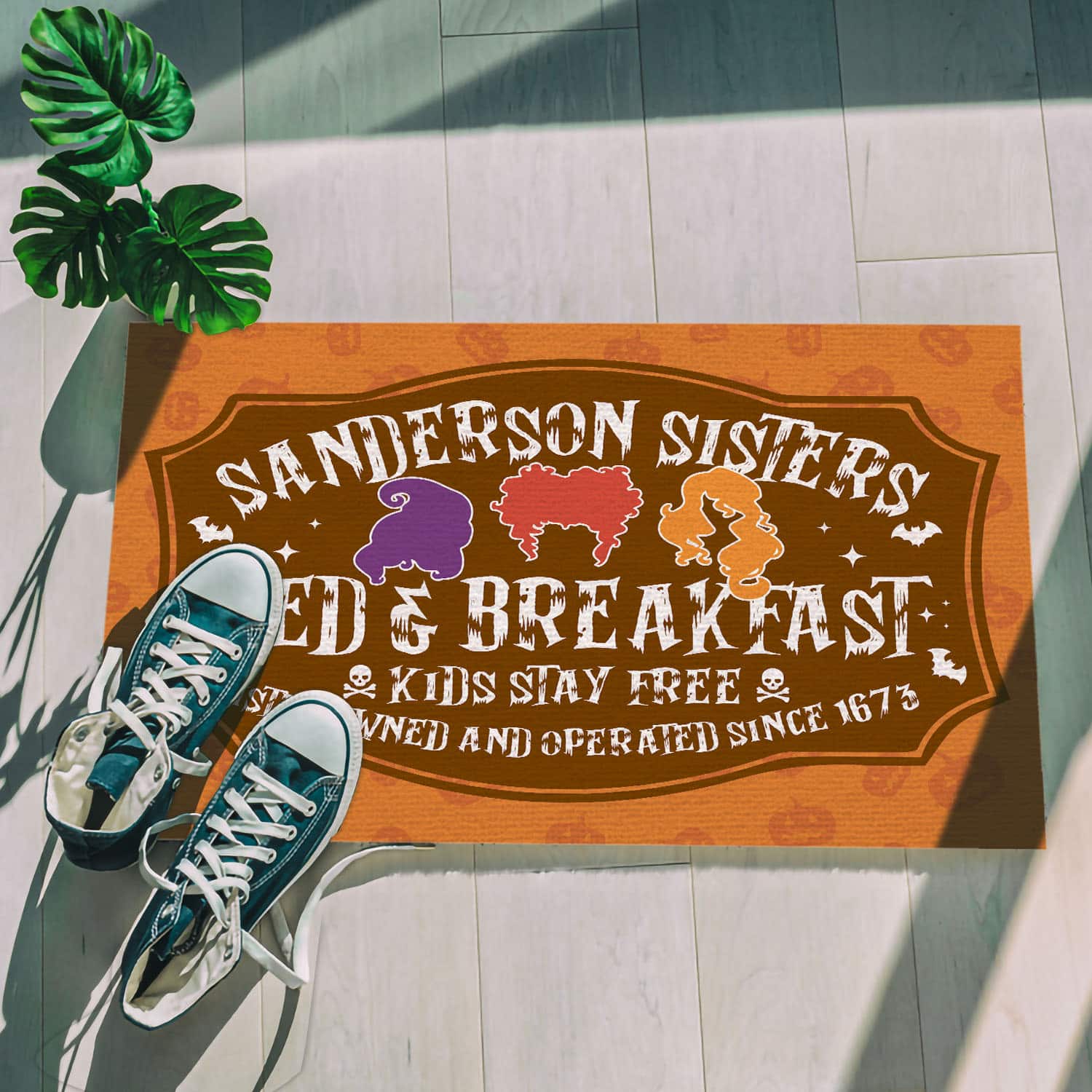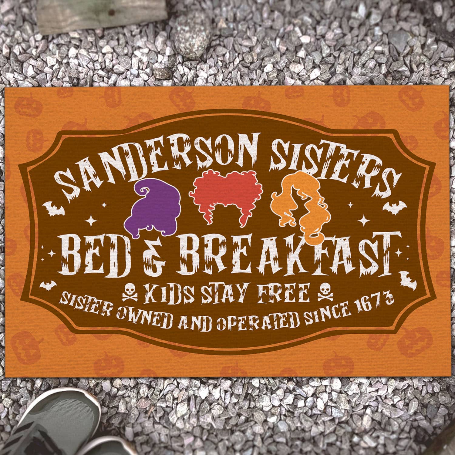 Let’s Shop Hocus Pocus Sanderson Sisters Bed And Breakfast Kids Stay Free Since 1673 Indoor Outdoor Decorative Doormat!