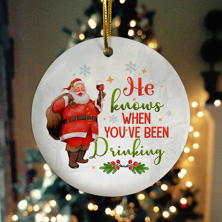 Let’s Shop He Knows When You’ve Been Drinking Decorative Christmas Circle Ornament – Funny Santa Christmas Ornament!
