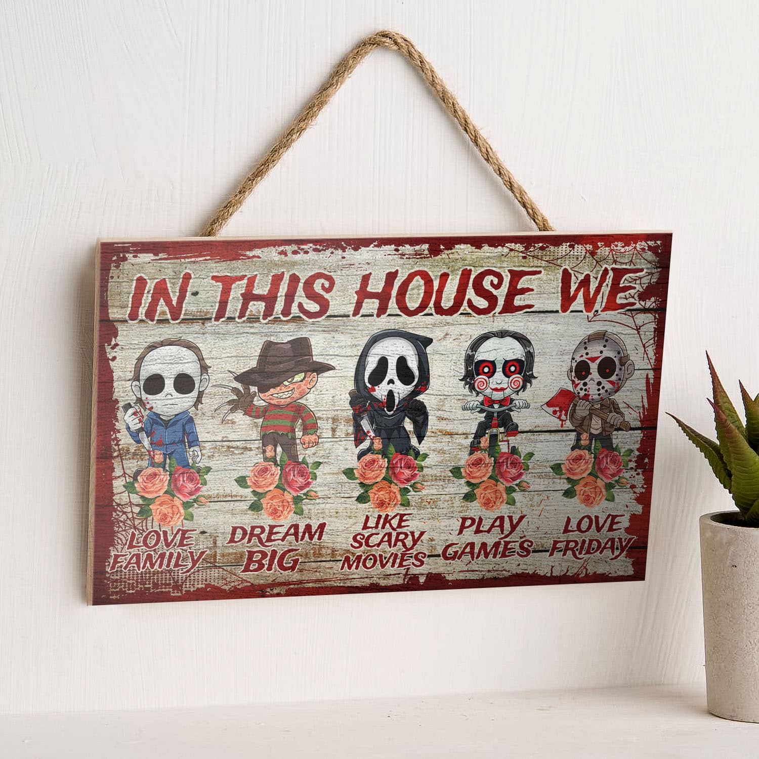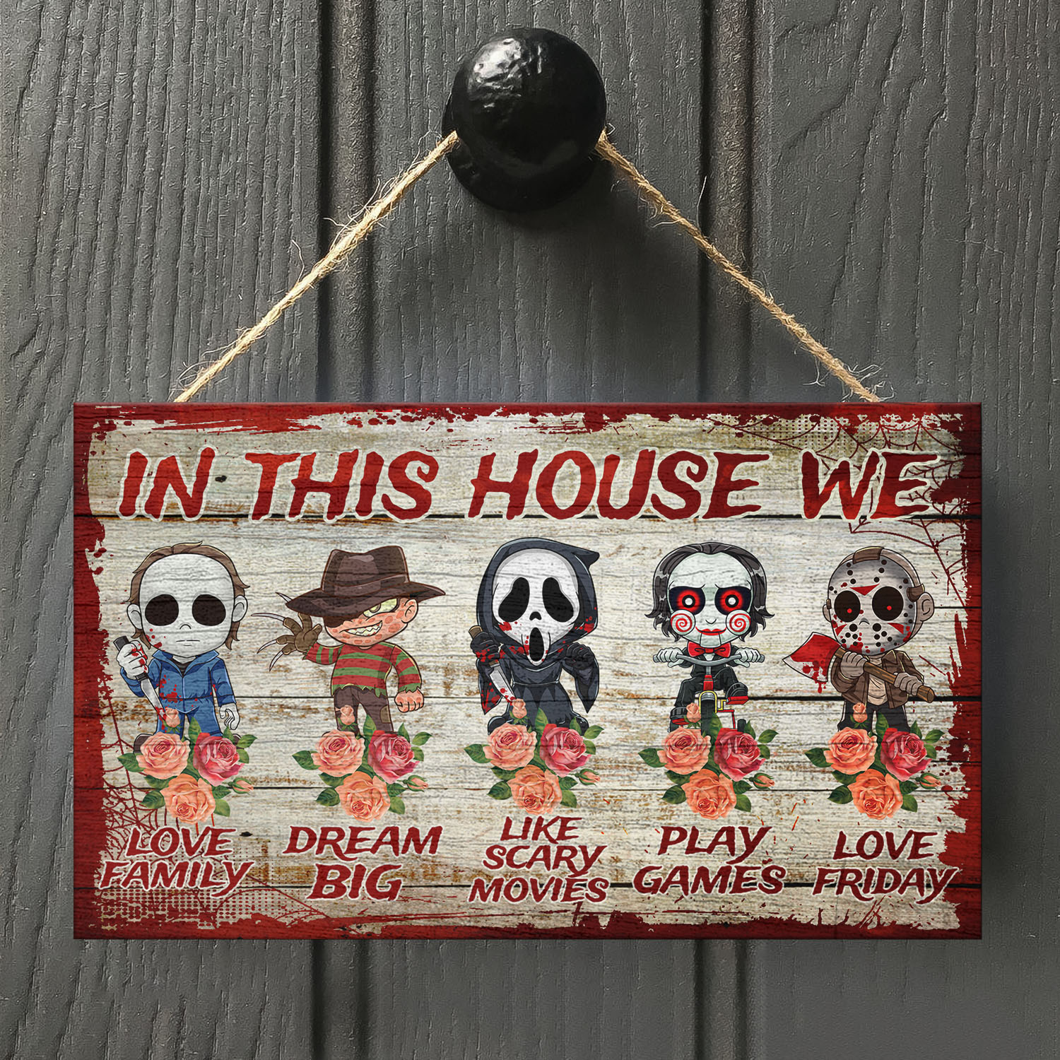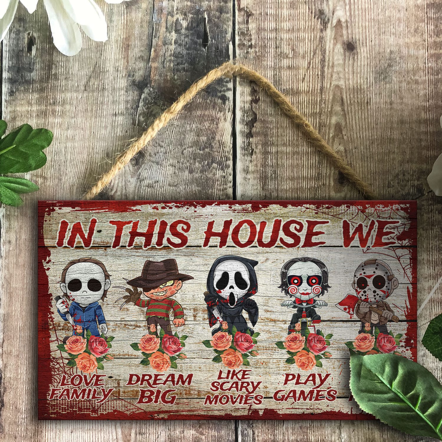 Let’s Shop In This House We Love Family Dream Big Like Scary Movies Horror Movie Characters Rectangle Wooden Door Sign!