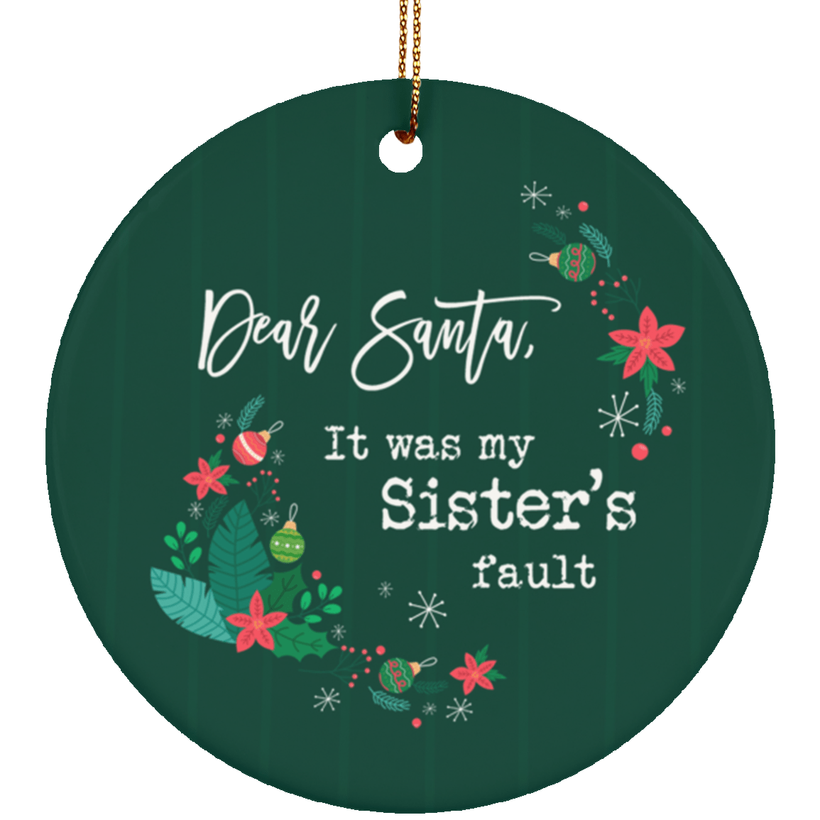 Shop Dear Santa It Was My Sister’s Fault Christmas Ornament Keepsake – Circle Porcelain Ceramic Ornament.