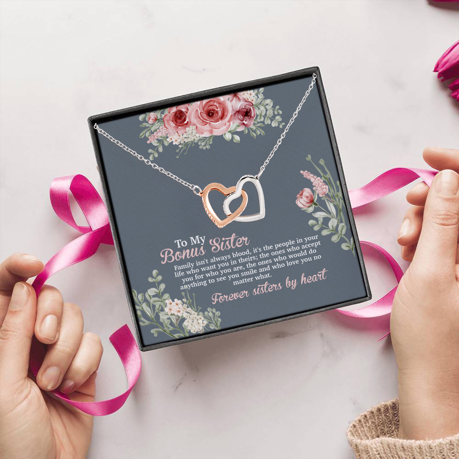 Let’s Shop To My Bonus Sister Family Isn’t Always Blood Joined Interlocking Hearts Pendant Necklace – Sister In Law Gifts!