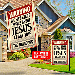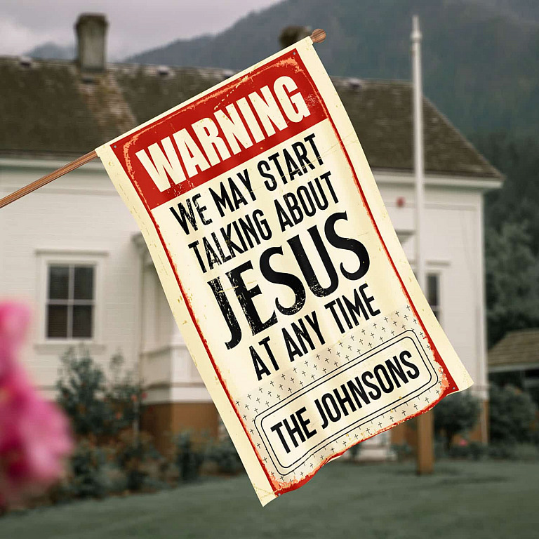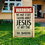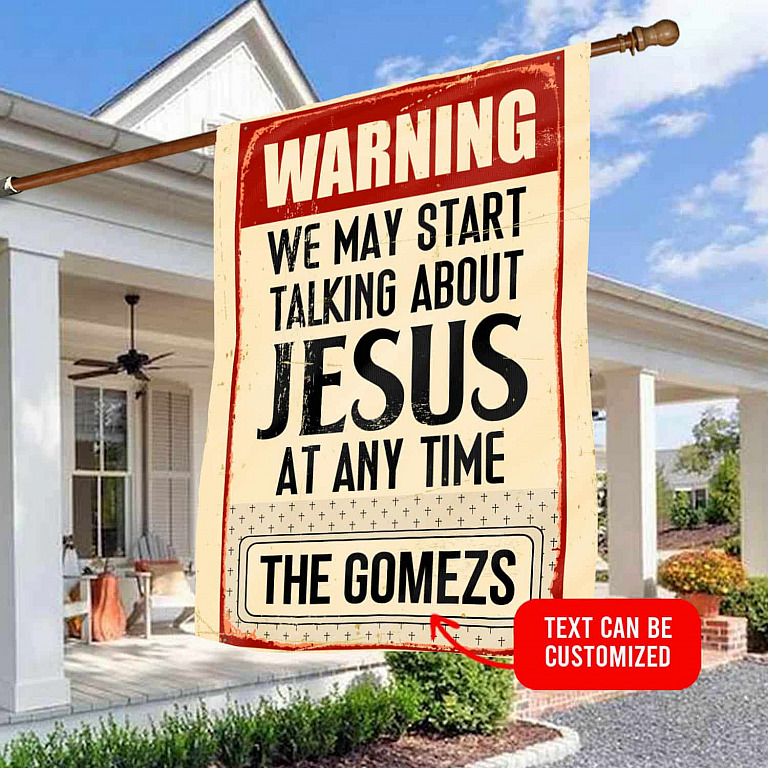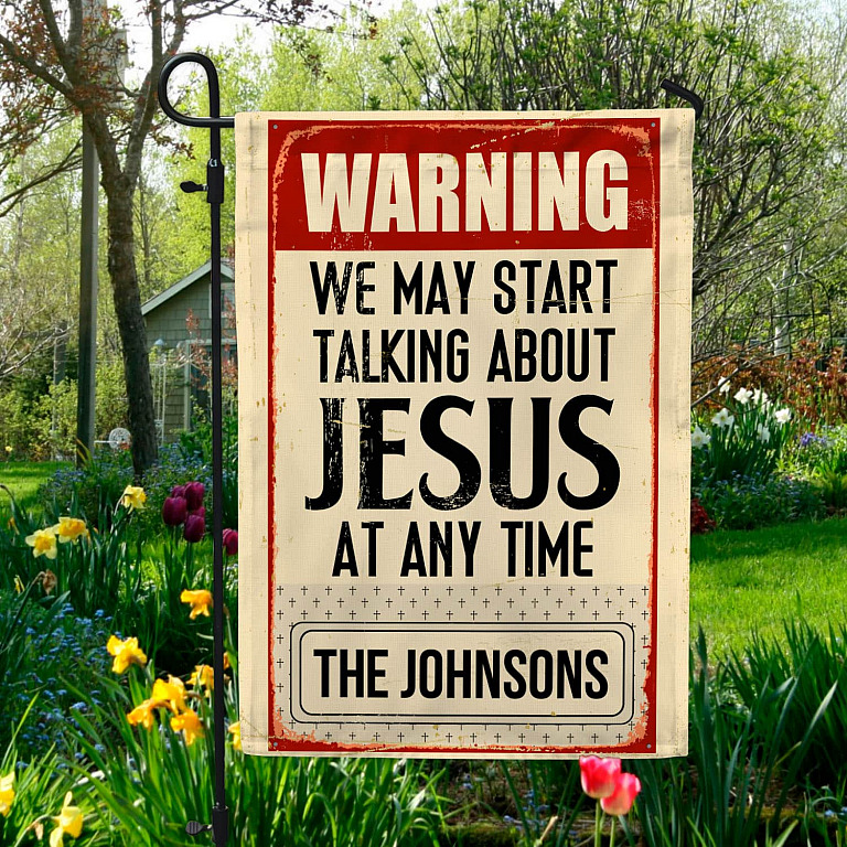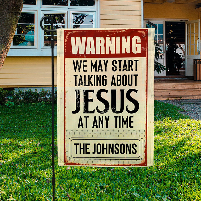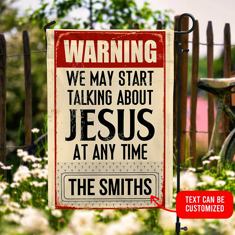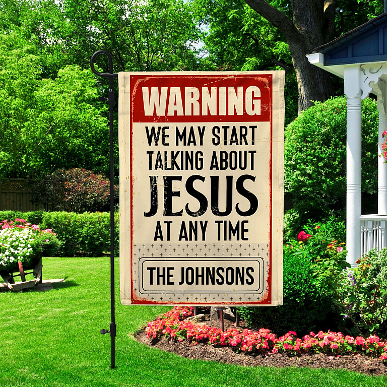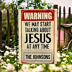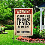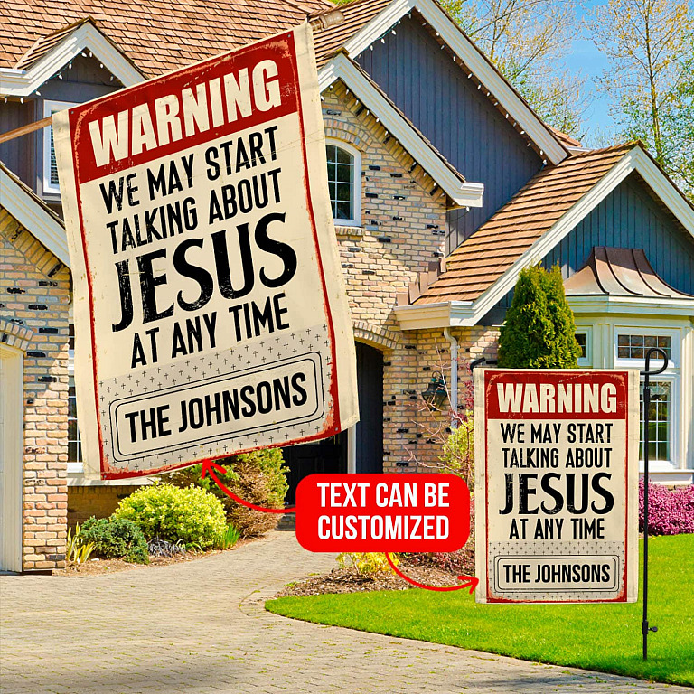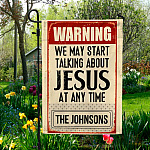 Let’s Shop Warning We May Start Talking About Jesus At Any Time Personalized Family Name Garden Flag – House Flag!