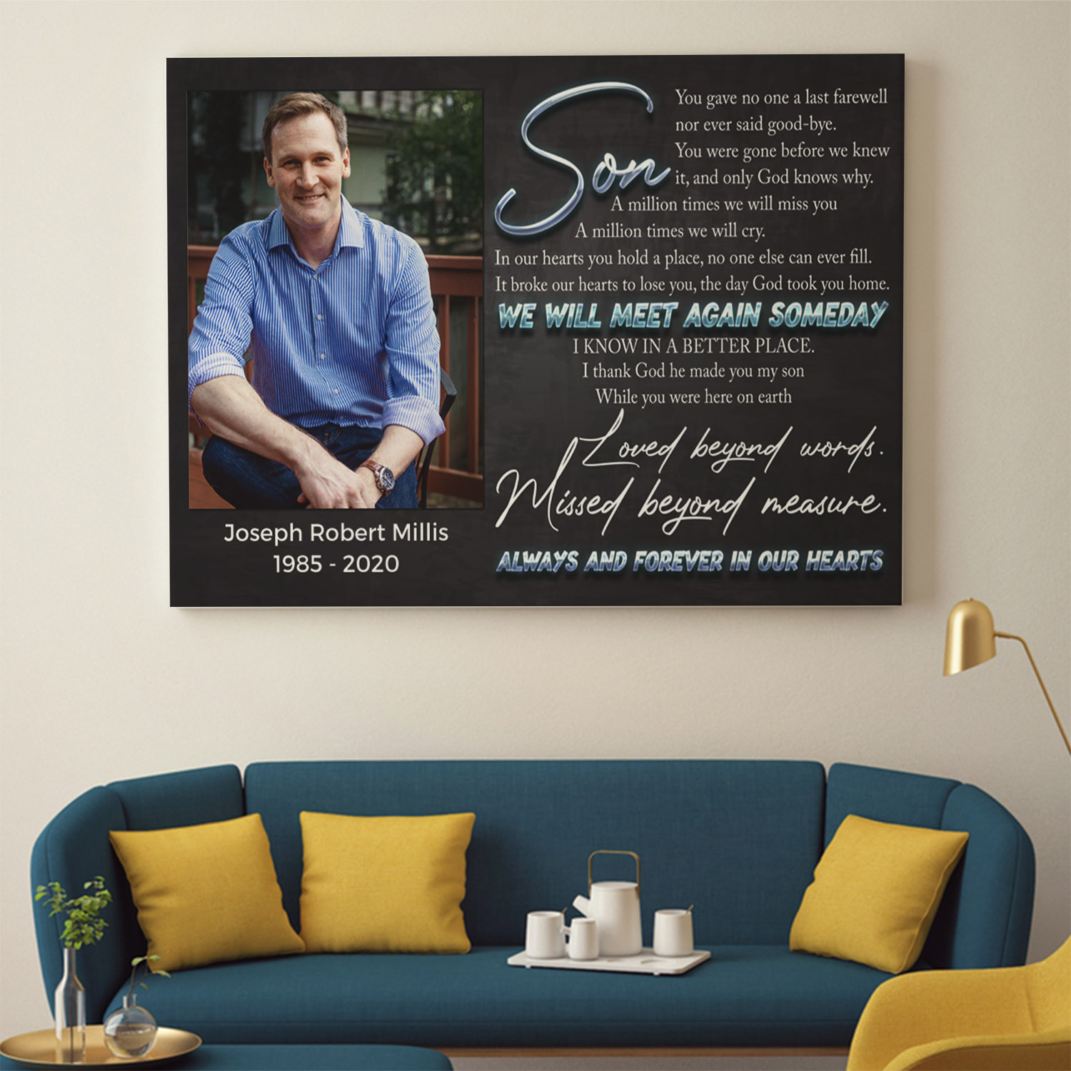 Are you spending too much time to find creative merchandise for you or suitable & special gifts for your mommy, your daddy, your son, your daughter, your children, your friends or someone you love? The struggle is over because we have various Loss Of Son Sympathy Gifts, Sympathy Gifts For Loss Of Son, Memorial Gifts For Loss Of Son Personalized, Loss Of Son Memorial Gifts With Picture, Bereavement Gifts For Loss Of Son Personalized, Memorial Canvas For Loss Of A Son, Sympathy Loss Of Son, Custom Photo We Will Meet Again Someday, Always And Forever In Our Hearts Canvas which will make perfect presents for your beloveds. In order to make your present stand out, we have created lots of unique and awesome customized photo gifts & personalized designs.