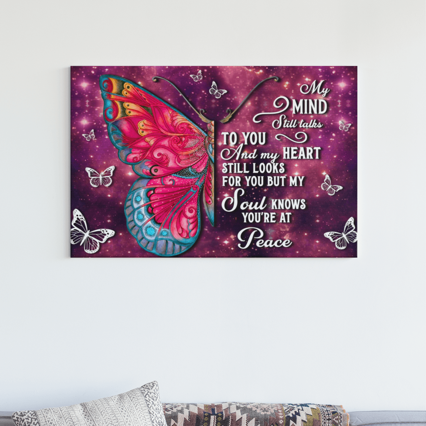 Are you spending too much time to find creative merchandise for you or suitable & special gifts for your mommy, your daddy, your son, your daughter, your children, your friends or someone you love? The struggle is over because we have various My Mind Still Talks to You and My Heart Still Looks for You but My Soul Knows You’re at Peace, as I Sit in Heaven Butterfly, Memorial Canvas for Loss of Loved One, Canvas for Loss of Loved One, Memorial Gifts for Loss of Husband, Memorial Gifts for Loss of Wife, Miss You Gifts, in Heaven Gifts which will make perfect presents for your beloveds. In order to make your present stand out, we have created lots of unique and awesome customized photo gifts & personalized designs.