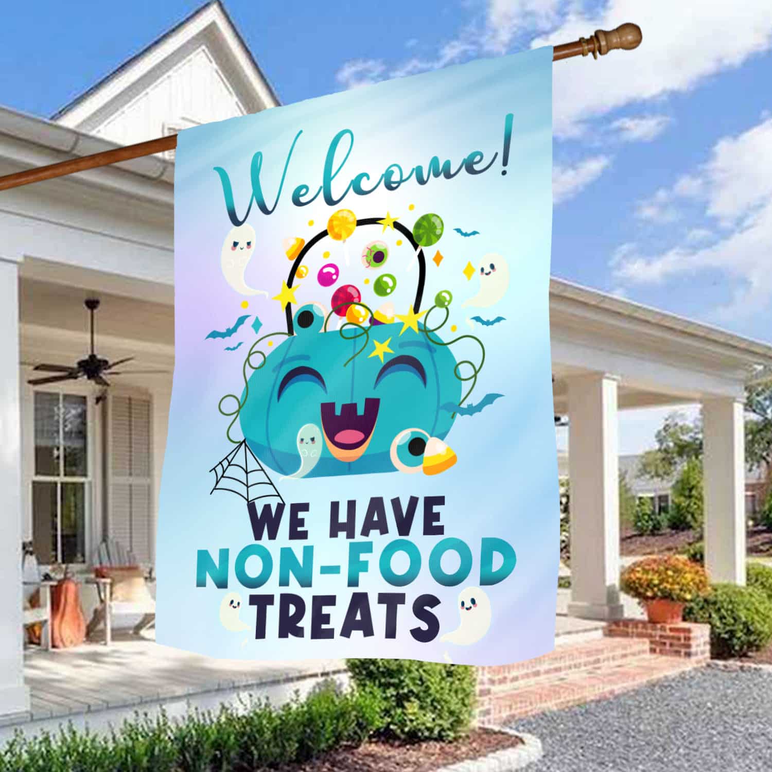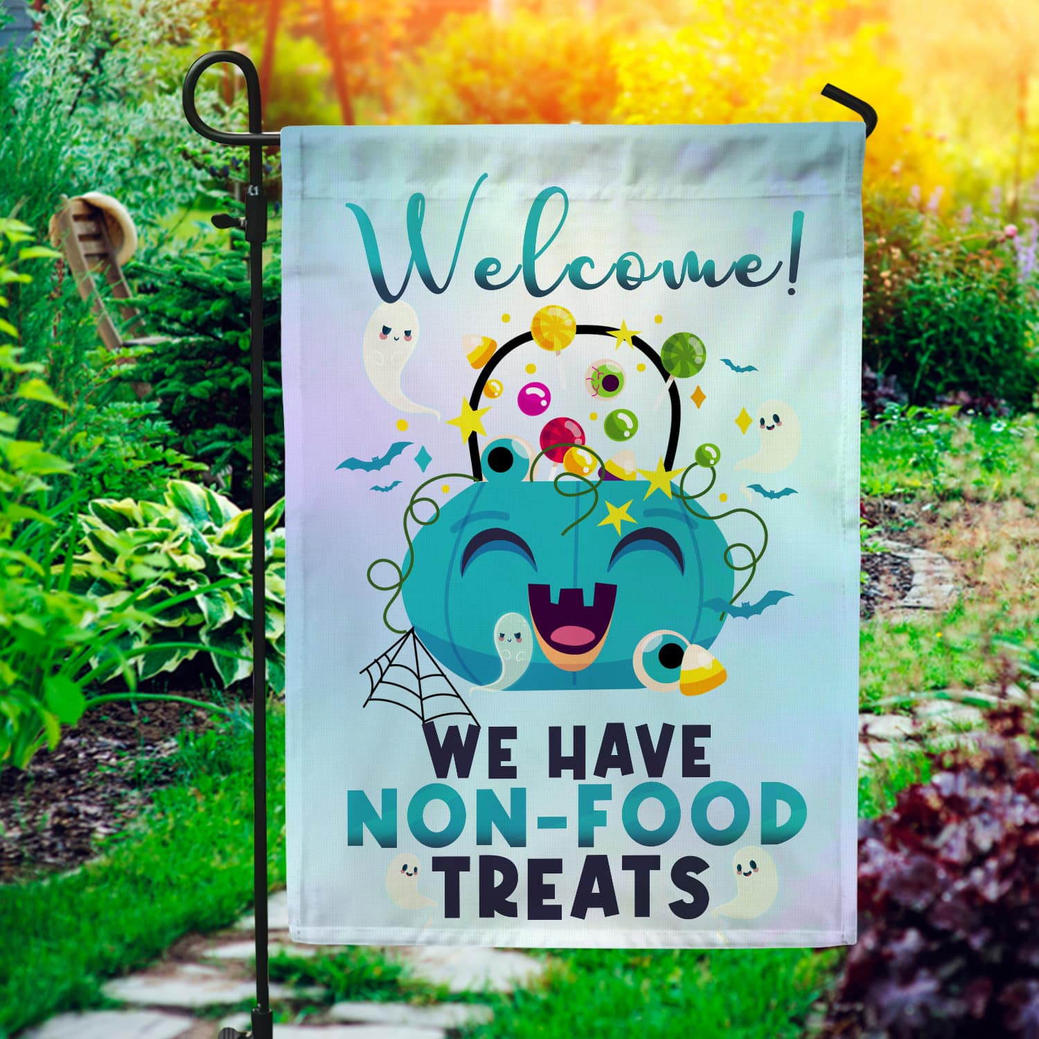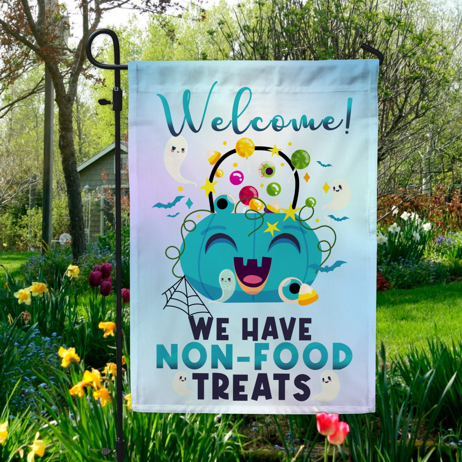 Let’s Shop Welcome We Have Non-Food Treats Decorative Garden Flag – Indoor Outdoor Flag – Halloween Teal Pumpkin Flag!