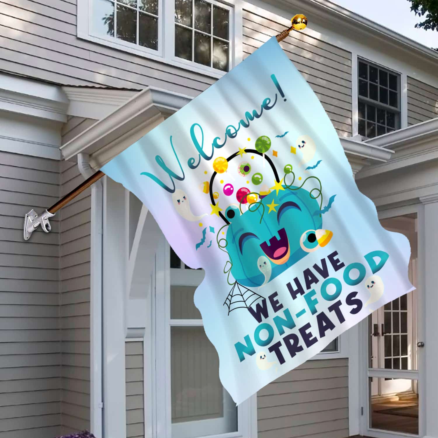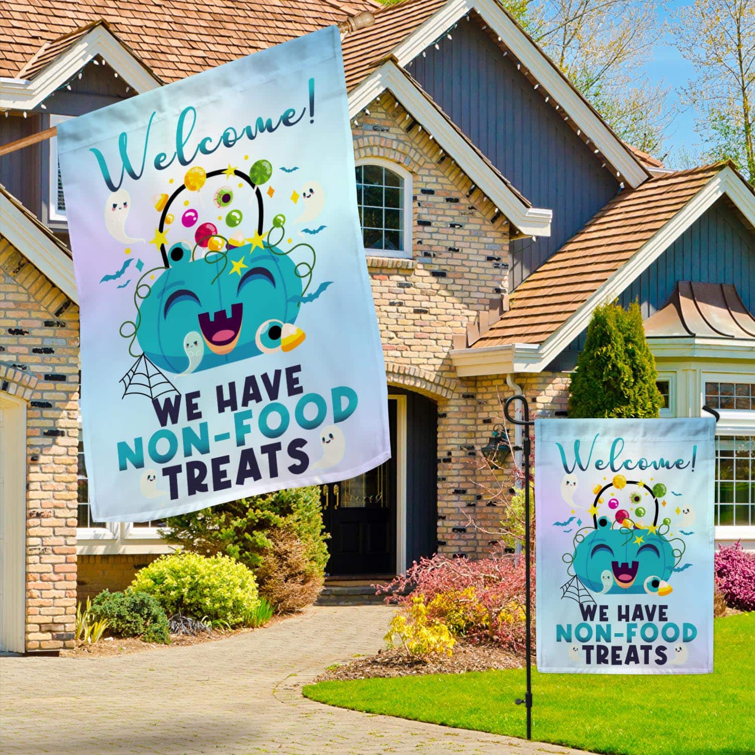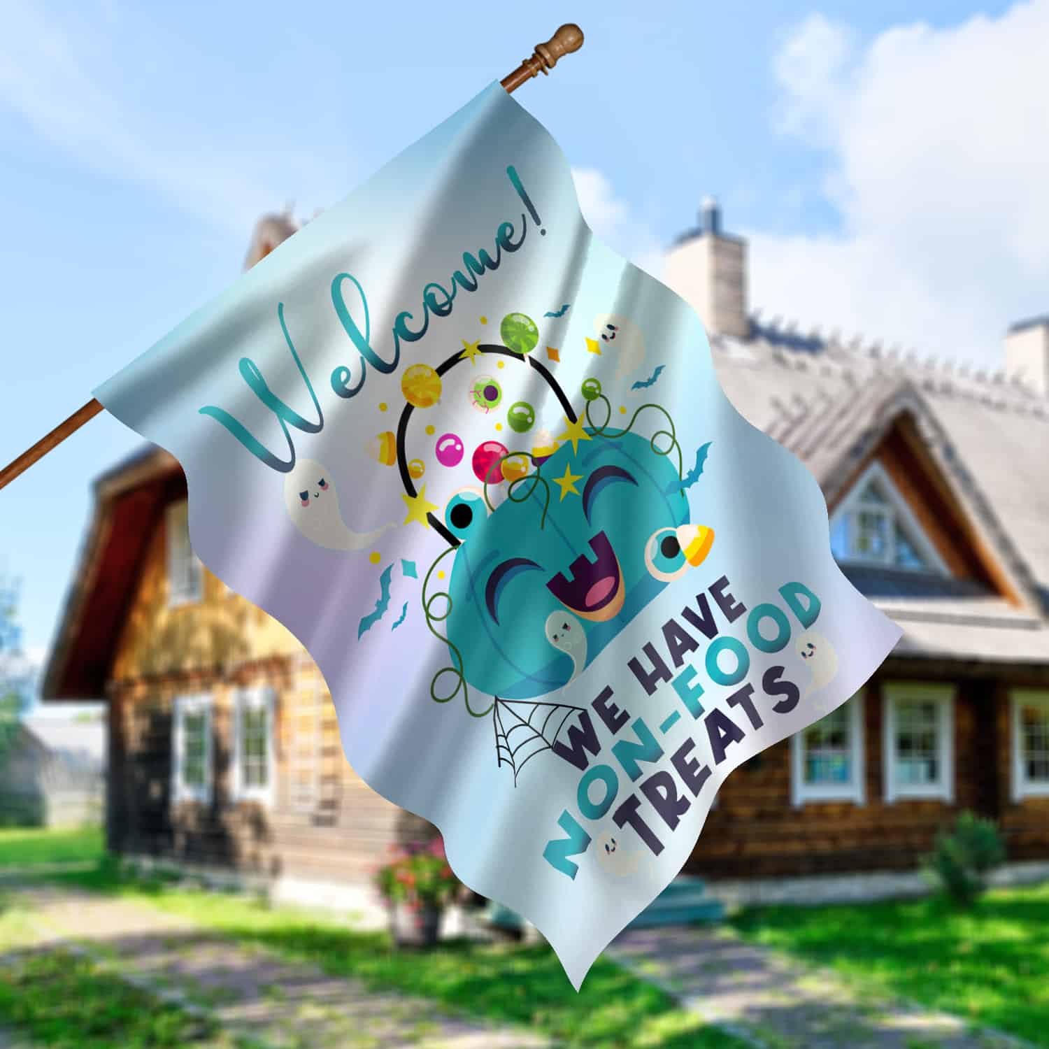 Let’s Shop Welcome We Have Non-Food Treats Decorative Garden Flag – Indoor Outdoor Flag – Halloween Teal Pumpkin Flag!