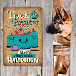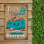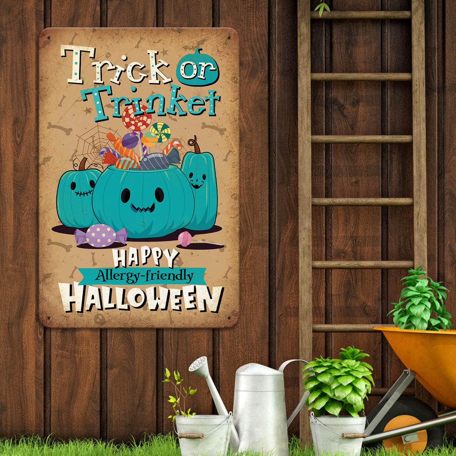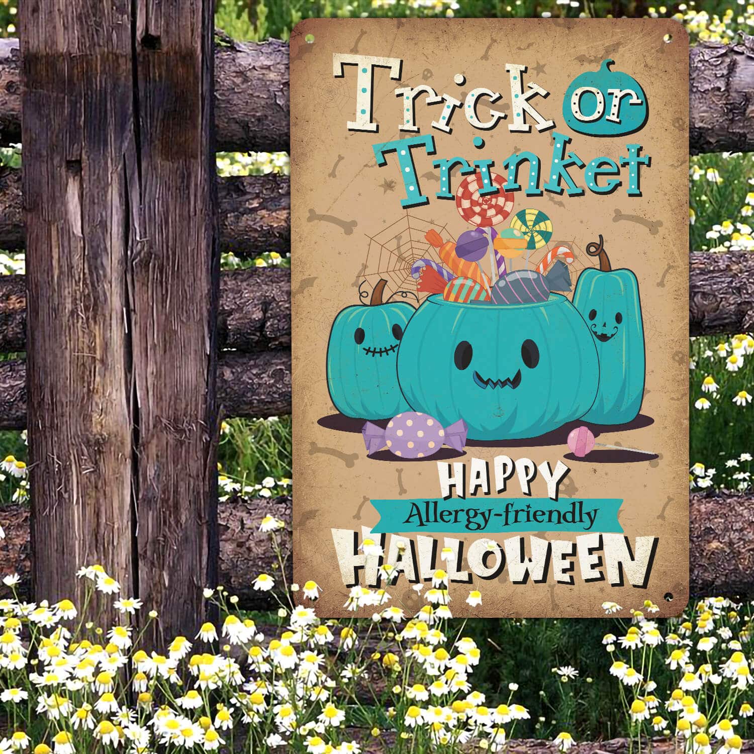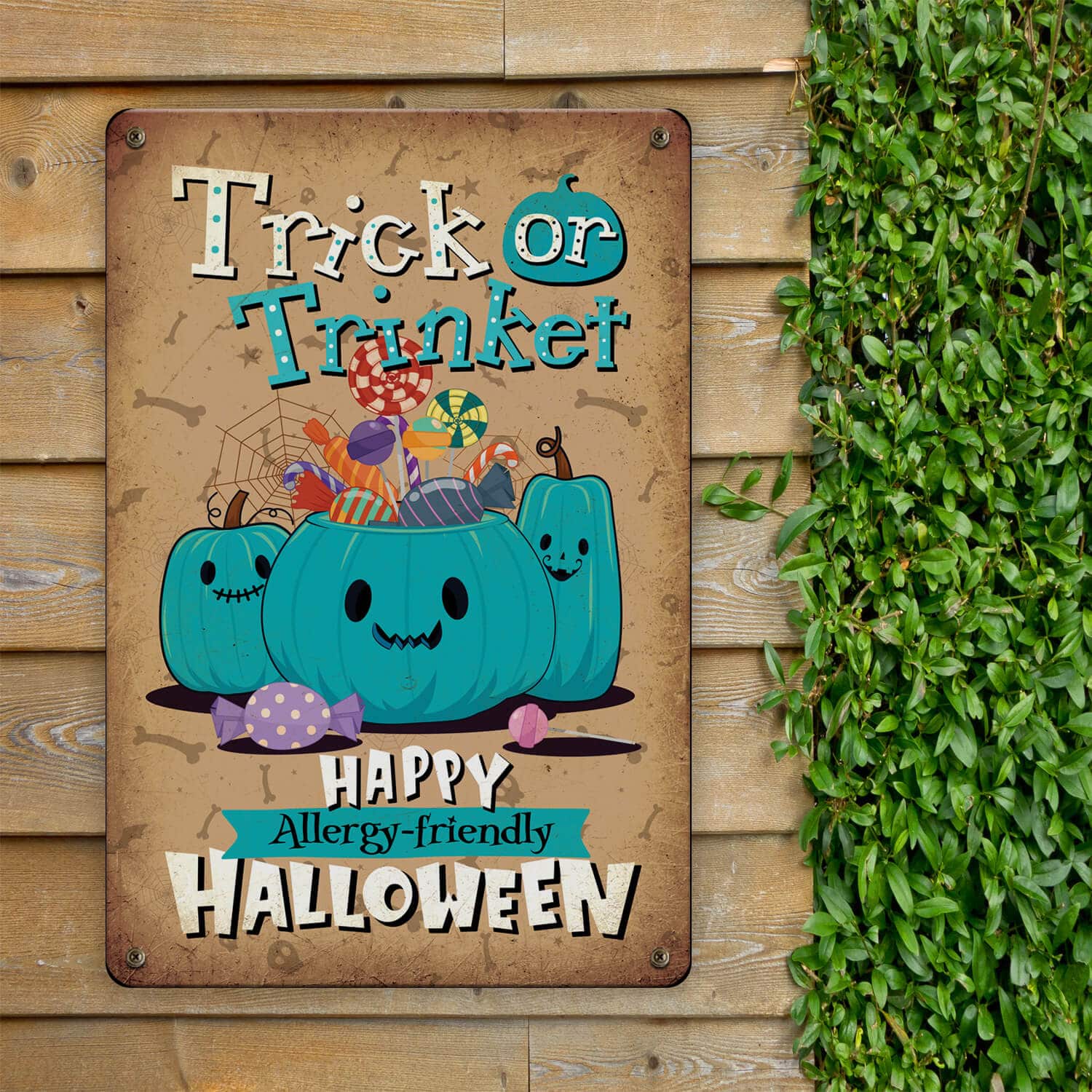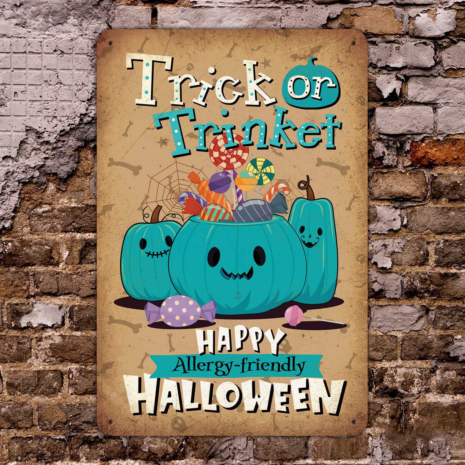 Let’s Shop Trick Or Trinket Happy Allergy-Friendly Halloween Metal Sign – Halloween Teal Pumpkin Home Decor!
