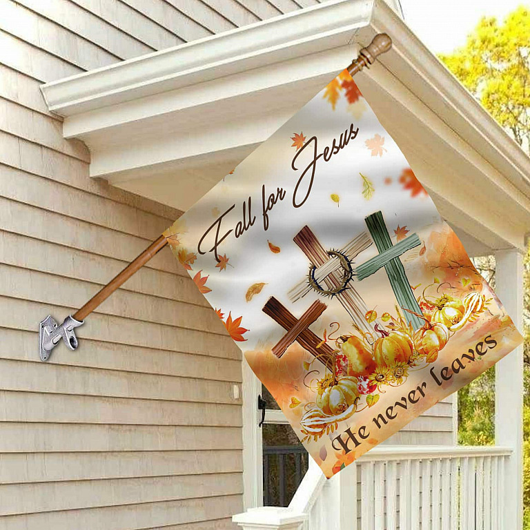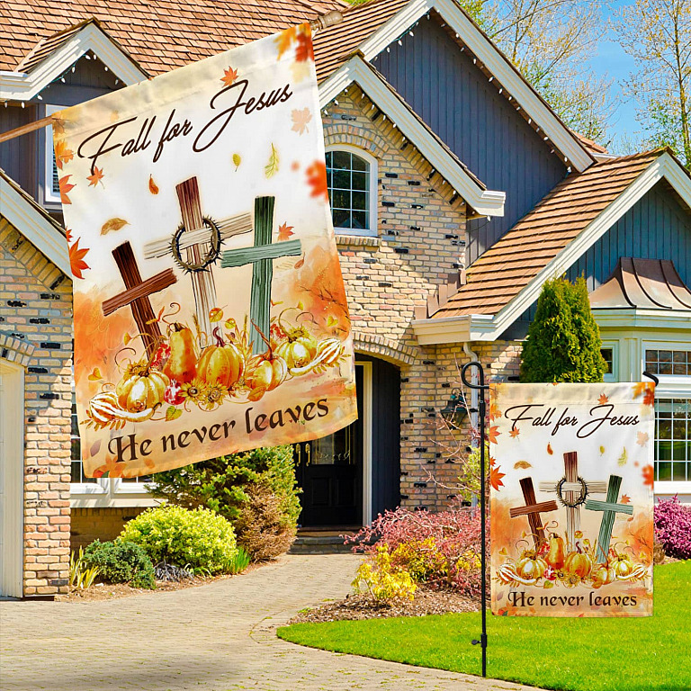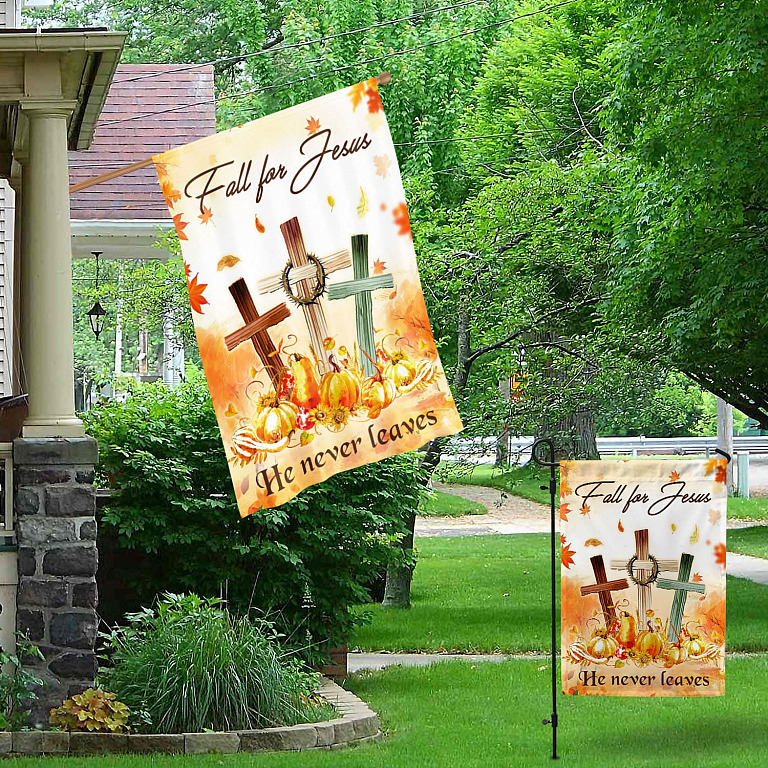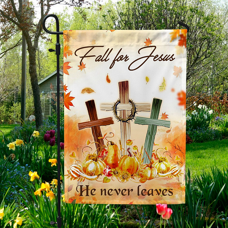 Let’s Shop Fall For Jesus For He Never Leaves Garden Flag – House Flag – Thanksgiving Flag!