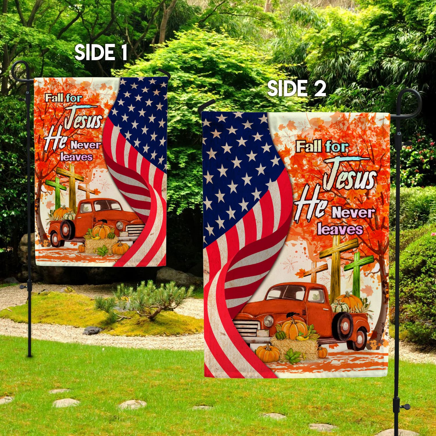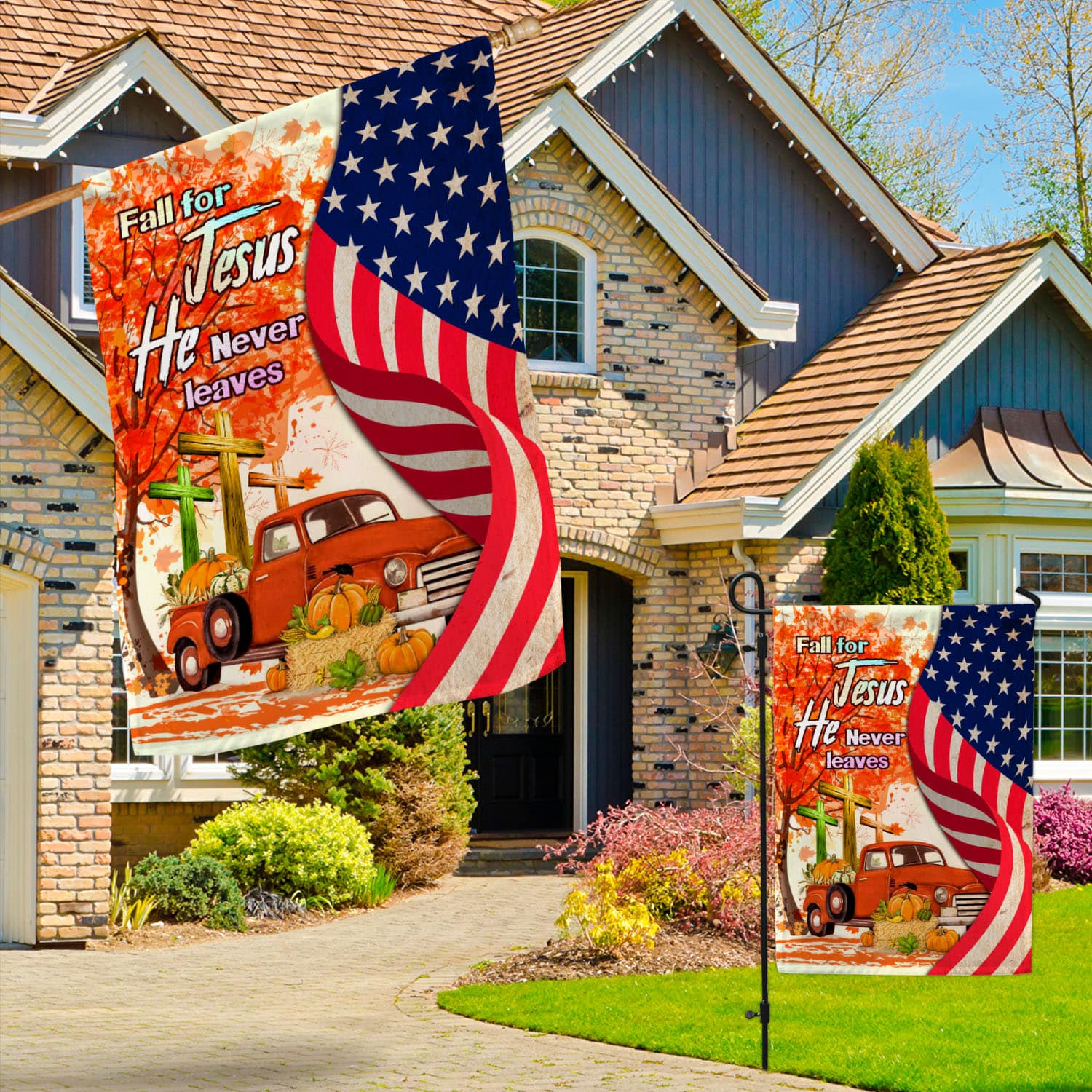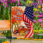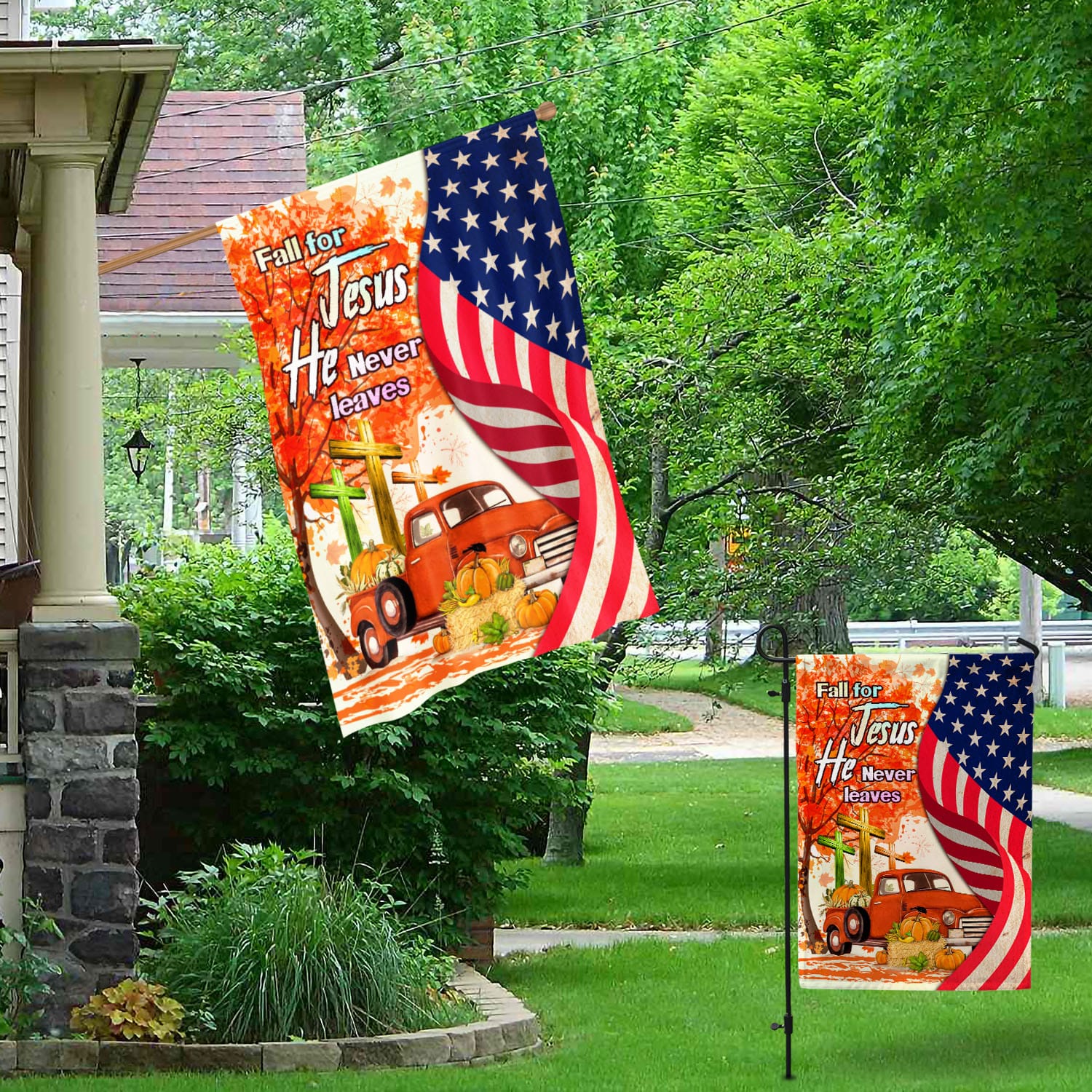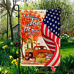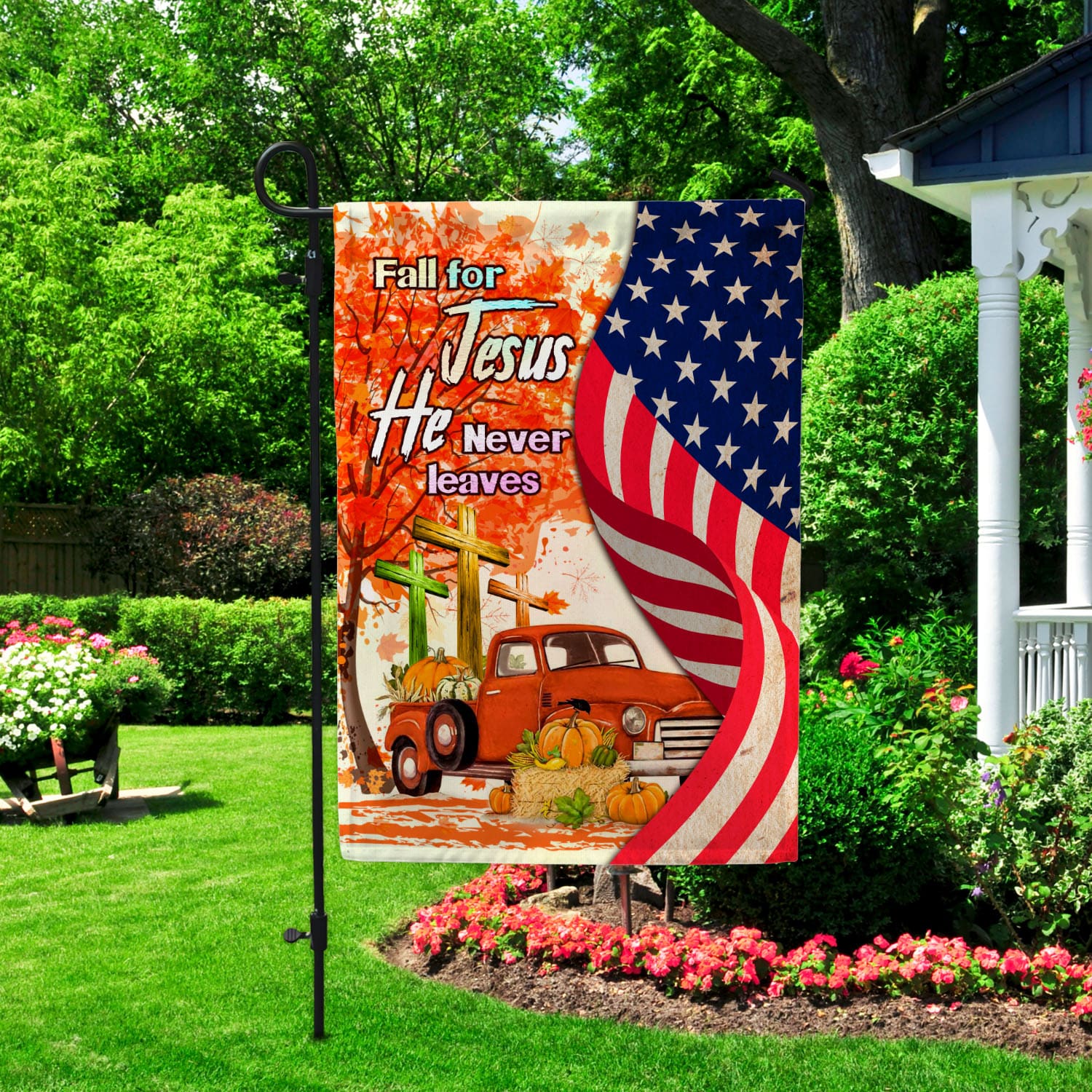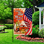 Let’s Shop Fall For Jesus He Never Leaves Red Truck Jesus Cross American Outdoor House Flag – Thanksgiving Home Garden Flag!