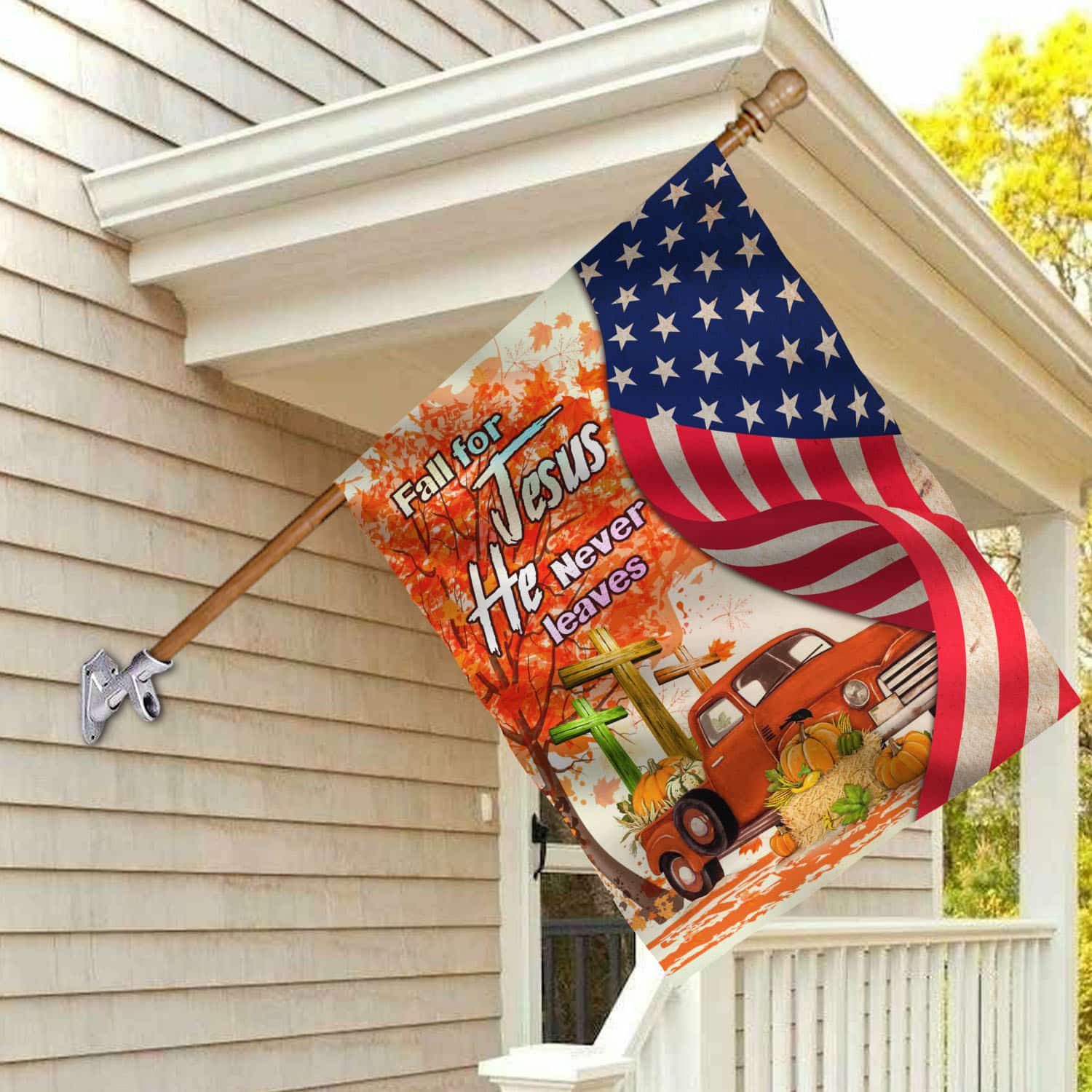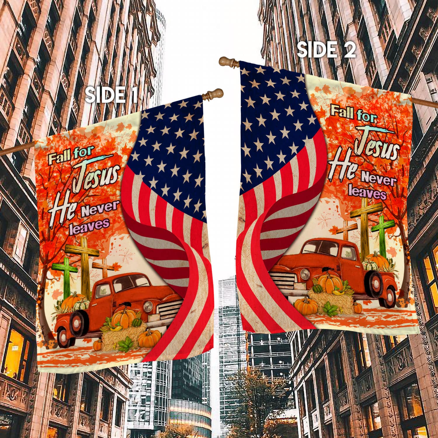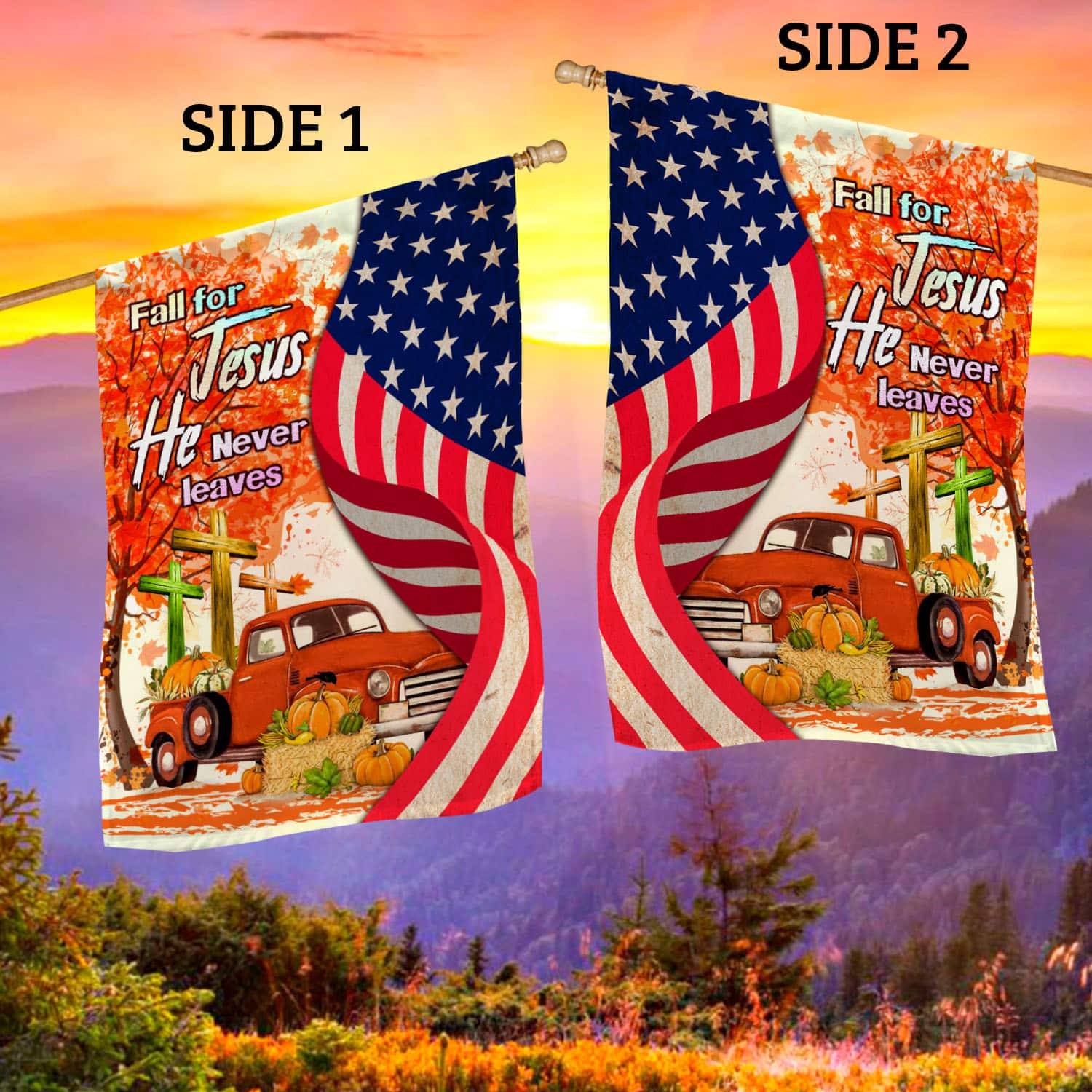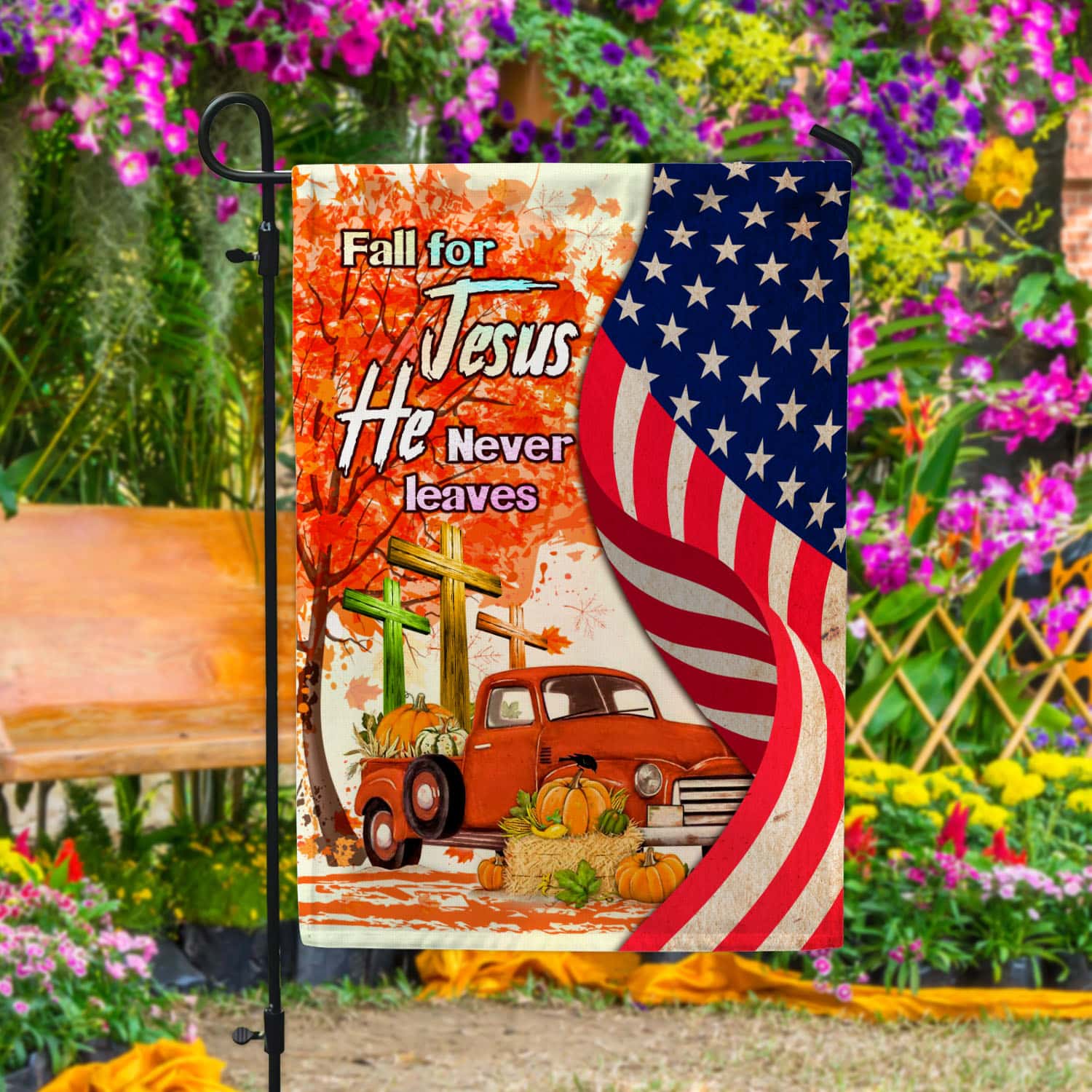 Let’s Shop Fall For Jesus He Never Leaves Red Truck Jesus Cross American Outdoor House Flag – Thanksgiving Home Garden Flag!