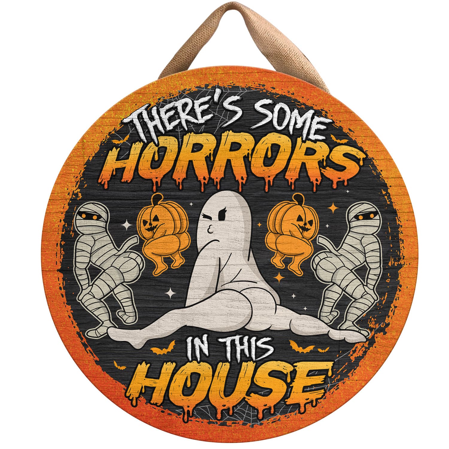 Let’s Shop There’s Some Horrors In This House Funny Halloween Circle Wooden Door Sign – Front Porch Sign!