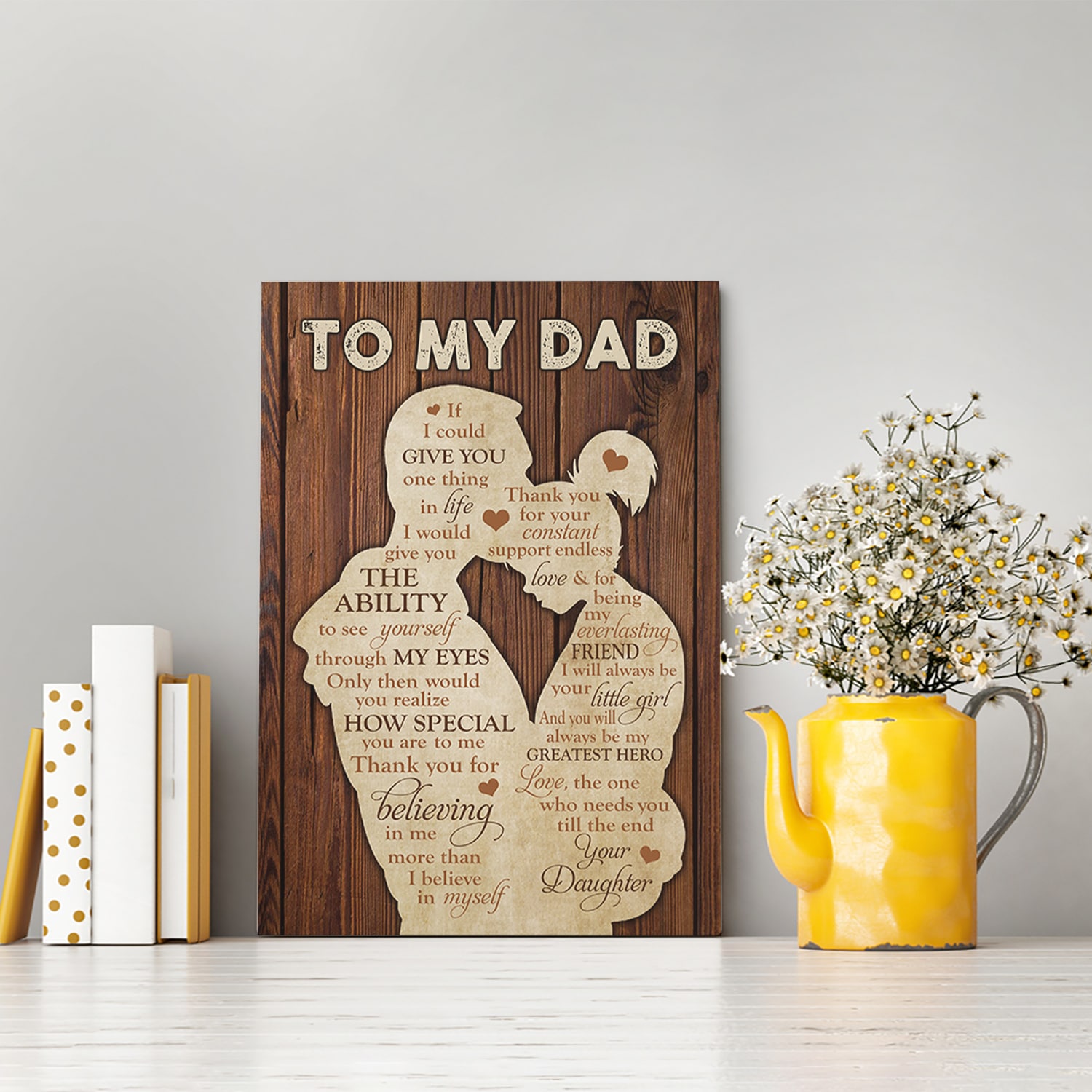 Are you spending too much time to find creative merchandise for you or suitable & special gifts for your mommy, your daddy, your son, your daughter, your children, your friends or someone you love? The struggle is over because we have various Father Daughter Canvas, Father and Daughter Silhouette, Father Daughter Wall Art, Silhouette Father Daughter Canvas, to My Dad Canvas from Daughter which will make perfect presents for your beloveds. In order to make your present stand out, we have created lots of unique and awesome customized photo gifts & personalized designs.