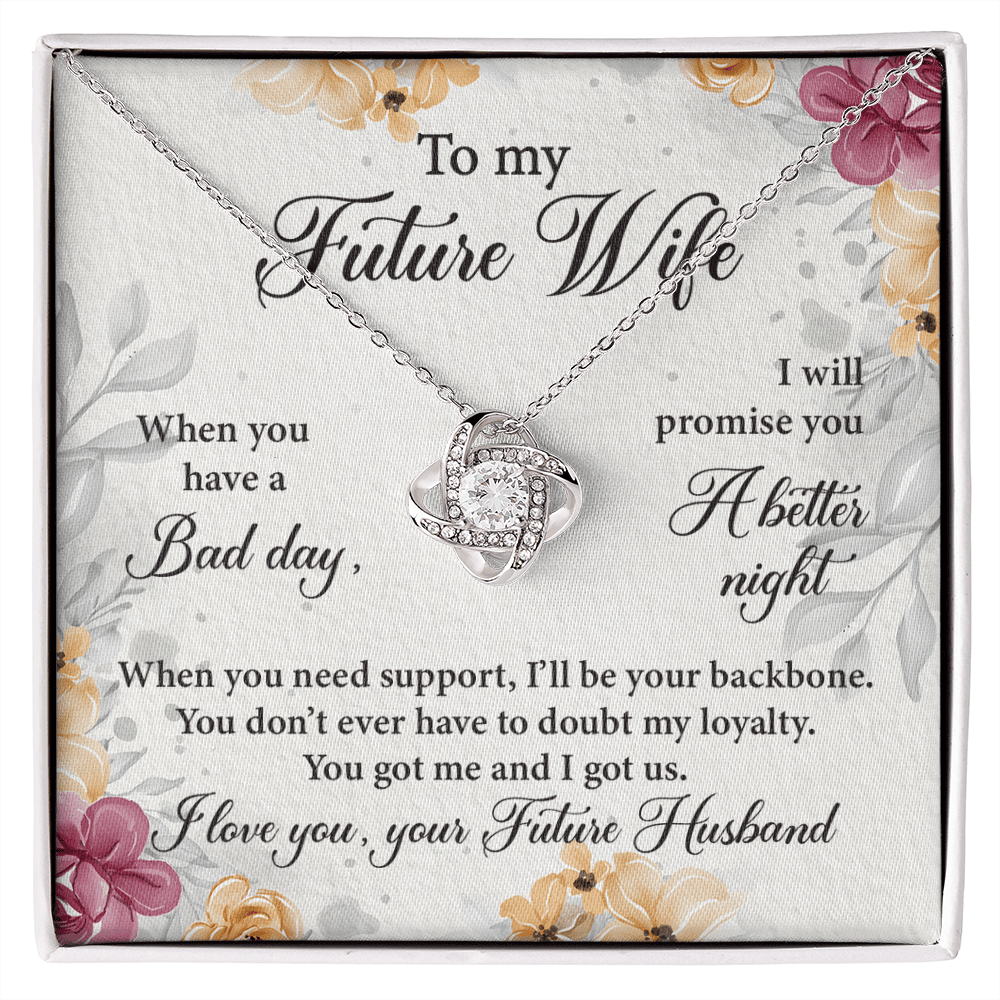 Are you spending too much time to find creative merchandise for you or suitable & special gifts for your mommy, your daddy, your son, your daughter, your children, your friends or someone you love? The struggle is over because we have various To My Future Wife Necklace, to My Future Wife Message Card, Future Wife Gifts, Necklace for Future Wife, Christmas Gifts, Gifts for Wife, to My Wife Pendant Necklace, Wife Necklace, to My Future Wife Alurring Love Knot Necklace which will make perfect presents for your beloveds. In order to make your present stand out, we have created lots of unique and awesome customized photo gifts & personalized designs.