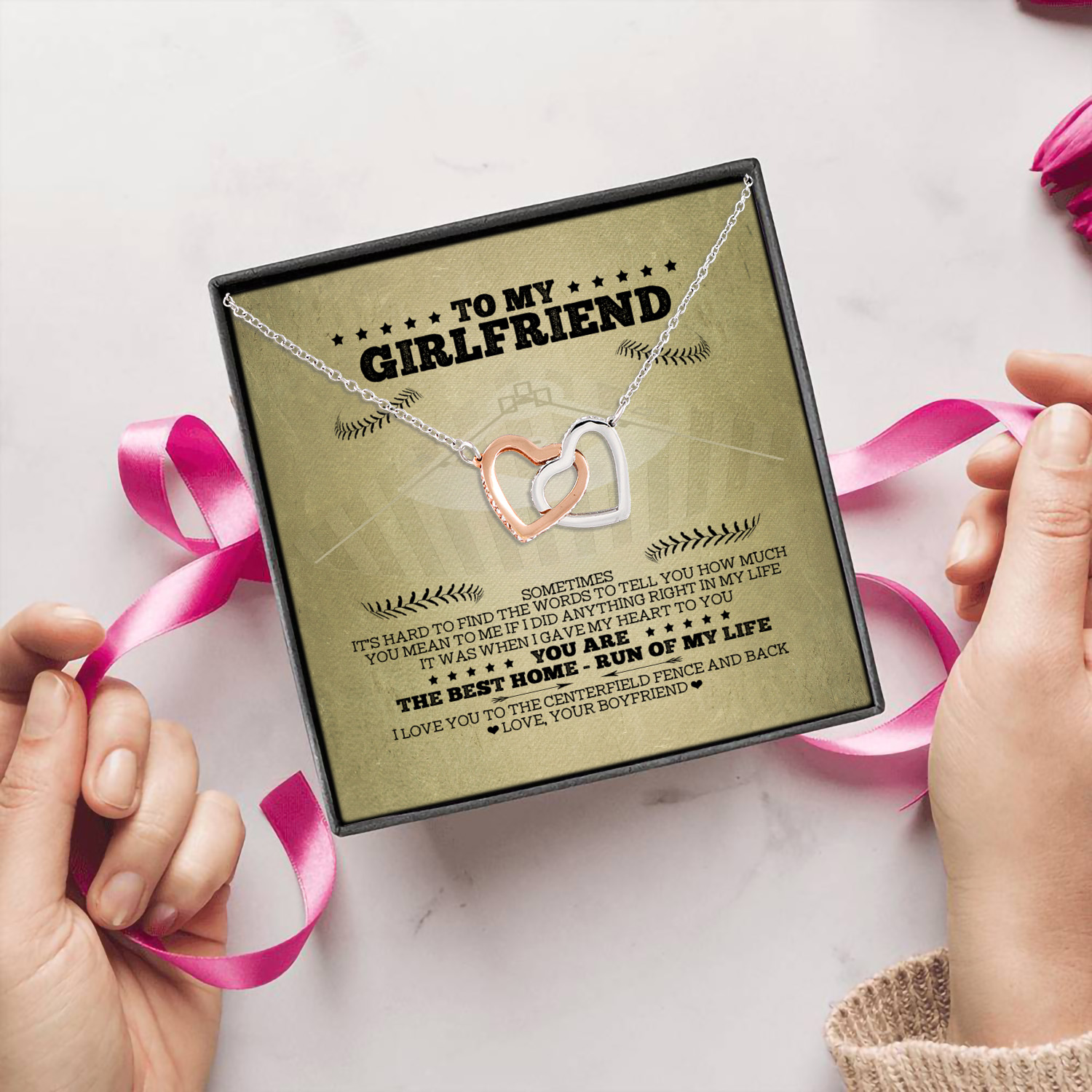 Let’s Shop To My Girlfriend You Are The Best Home-Run Of My Life Baseball Couple Quote Card Interlocking Hearts Necklace!