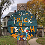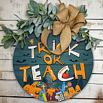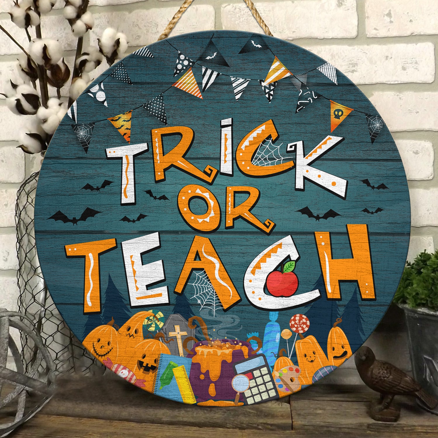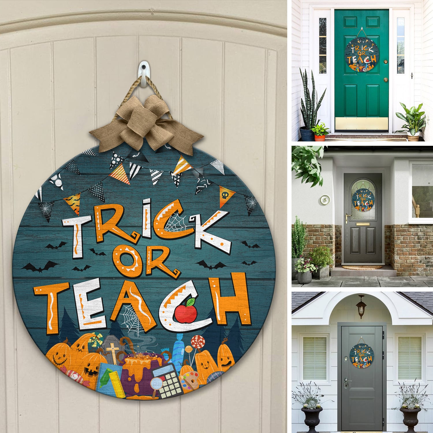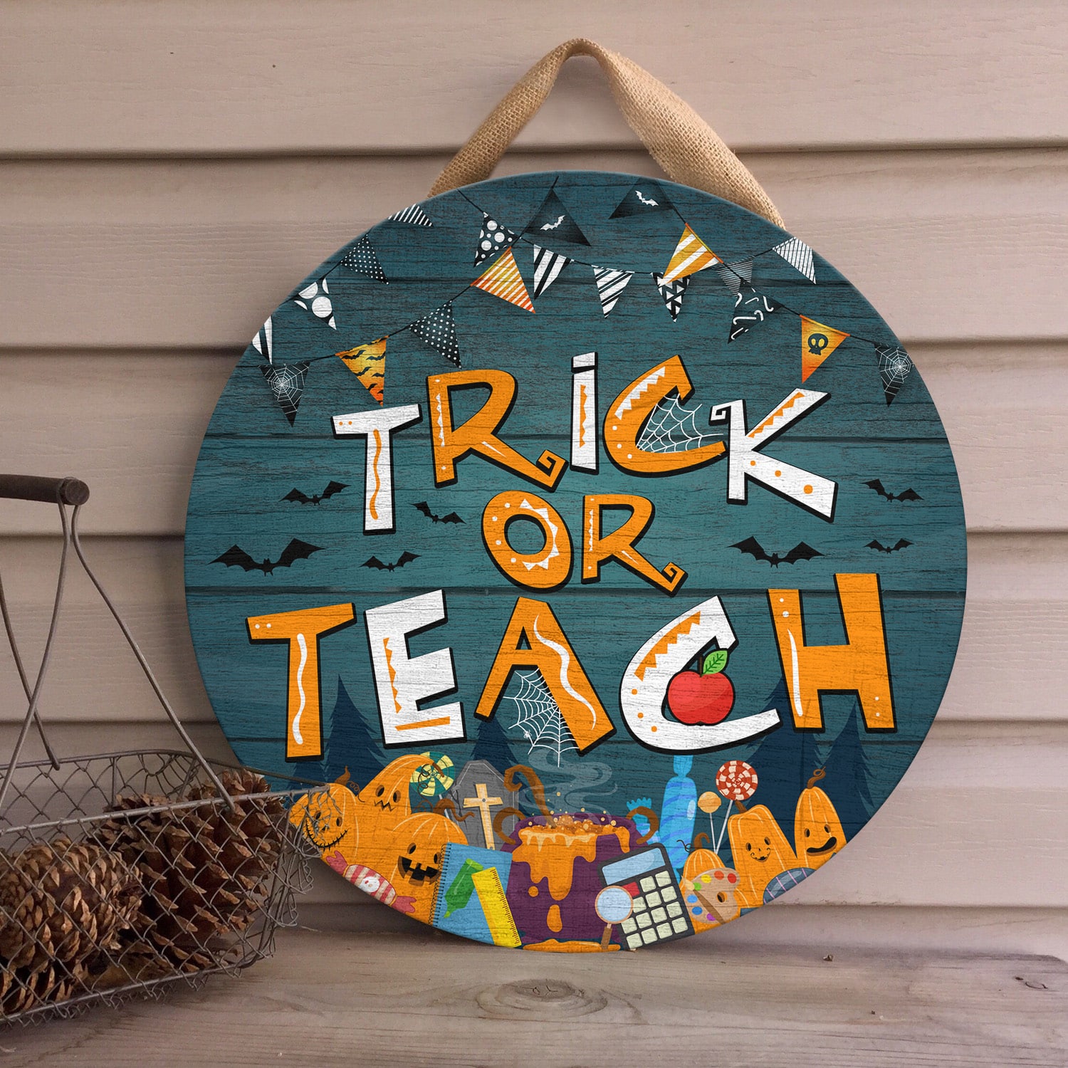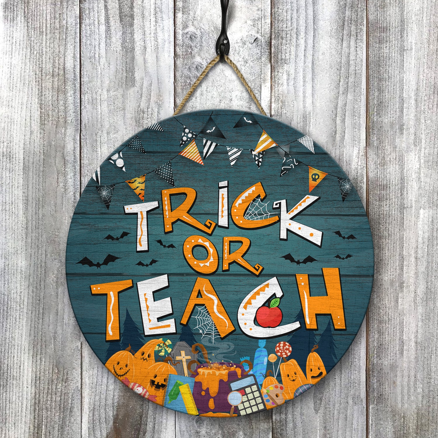 Let’s Shop Trick Or Teach Halloween Classroom Decorative Circle Wooden Door Sign – Funny Halloween Teacher Gift!