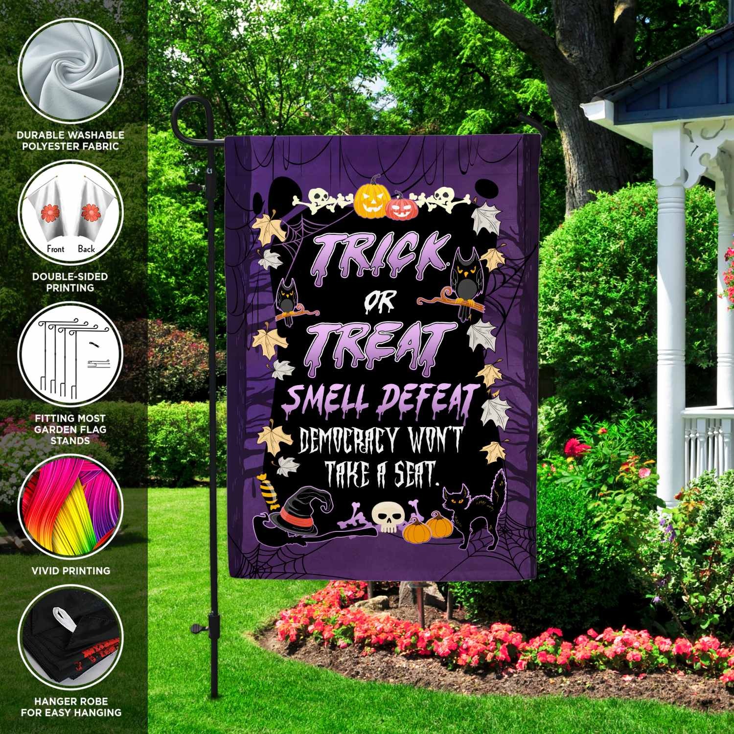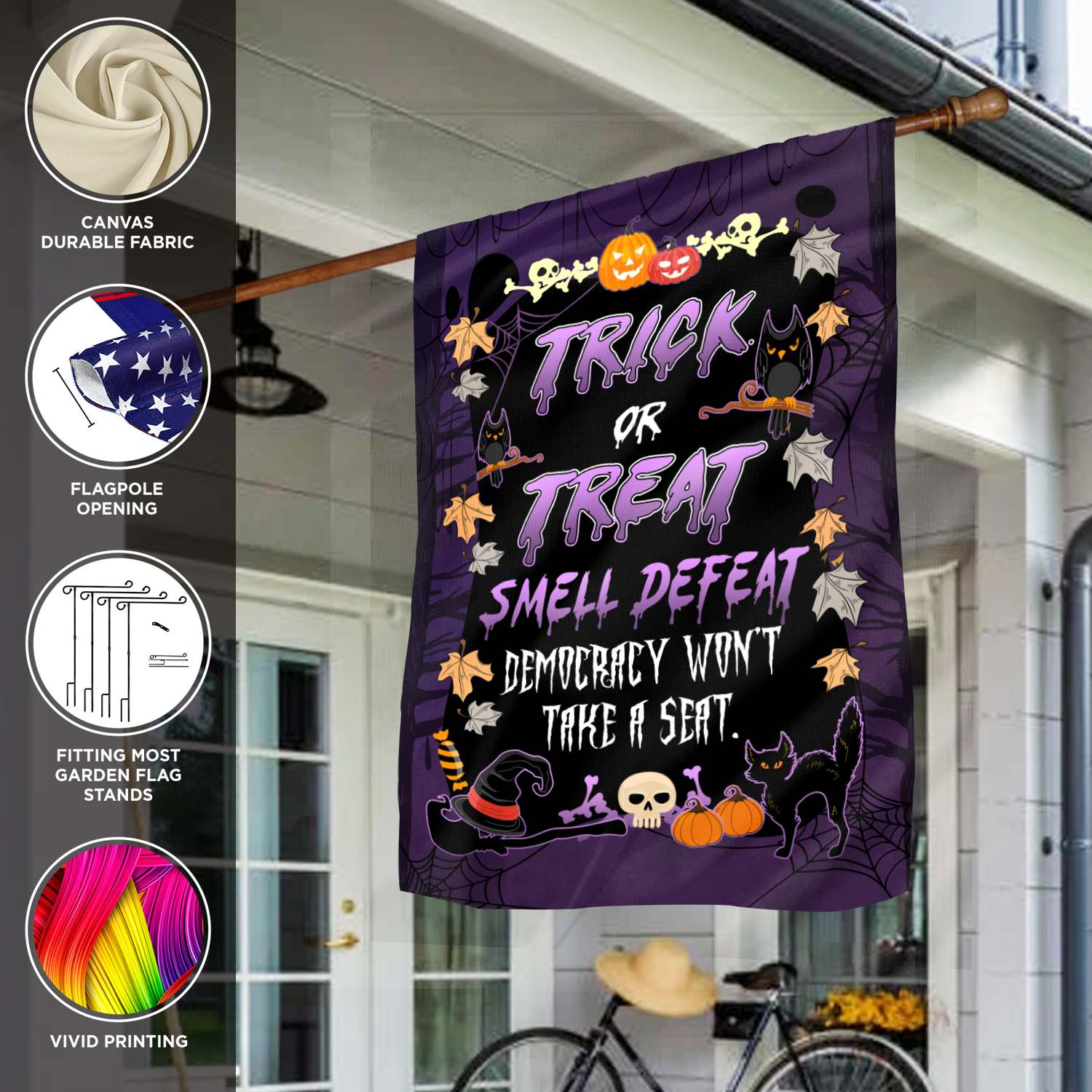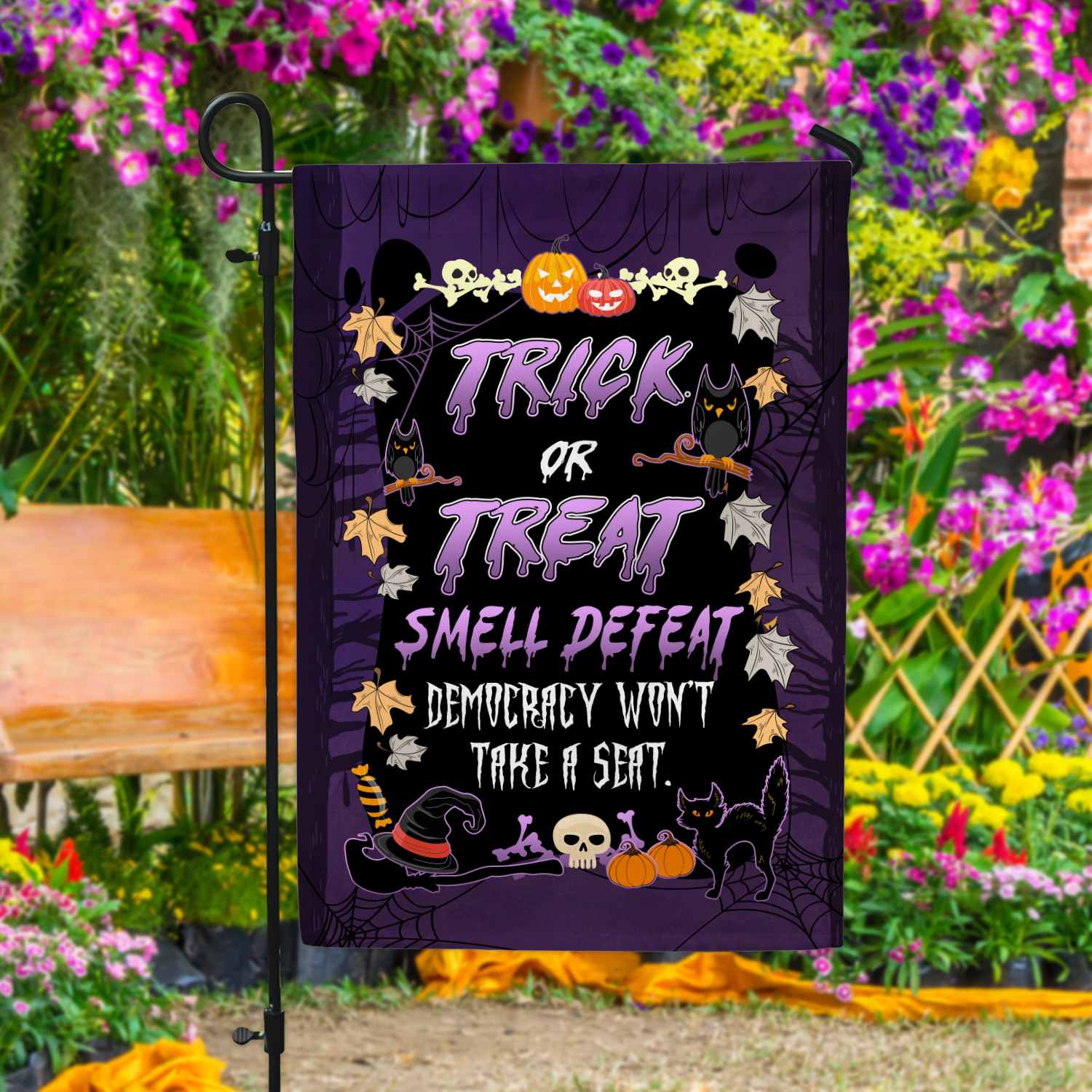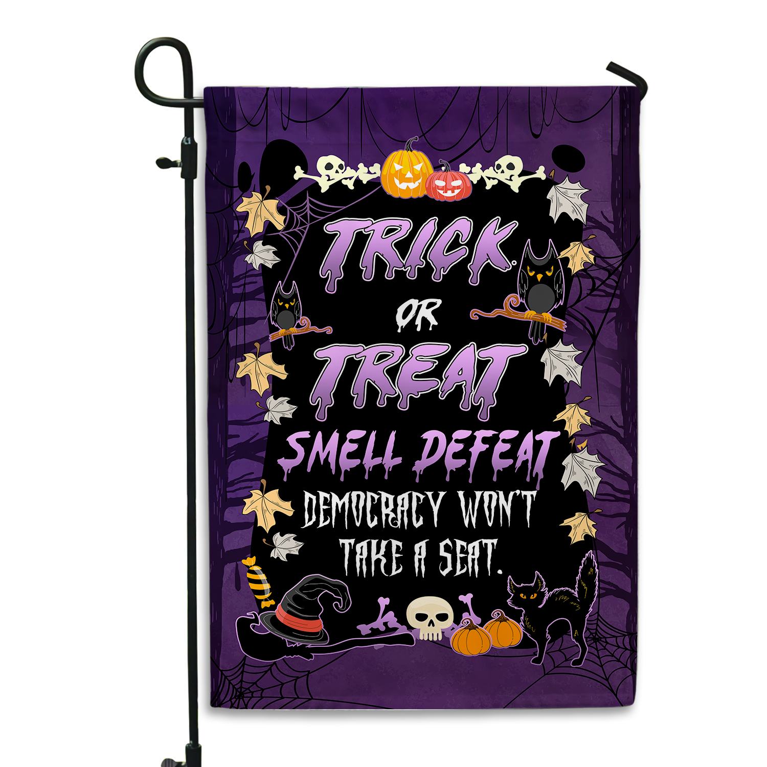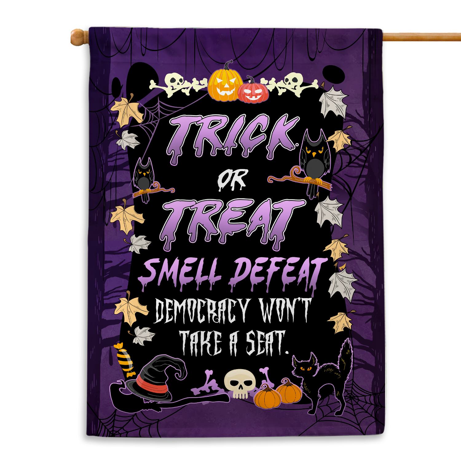 Let’s Shop Trick or Treat Smell Defeat Democracy Won’t Take A Seat Funny Political Halloween Outdoor House Flag – Home Garden Flag!