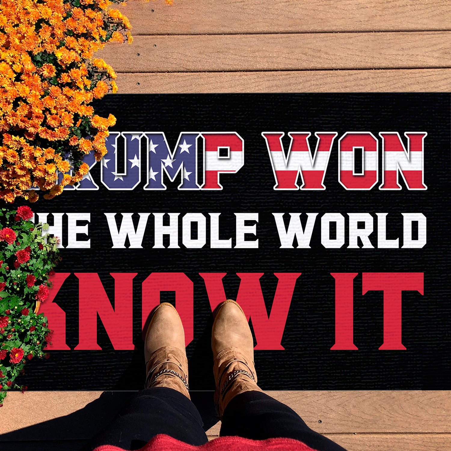 Are you spending too much time to find creative merchandise for you or suitable & special gifts for your mommy, your daddy, your son, your daughter, your children, your friends or someone you love? The struggle is over because we have various Trump Won Democrats Cheated Doormat, Trump Will Be Back 2024 Doormat, American Trump Doormat, Trump Patriotic Doormat, Make America Great Again Doormat, Trump Won Flag, Trump Won Shirt, I Voted for Trump Doormat, Trump Supporter Doormat, Trump Won the Whole World Knows It Doormat, Trump Won Doormat, the Whole World Knows It Doormat, Republican Doormats, Anti Liberals Doormat which will make perfect presents for your beloveds. In order to make your present stand out, we have created lots of unique and awesome customized photo gifts & personalized designs.
