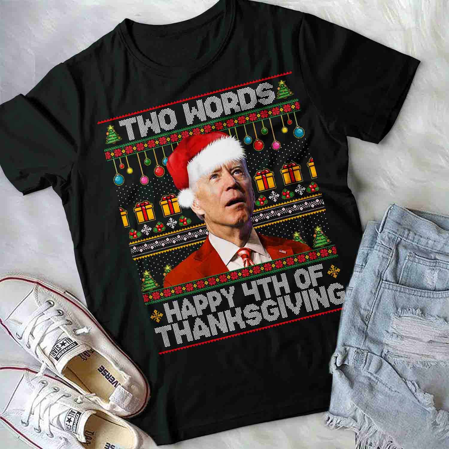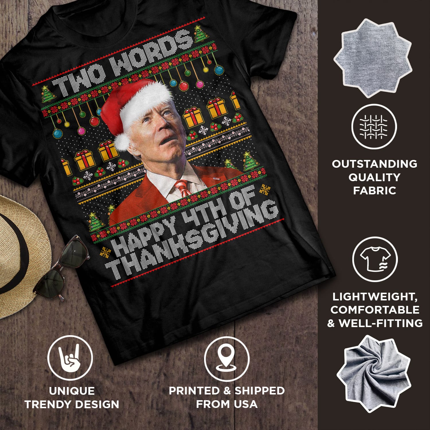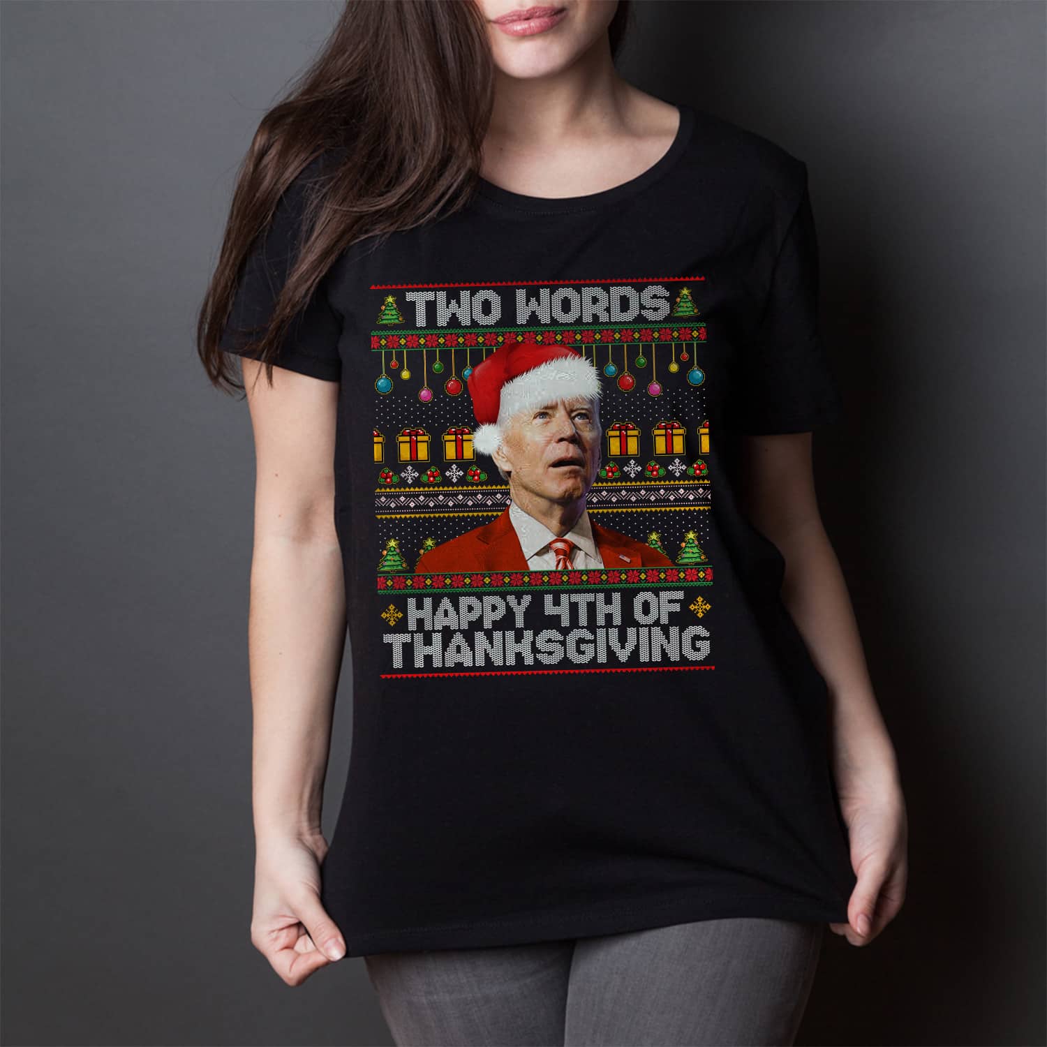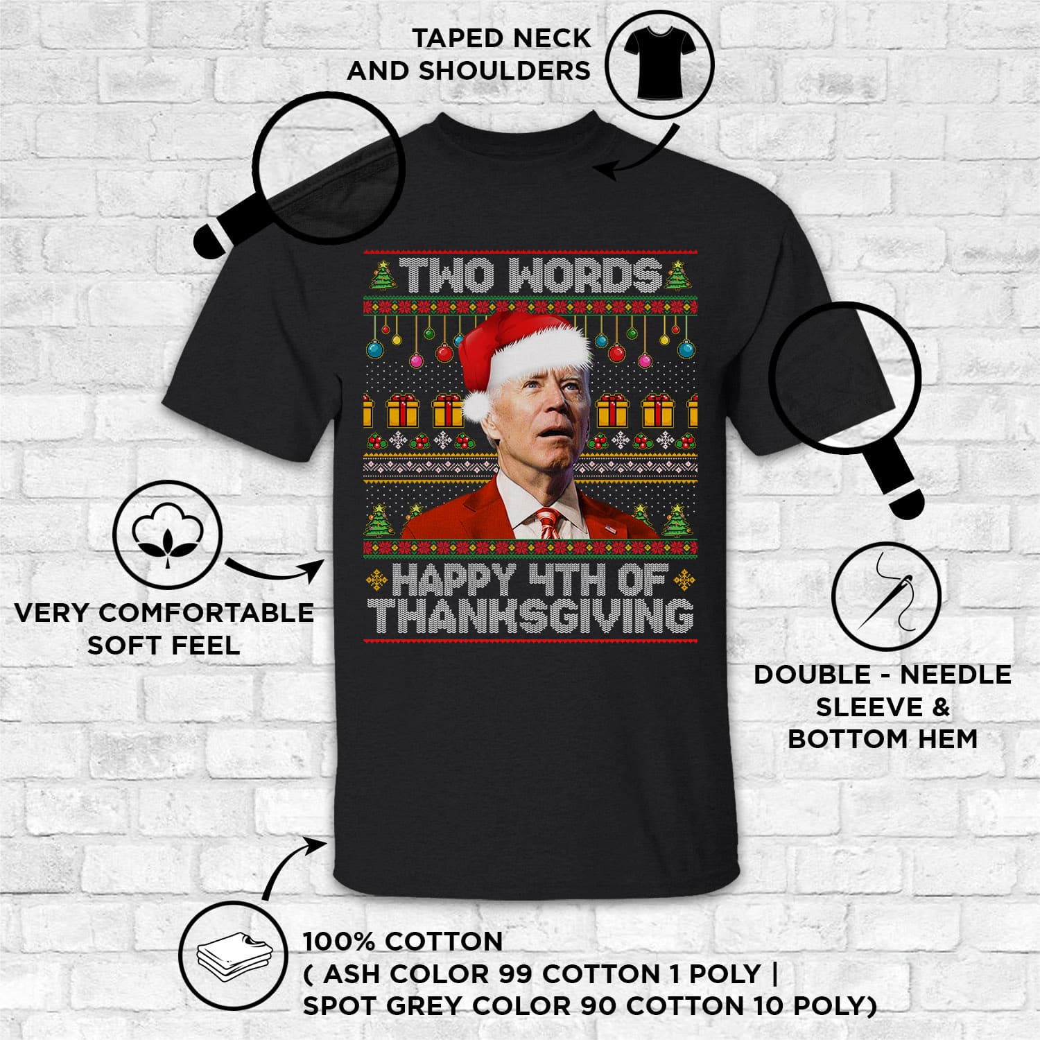Two Words Happy 4th Of Thanksgiving Funny Biden Ugly Christmas T-Shirt