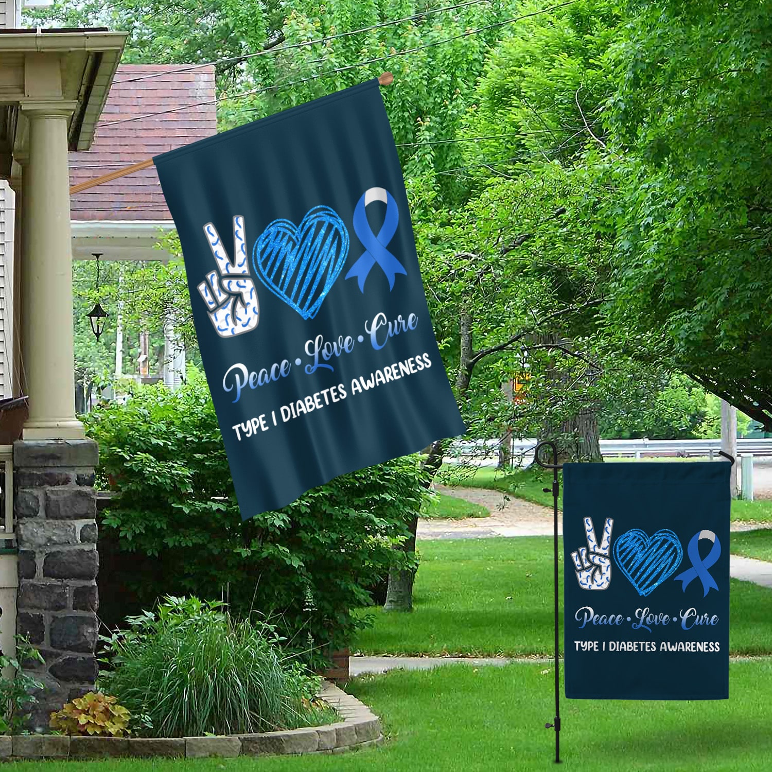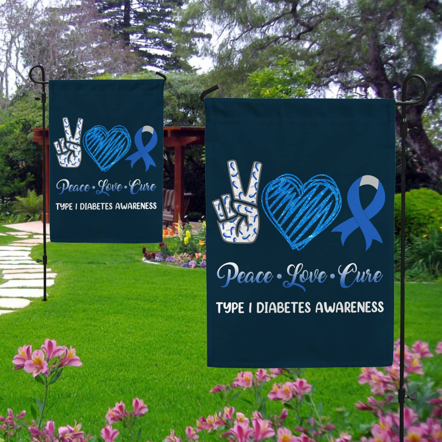 Let’s Shop Peace Love Cure Type 1 Diabetes Awareness Garden Flag – House Flag – Wall Flag!