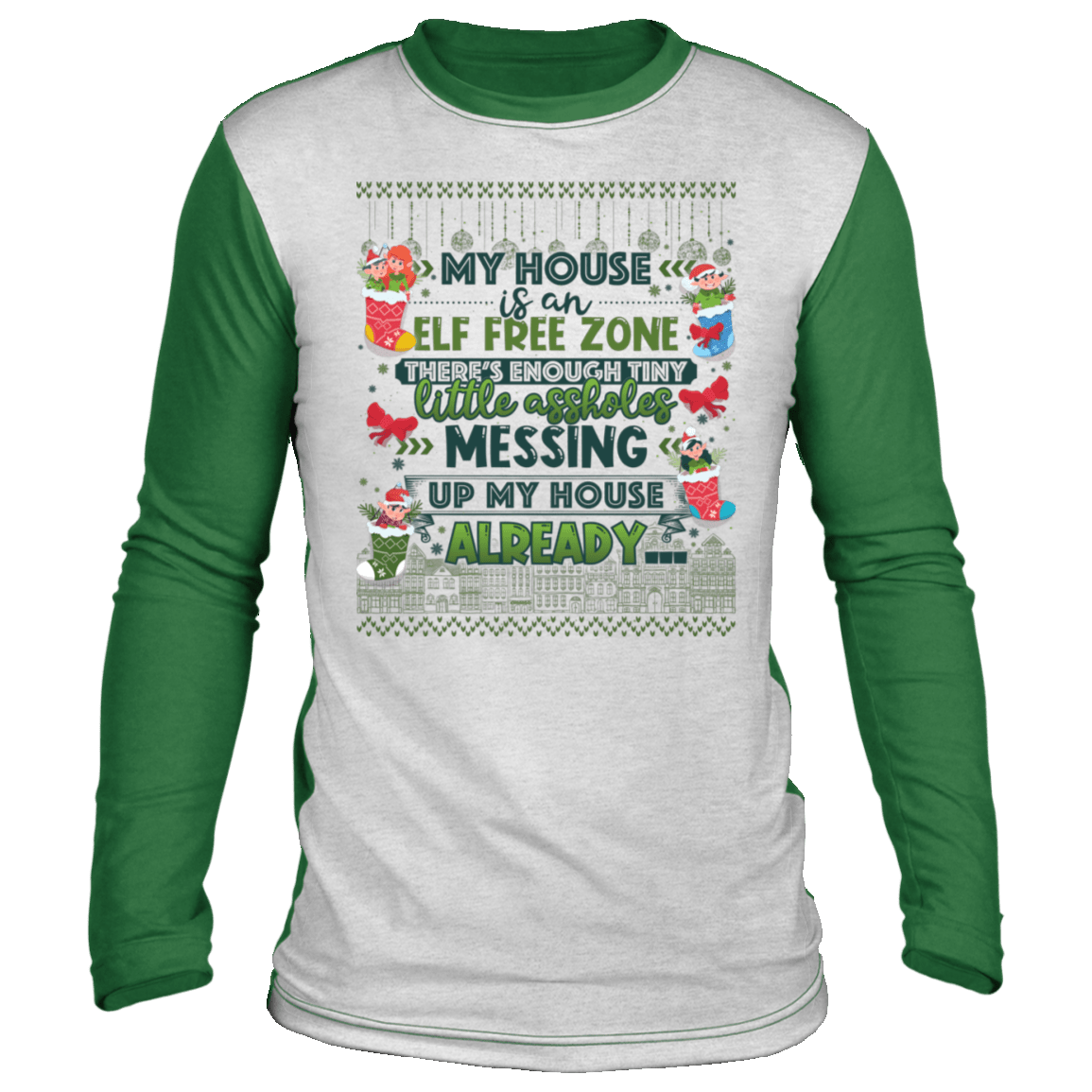 Shop My House Is An ELF Free Zone There’s Enough Tiny Little Assholes Ugly Christmas Sweater Long Sleeve.