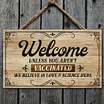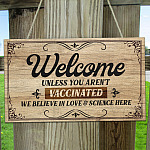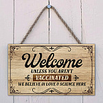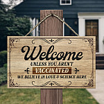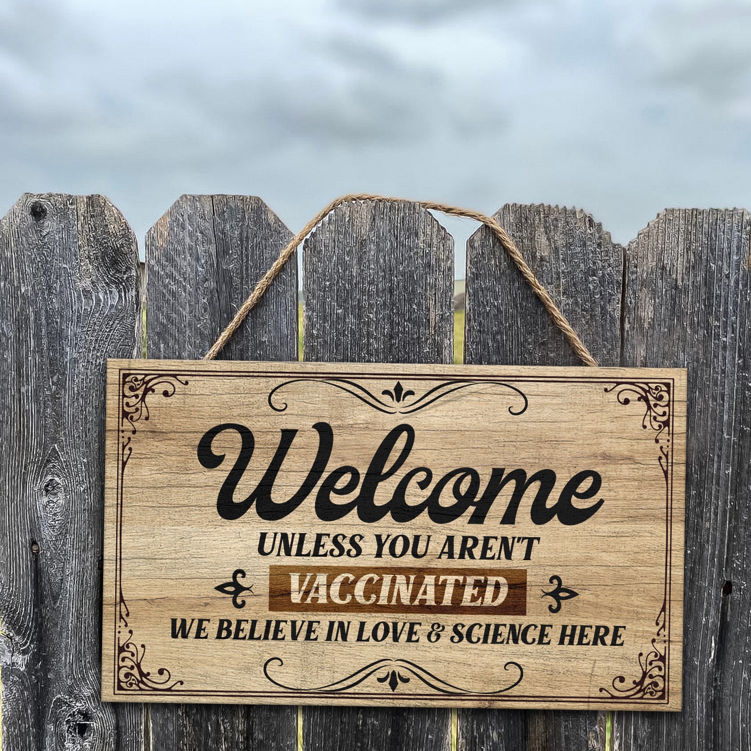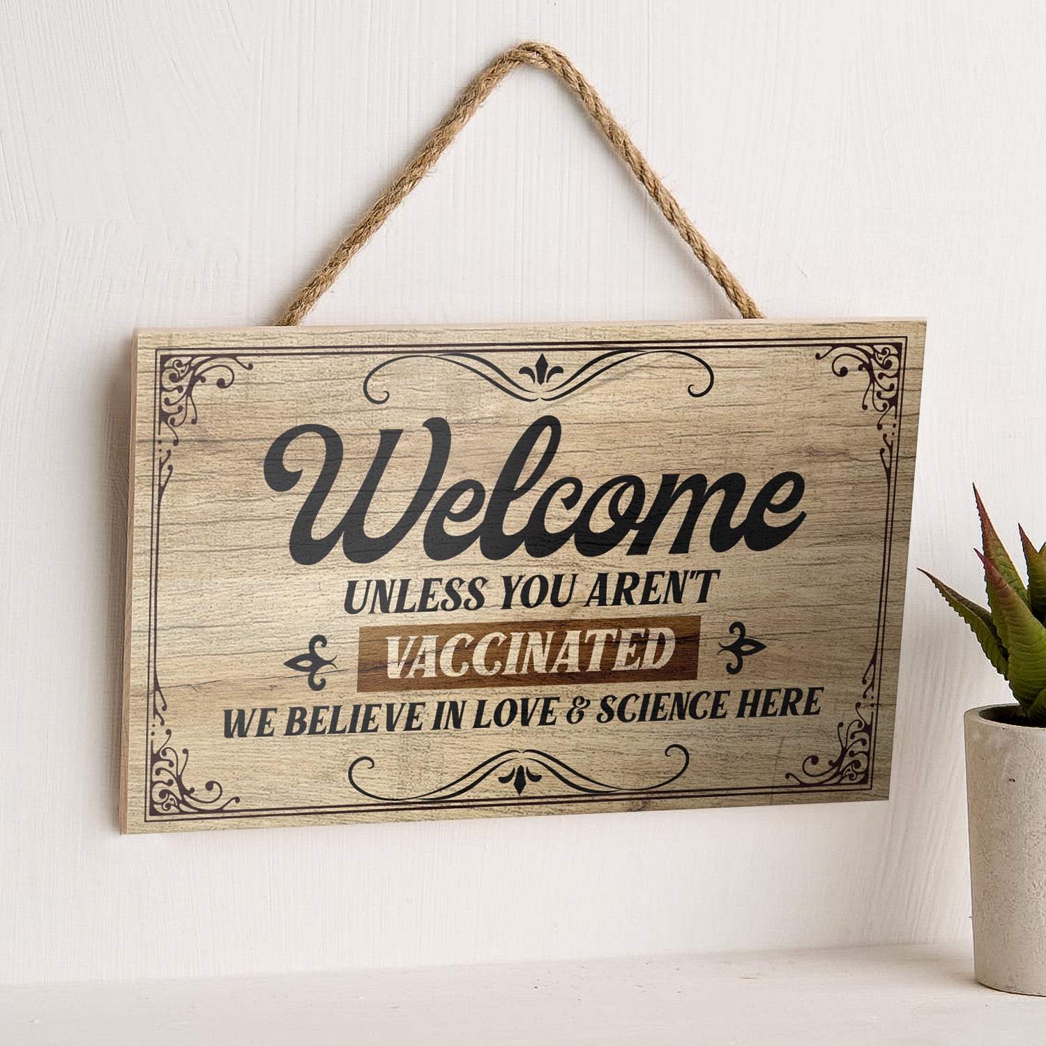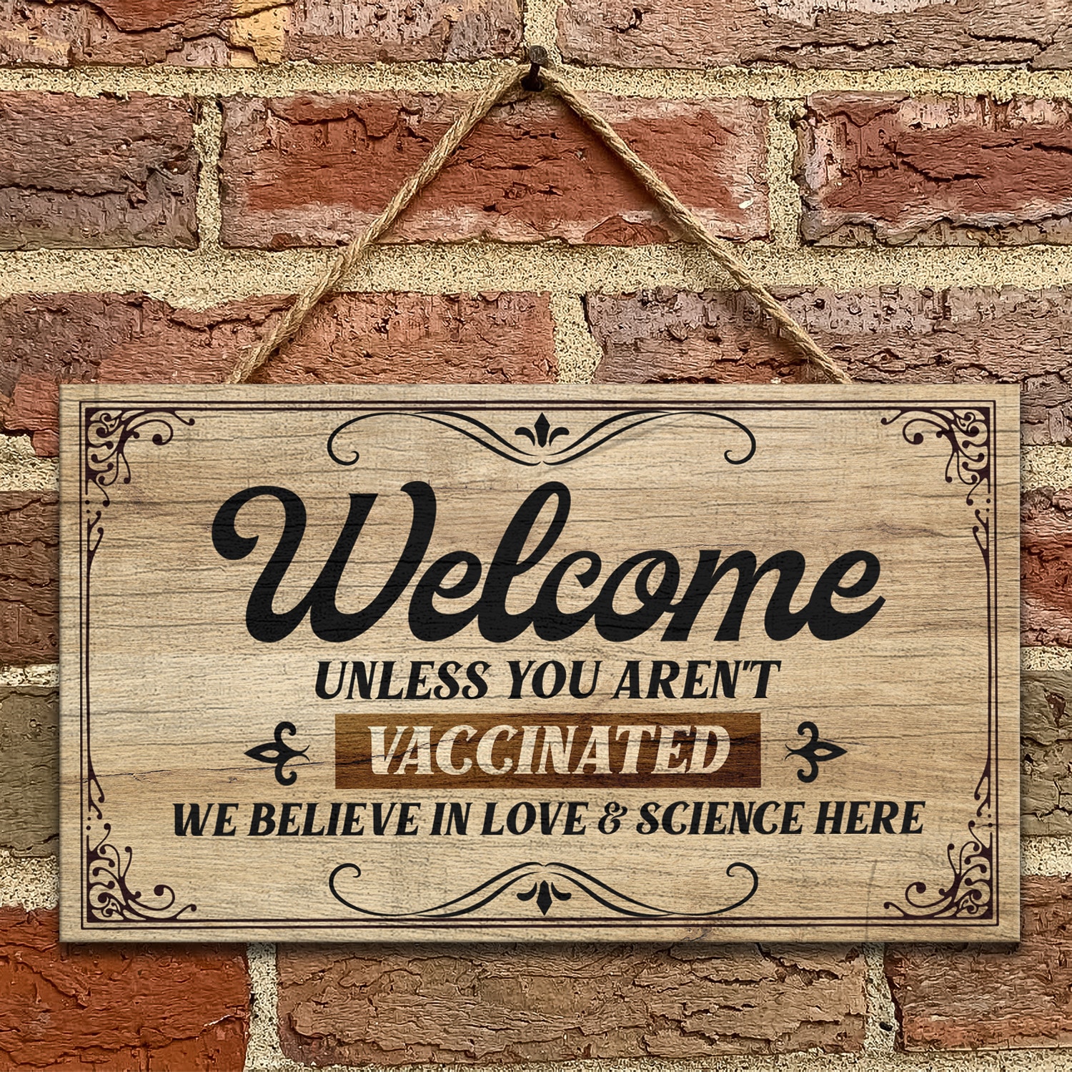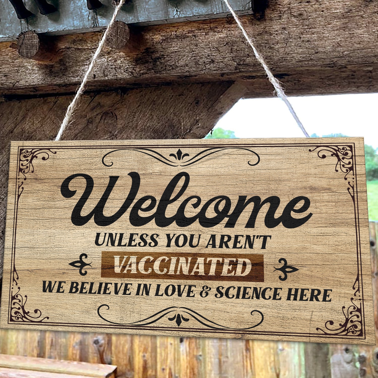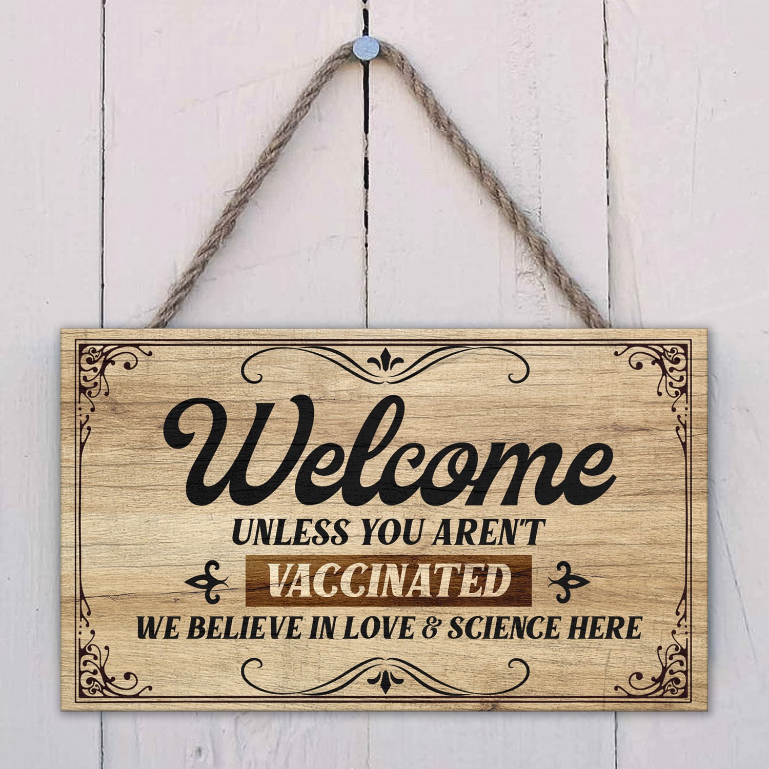Let’s Shop Welcome Unless You Aren’t Vaccinated We Believe In Love And Science Here Decorative Rectangle Wooden Door Sign!