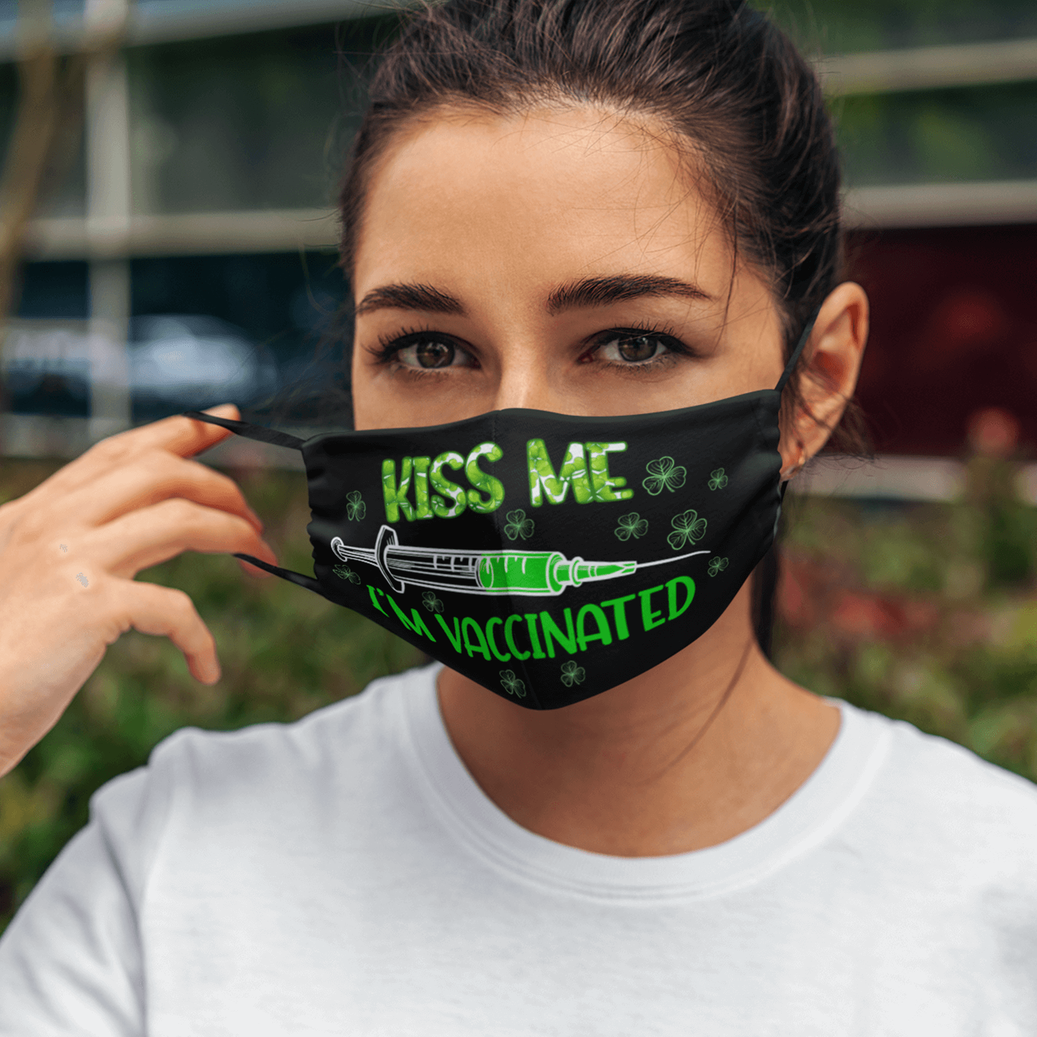 Let’s Shop Kiss Me I’m Vaccinated Saint Patrick’s Day Clover Shamrock Reusable Custom Printed Cloth Face Mask Cover!