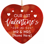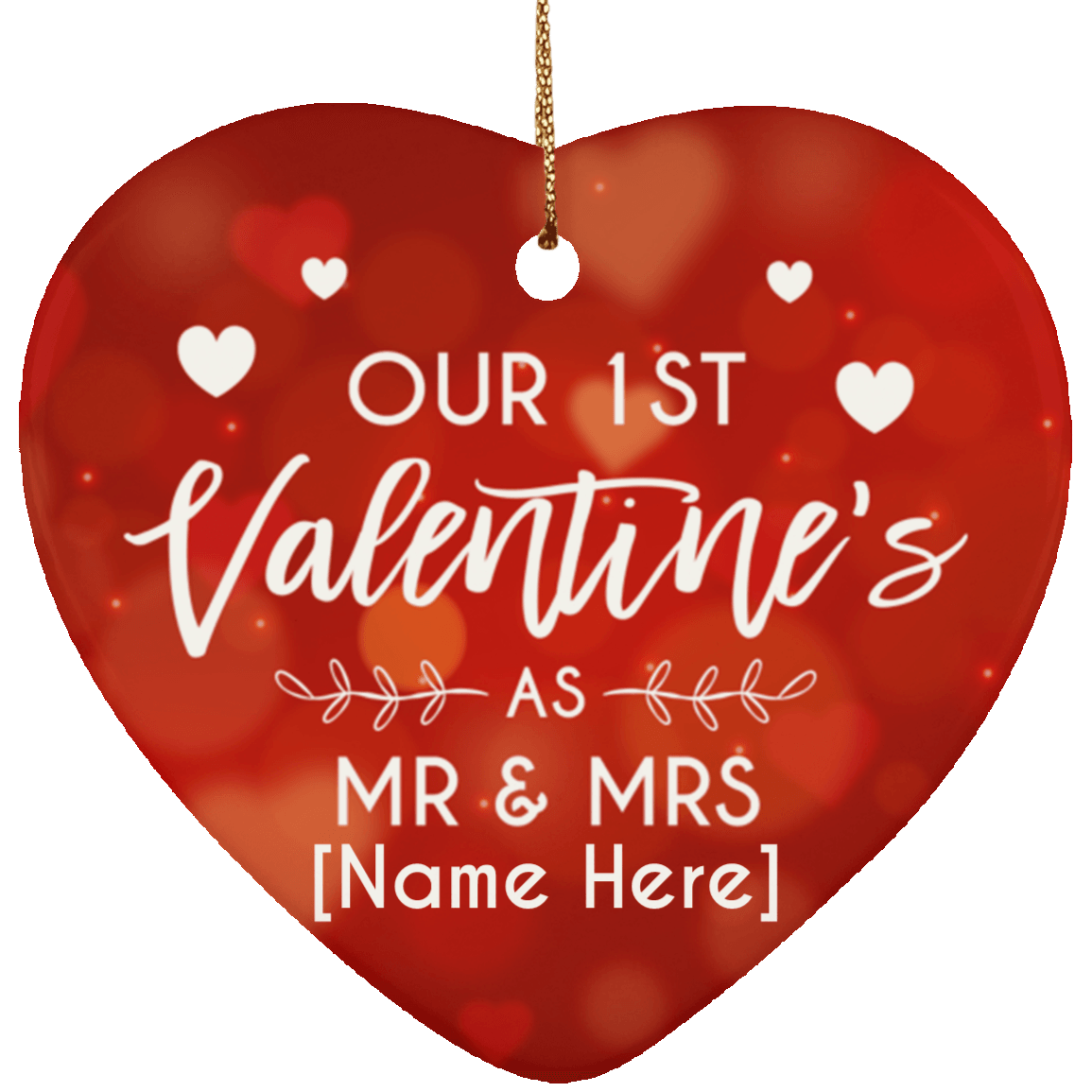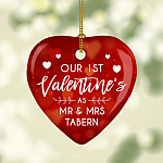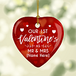 Shop Personalized Our First Valentine’s As Mr and Mrs Ornament Keepsake – Flat Heart Porcelain Ceramic Ornament.