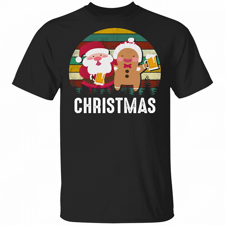 Vintage Santa Claus And Gingerbread Drinking Beer Ugly Christmas T-Shirt