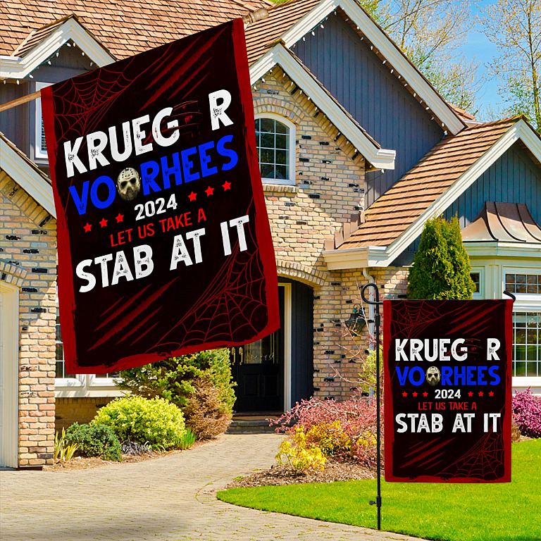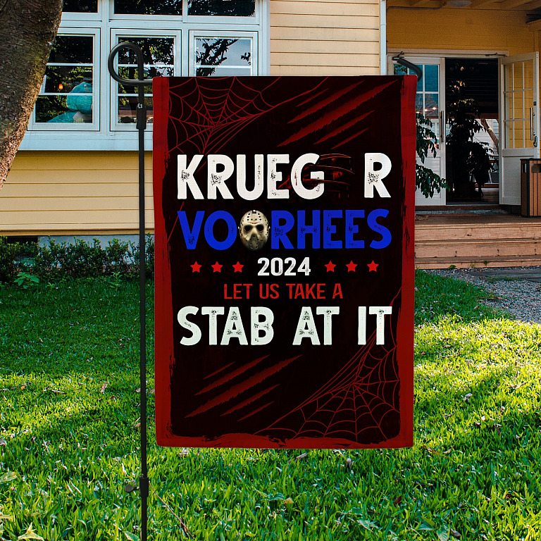 Let’s Shop Vote Freddy Halloween Krueger Vooheers 2024 Election Decorative Flag – Scary Halloween Krueger Voorhees Let Us Take A Stab At It Flag!